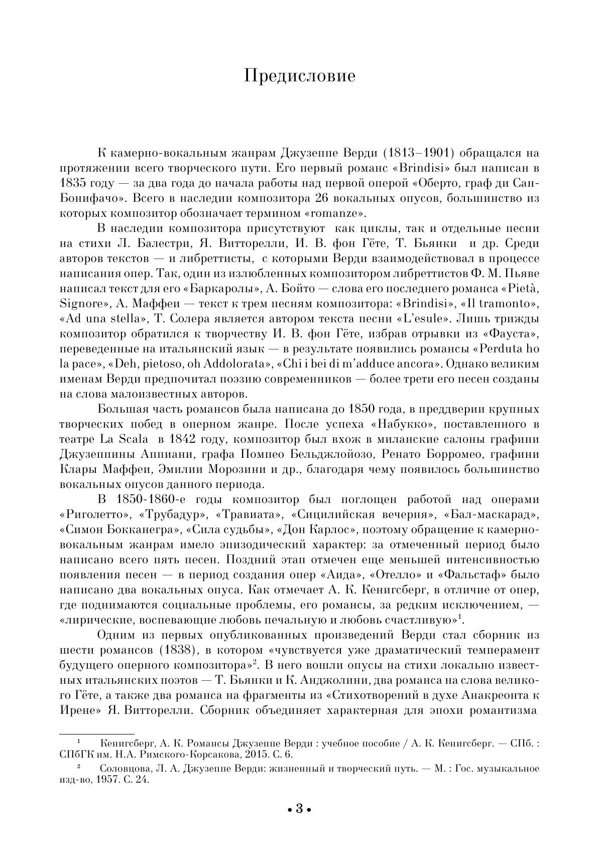 К камерно-вокальным жанрам Джузеппе Верди (1813-1901) обращался на протяжении всего творческого пути. Большинство опусов обозначены термином «romanze». В наследии композитора присутствуют как циклы, так и отдельные песни. В издание вошли сочинения на стихи Л. Балестри, Я. Витторелли, И. В. Гёте. Т. Бьянки и др. Сборник адресован студентам вокальных отделений музыкальных училищ и вузов, профессиональным исполнителям. Giuseppe Verdi (1813–1901) turned to chamber vocal genres throughout his entire career. Most of the opuses are called “romanze”. The composer's legacy includes both cycles and separate songs. The edition includes works to lyrics by L. Balestri, J. Vittorelli, J. W. Goethe, T. Bianchi and others. The collection is addressed to students of vocal departments of music colleges and higher schools, professional performers.