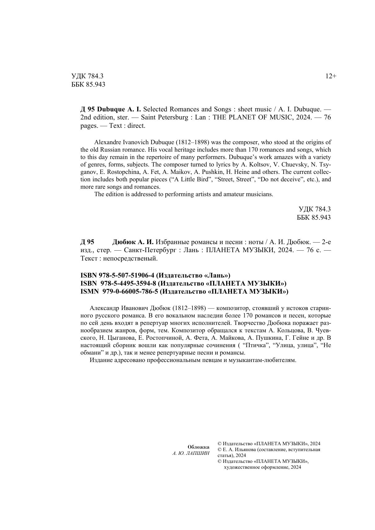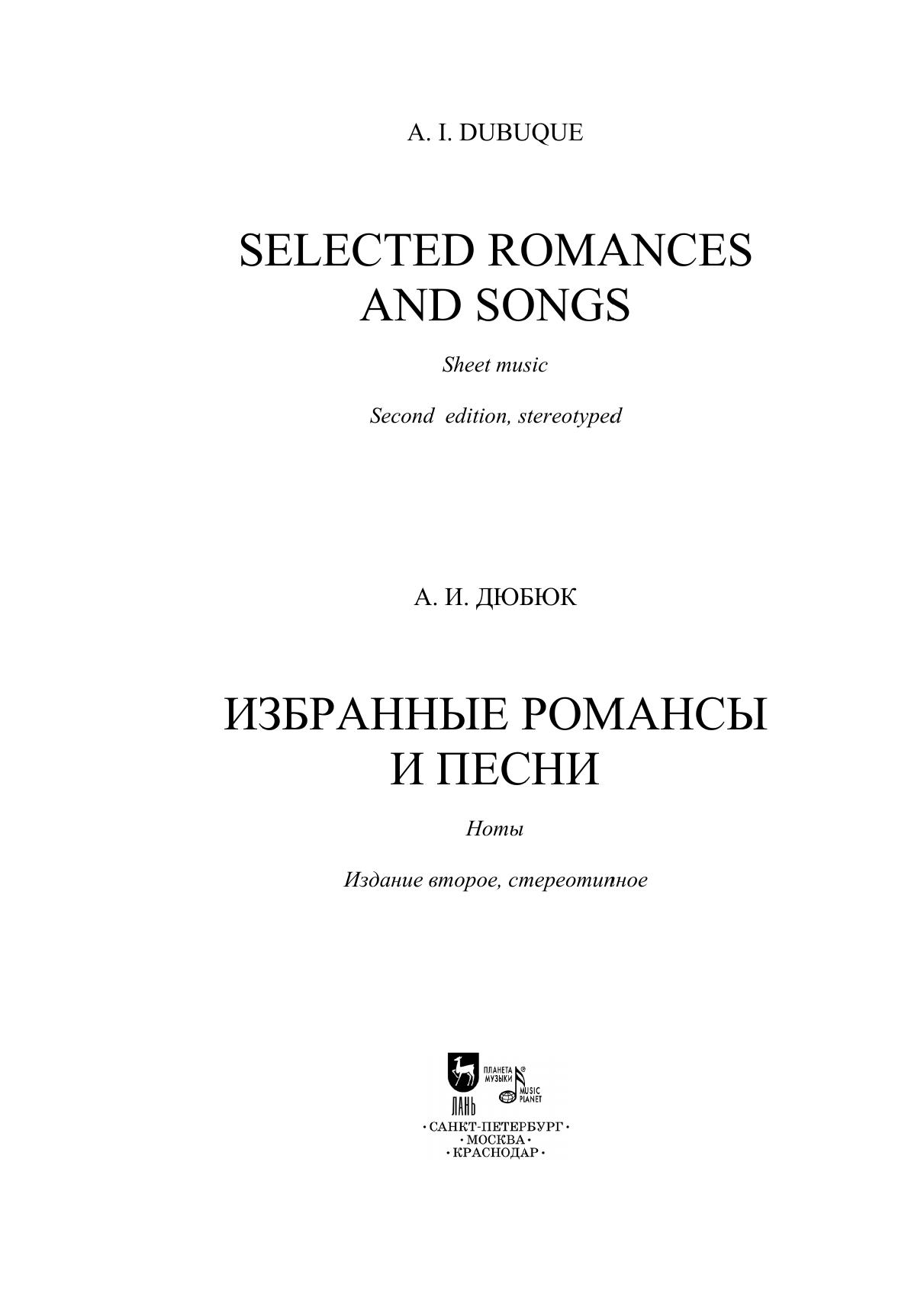Александр Иванович Дюбюк (1812-1898) — композитор, стоявший у истоков старинного русского романса. В его вокальном наследии более 170 романсов и песен, которые по сей день входят в репертуар многих исполнителей. Творчество Дюбюка поражает разнообразием жанров, форм, тем. Композитор обращался к текстам А. Кольцова, В. Чуевского, Н. Цыганова, Е. Ростопчиной, А. Фета, А. Майкова, А. Пушкина, Г. Гейне и др. В настоящий сборник вошли как популярные сочинения ( "Птичка", "Улица, Улица", "Не обмани" и др.), так и менее репертуарные песни и романсы. Издание адресовано профессиональным певцам и музыкантам-любителям. Alexandre Ivanovich Dubuque (1812-1898) was the composer, who stood at the origins of the old Russian romance. His vocal heritage includes more than 170 romances and songs, which to this day remain in the repertoire of many performers. Dubuque’s work amazes with a variety of genres, forms, subjects. The composer turned to lyrics by A. Koltsov, V. Chuevsky, N. Tsyganov, E. Rostopchina, A. Fet, A. Maikov, A. Pushkin, H. Heine and others. The current collection includes both popular pieces (“A Little Bird”, “Street, Street”, “Do not deceive”, etc.), and more rare songs and romances. The edition is addressed to performing artists and amateur musicians.