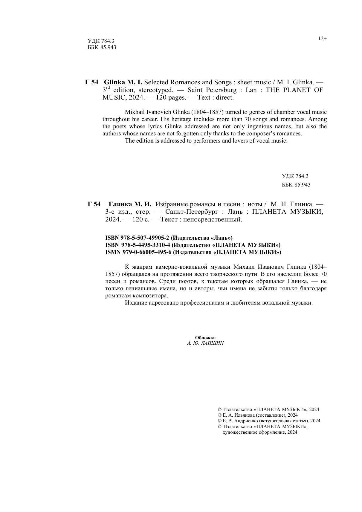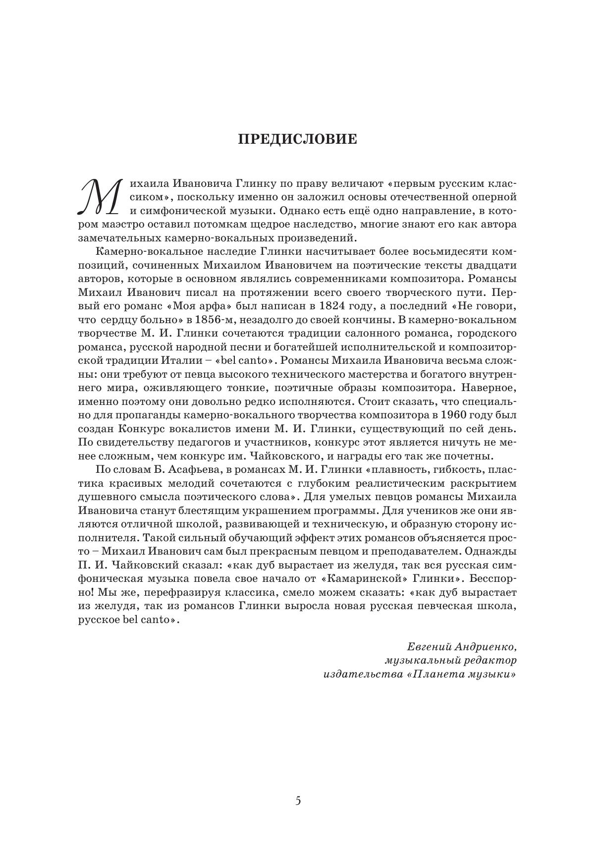 К жанрам камерно-вокальной музыки Михаил Иванович Глинка (1804-1857) обращался на протяжении всего творческого пути. В его наследии более 70 песен и романсов. Среди поэтов, к текстам которых обращался Глинка, — не только гениальные имена, но и авторы, чьи имена не забыты только благодаря романсам композитора. Издание адресовано профессионалам и любителям вокальной музыки.