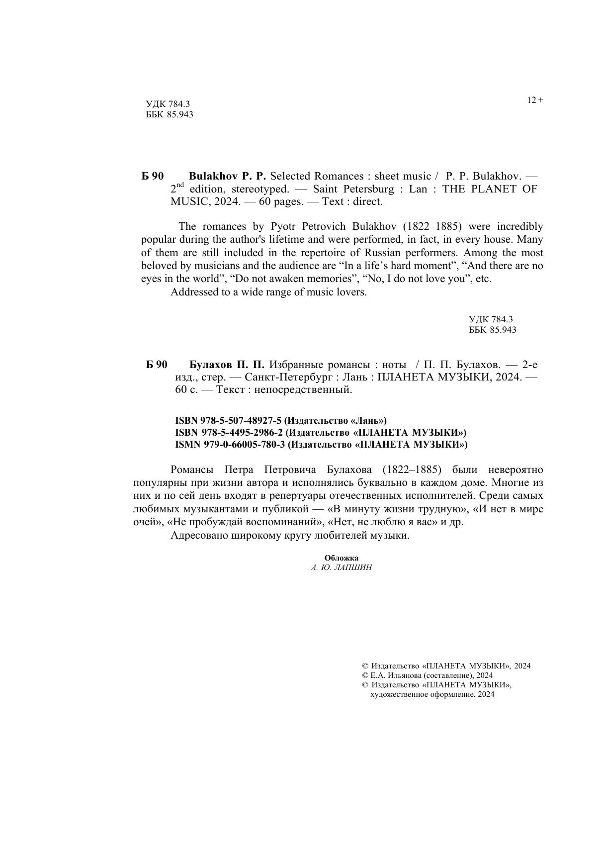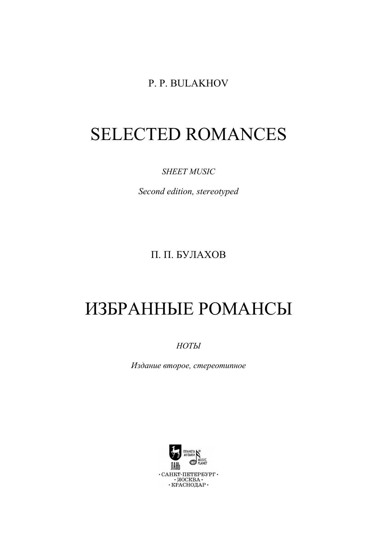 Романсы Петра Петровича Булахова, 1822-1885 были невероятно популярны при жизни автора и исполнялись буквально в каждом доме. Многие из них и по сей день входят в репертуары отечественных исполнителей. Среди самых любимых музыкантами и публикой – В минуту жизни трудную, И нет в мире очей, Не пробуждай воспоминаний, Нет, не люблю я вас и др. Адресовано широкому кругу любителей музыки.