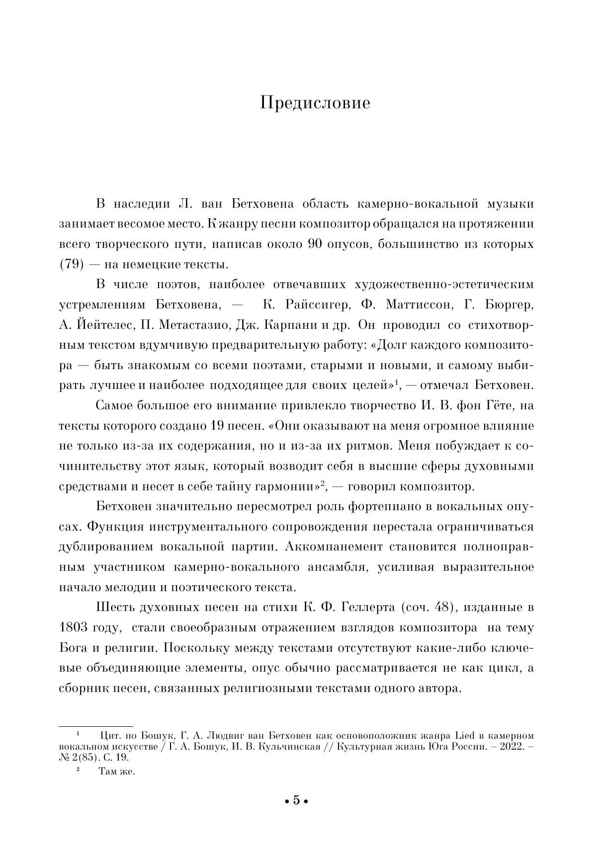 В наследии Л. ван Бетховена область камерно-вокальной музыки занимает весомое место. К жанру песни композитор обращался на протяжении всего творческого пути, написав около 90 опусов. В сборник вошли отдельные песни («Аделаида», «Песня издалека», «Возлюбленной», «Поцелуй») и вокальные циклы (соч. 48. 52, 83, 98) Бетховена. Издание адресовано студентам вокальных факультетов музыкальных училищ и вузов, профессиональным исполнителям, любителям вокальной музыки. The sphere of chamber vocal music occupies a significant place in the L. van Beethoven’s heritage. The composer turned himself to the genre of Lied throughout his entire career, having written about 90 opuses. The collection includes separate songs (“Adelaide”, “Song From Afar”, “To the Beloved”, “The Kiss”) and Beethoven’s vocal cycles (op. 48. 52, 83, 98). The edition is addressed to students of vocal faculties of music colleges and higher schools, professional performers, lovers of vocal music.