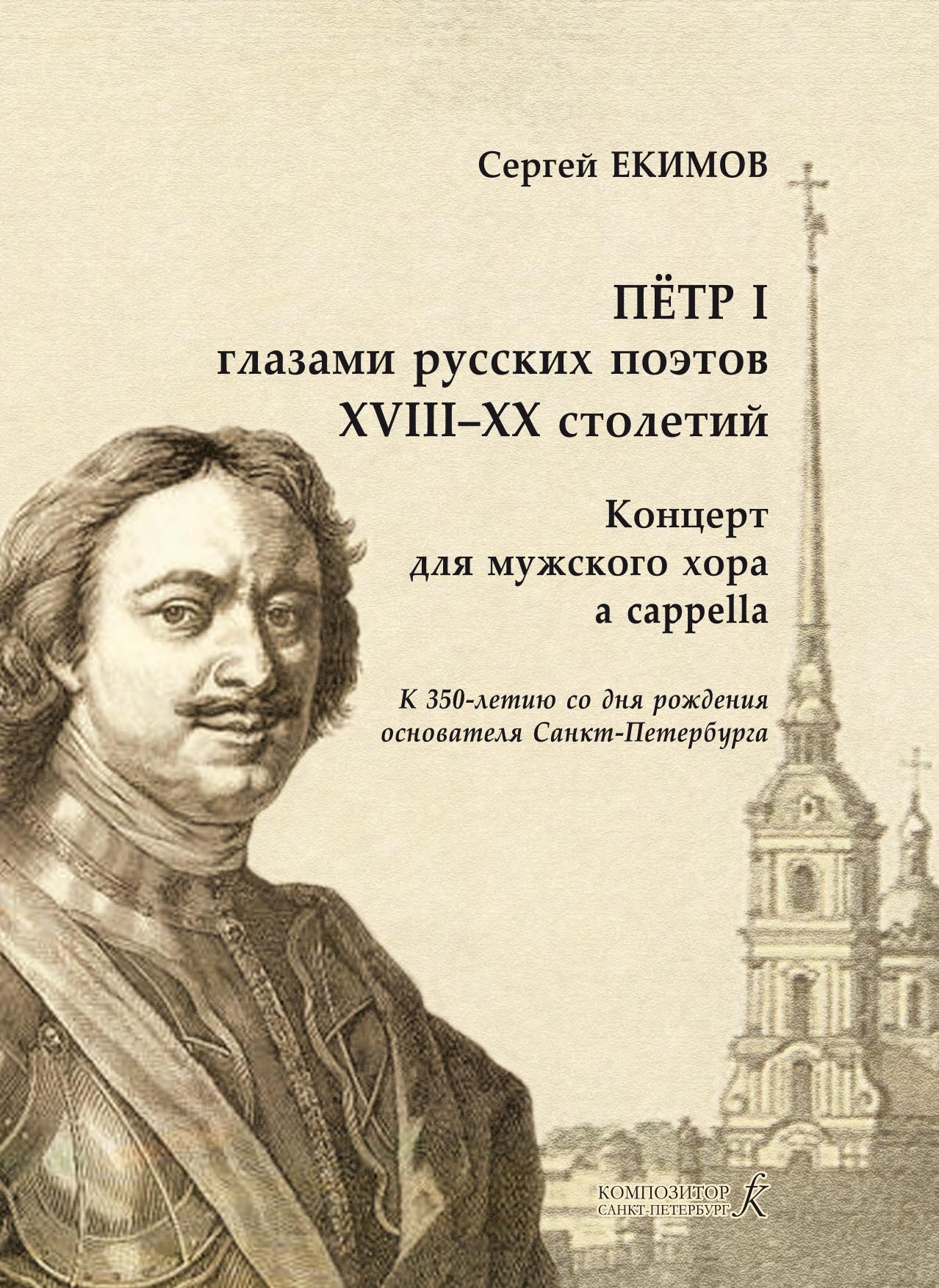 Концерт для мужского хора без сопровождения «Пётр I глазами русских поэтов XVIII–XX столетий» написан петербургским композитором и хоровым дирижёром, лауреатом премии Правительства Санкт-Петербурга Сергеем Екимовым (р. 1974) в августе 2022 года по заказу недавно организованного, но уже ярко заявившего о себе Мужского хора Карельской государственной филармонии под управлением Алексея Умнова. Это сочинение создано в год 350-летия со дня рождения основателя Санкт-