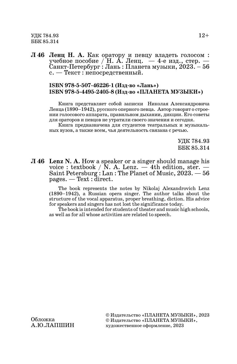Книга представляет собой записки Николая Александровича Ленца (1890–1942), русского оперного певца. Автор говорит о строении голосового аппарата, правильном дыхании, дикции. Его советы для ораторов и певцов не утратили своего значения и сегодня.