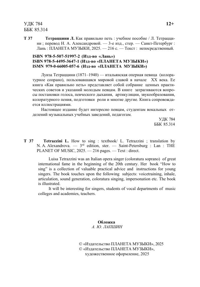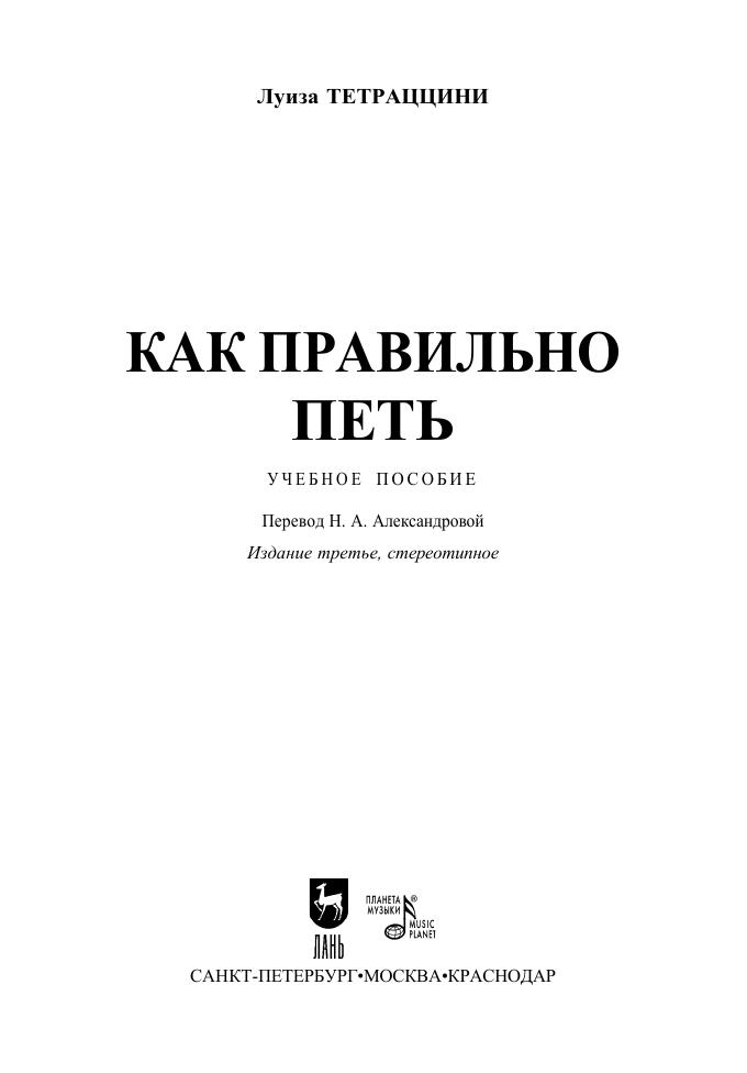 Луиза Тетраццини (1871–1940) — итальянская оперная певица (колоратурное сопрано), пользовавшаяся мировой славой в начале XX века. Ее книга «Как правильно петь» представляет собой собрание ценных практических советов и указаний молодым певцам. В книге затрагиваются вопросы постановки голоса, певческого дыхания, артикуляции, звукообразования, колоратурного пения, подготовки роли и многие другие. Книга сопровождается иллюстрациями. Настоящее издание будет интересно певцам, студентам вокальных отделений музыкальных учебных заведений, педагогам.