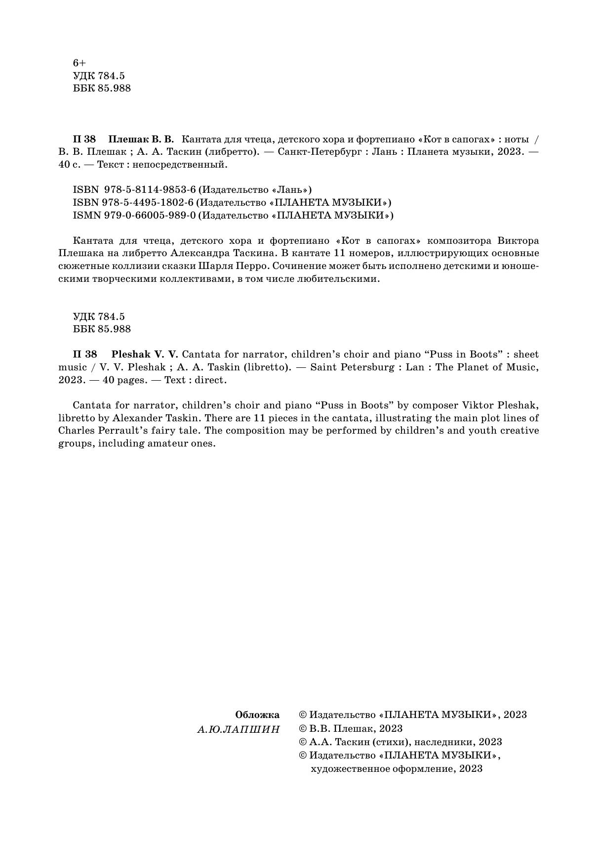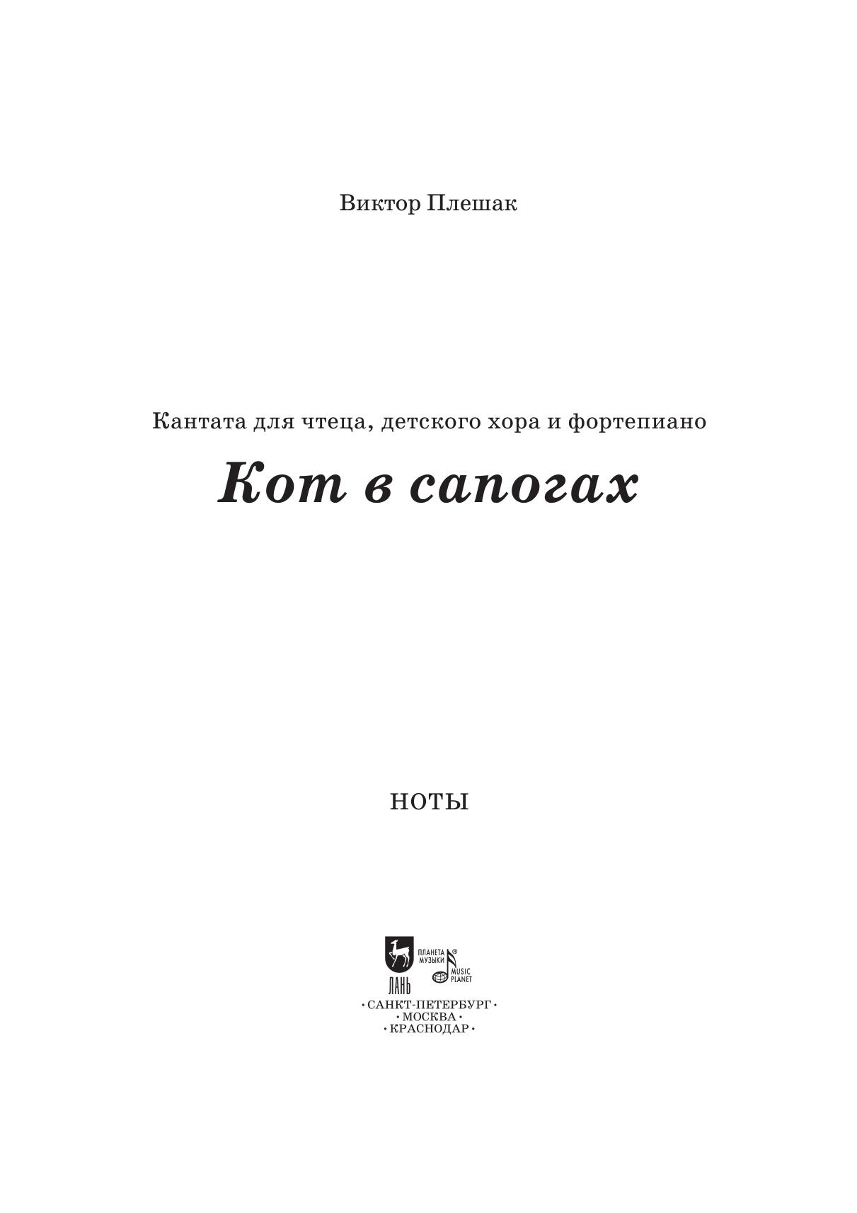 Кантата для чтеца, детского хора и фортепиано «Кот в сапогах» композитора Виктора Плешака на либретто Александра Таскина. В кантате 11 номеров, иллюстрирующих основные сюжетные коллизии сказки Шарля Перро. Сочинение может быть исполнено детскими и юношескими творческими коллективами, в том числе любительскими.