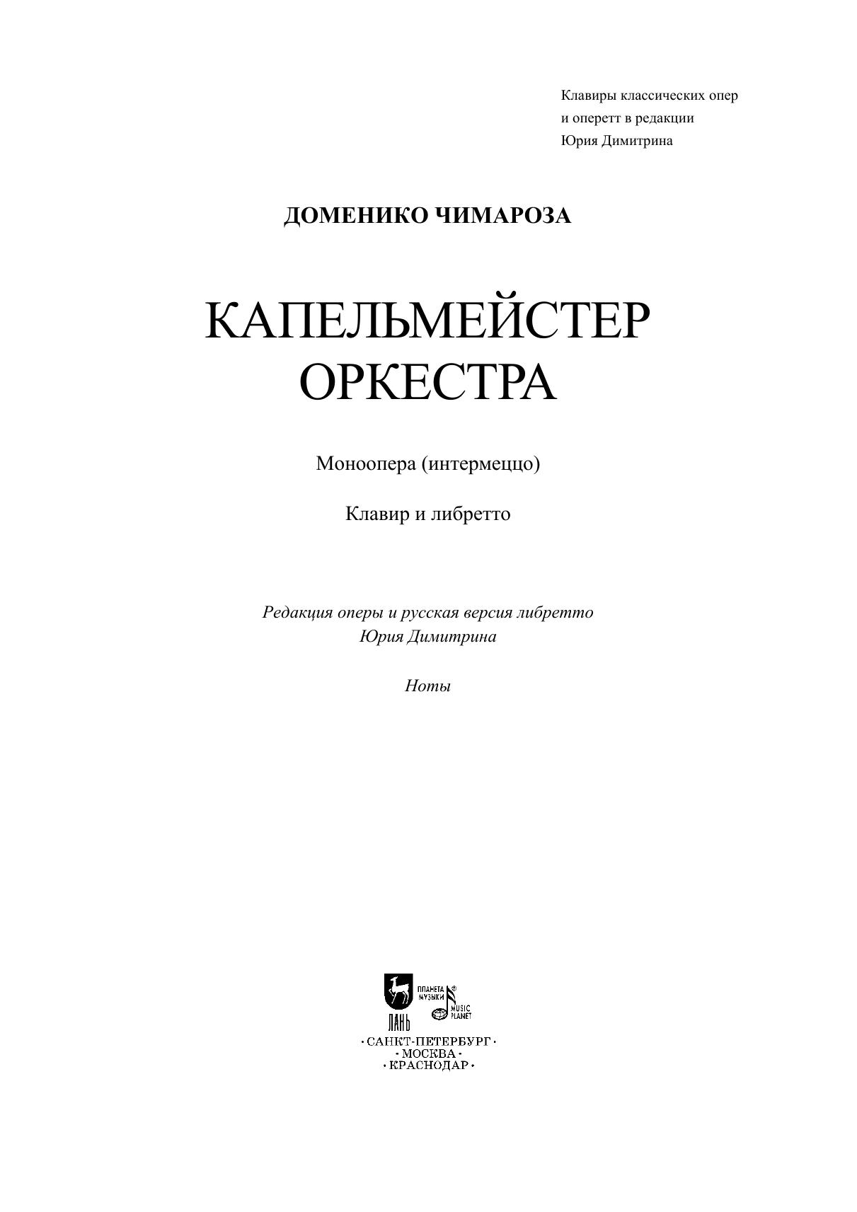 Моноопера (интермеццо) Доменико Чимарозы (1749–1801) «Капельмейстер оркестра» создана в 1793 году. Капельмейстер «сражается» с музыкантами руководимого им оркестра, пытаясь добиться нужного ему звучания. При этом все тембровые, динамические нюансы, сложные фиоритуры певец-капельмейстер, подчас, воспроизводит, подражая звучанию контрабаса, гобоя, фагота и других инструментов. В предлагаемом либретто Юрия Димитрина в качестве действующего лица участвует и контрабасист-оркестрант (разговорная роль), реплики которого приводят к возникновению между дирижером и оркестрантом кратких иронично-комедийных диалогов. Издание, включающее в себя клавир и либретто, предназначено для дирижеров, режиссеров и солистов музыкальных театров, для студентов и педагогов вокальных отделений творческих вузов, а также для широкого круга любителей музыкально-сценического искусства. Mono-opera (intermezzo) by Domenico Cimarosa (1749–1801) “Kapellmeister” (“Il maestro di cappella”) was written in 1793. The kapellmeister “fights” with the musicians of the orchestra he leads, trying to get the sound he wants. At the same time, the singer-kapellmeister sometimes reproduces all the timbre and dynamic nuances, complicated graces notes, imitating the sound of the double bass, oboe, bassoon and other instruments. The current libretto by Yuri Dimitrin introduces the double bassist, orchestra player (a spoken role), as a character, whose remarks make up the brief ironic and comic dialogues between the conductor and the orchestra musician. The edition, which includes the piano score and libretto, is intended for conductors, directors and soloists of music theatres, for students and teachers of vocal departments of higher schools of arts, as well as for a wide range of lovers of musical and performing arts.