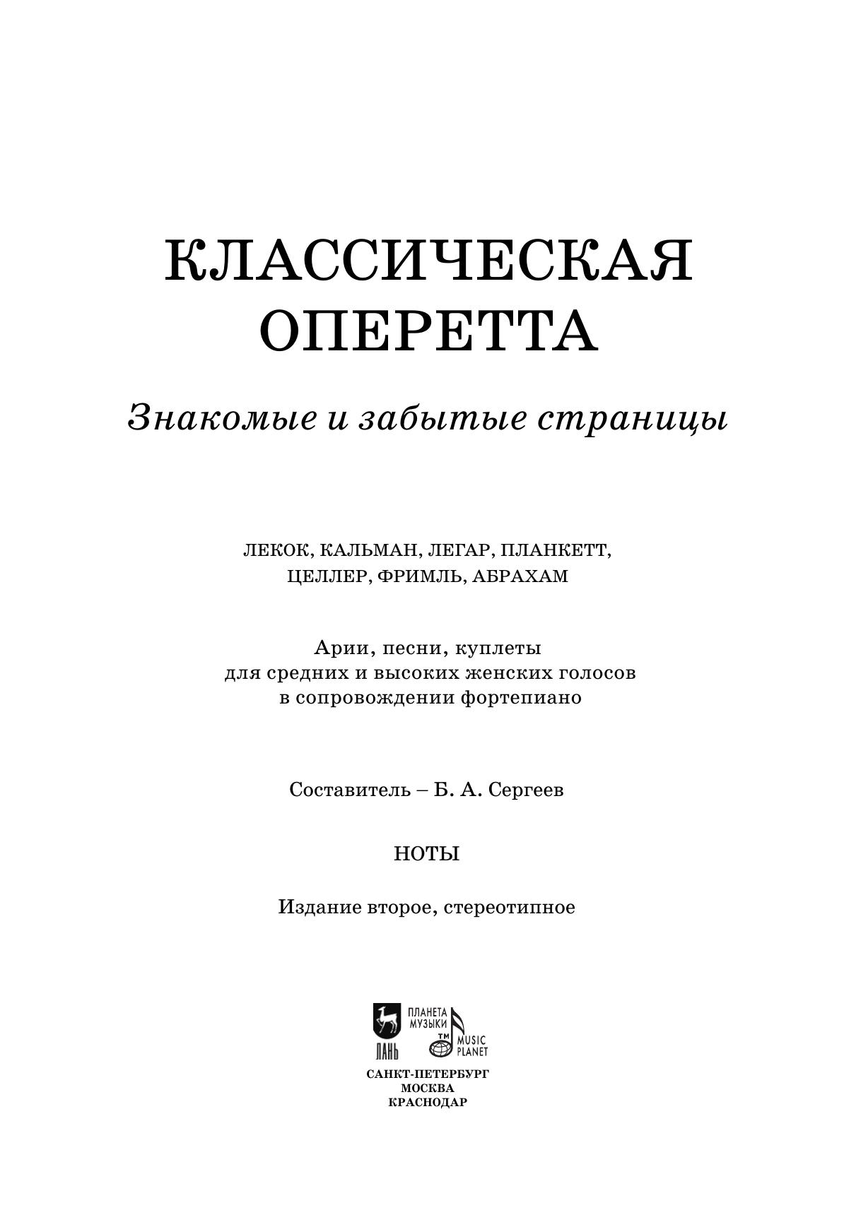 Классическая оперетта. Знакомые и забытые страницы. Арии, песни, куплеты для средних и высоких женских голосов в сопровождении фортепиано
