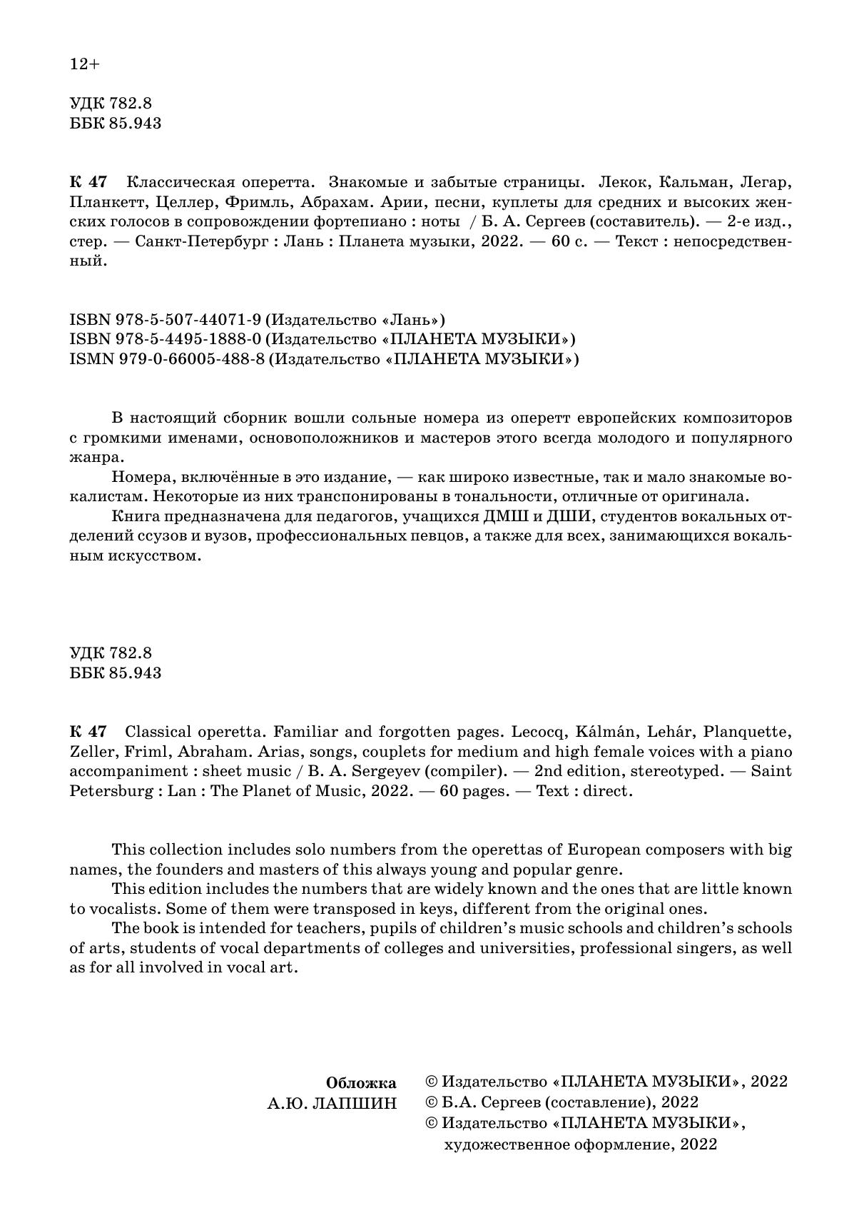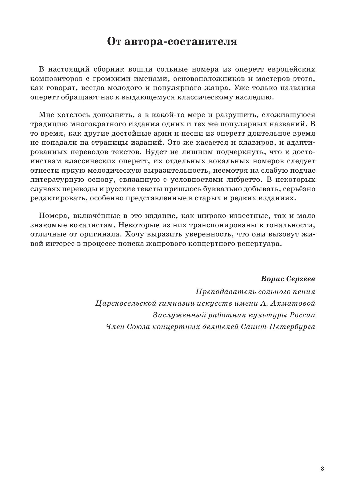 В настоящий сборник вошли сольные номера из оперетт европейских композиторов с громкими именами, основоположников и мастеров этого всегда молодого и популярного жанра.