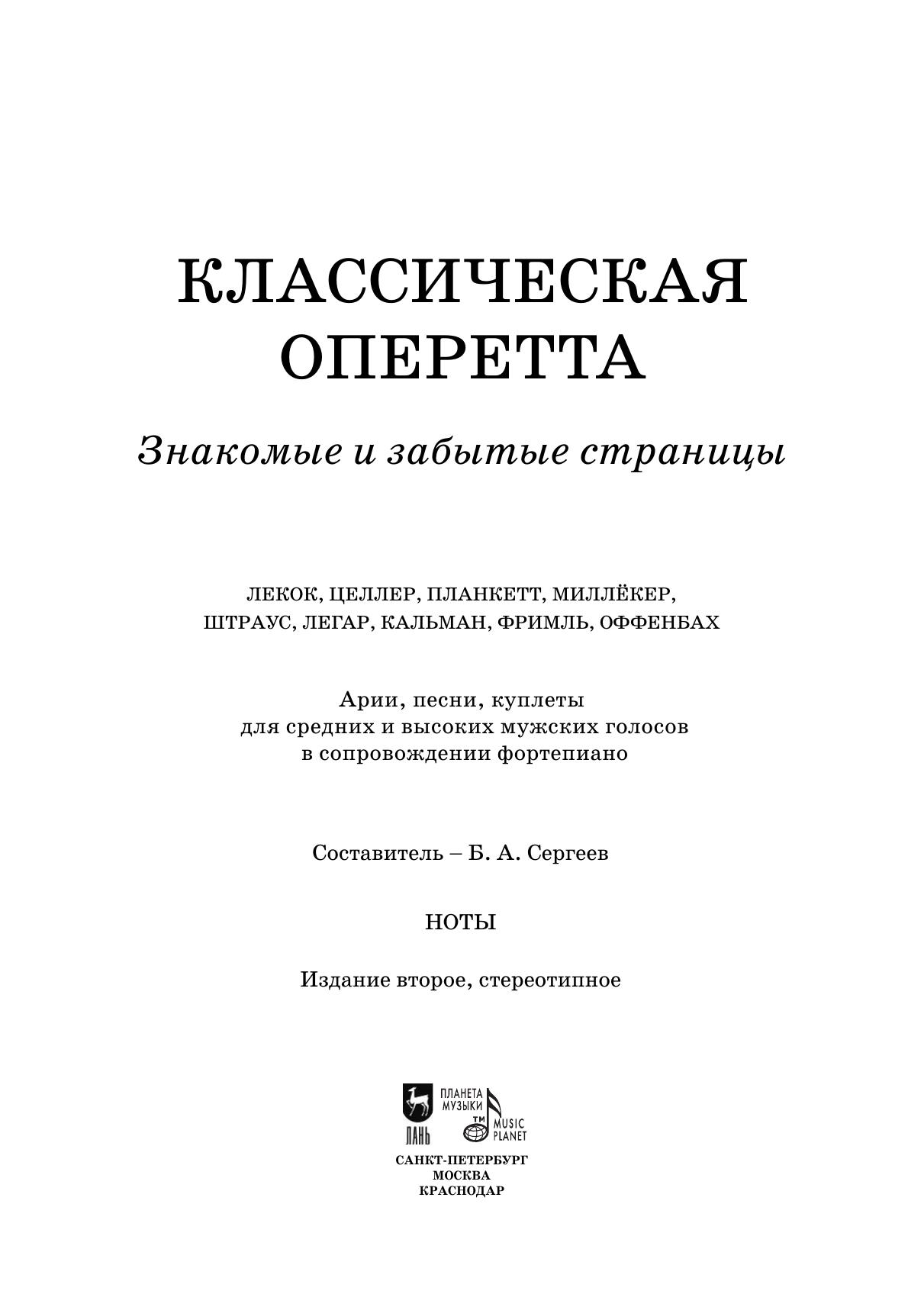 Классическая оперетта. Знакомые и забытые страницы. Арии, песни, куплеты для средних и высоких мужских голосов в сопровождении фортепиано