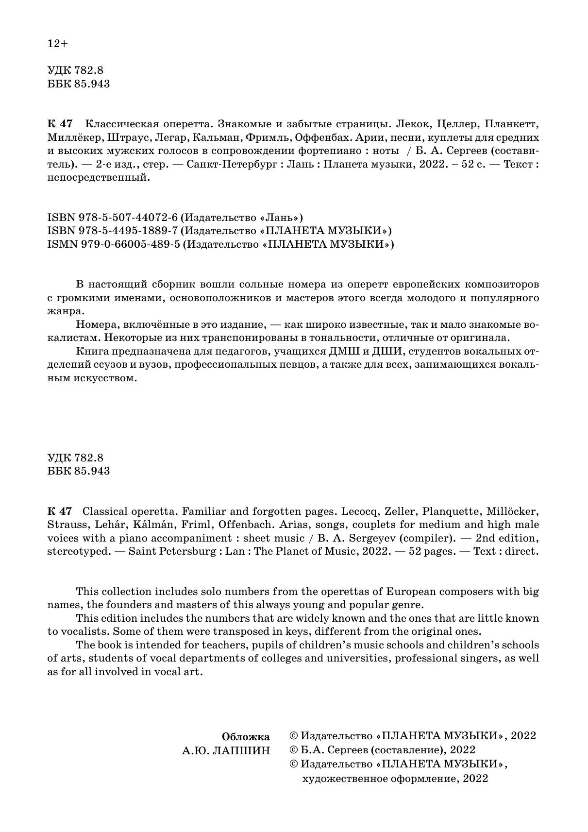 В настоящий сборник вошли сольные номера из оперетт европейских композиторов с громкими именами, основоположников и мастеров этого всегда молодого и популярного жанра.