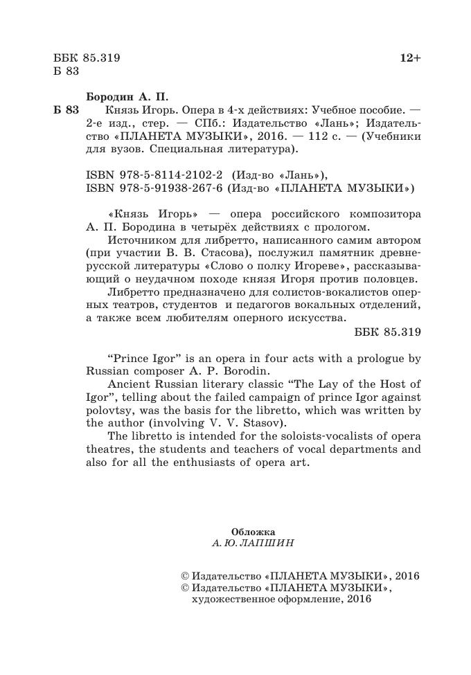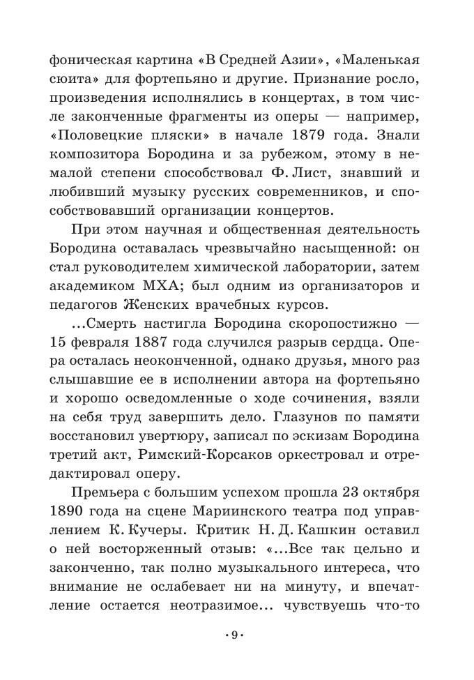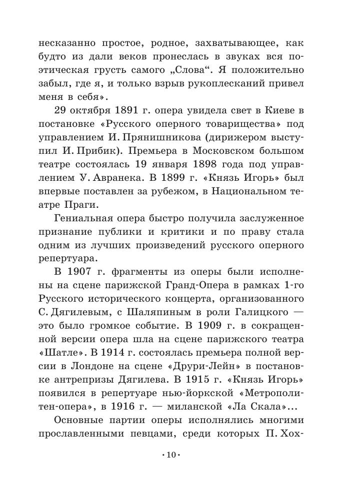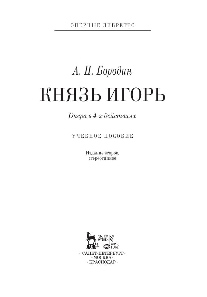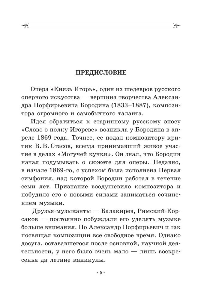 “Prince Igor” is an opera in four acts with a prologue by Russian composer A. P. Borodin. Ancient Russian literary classic “The Lay of the Host of Igor”, telling about the failed campaign of prince Igor against polovtsy, was the basis for the libretto, which was written by the author (involving V. V. Stasov). The libretto is intended for the soloists-vocalists of opera theatres, the students and teachers of vocal departments and also for all the enthusiasts of opera art.