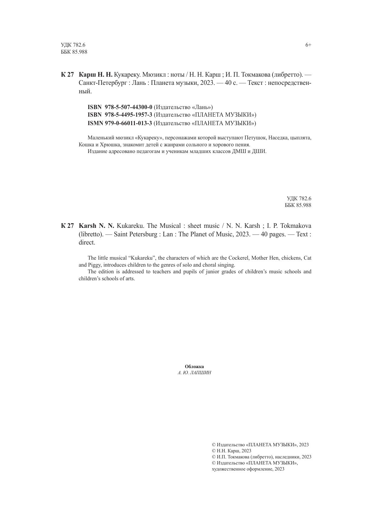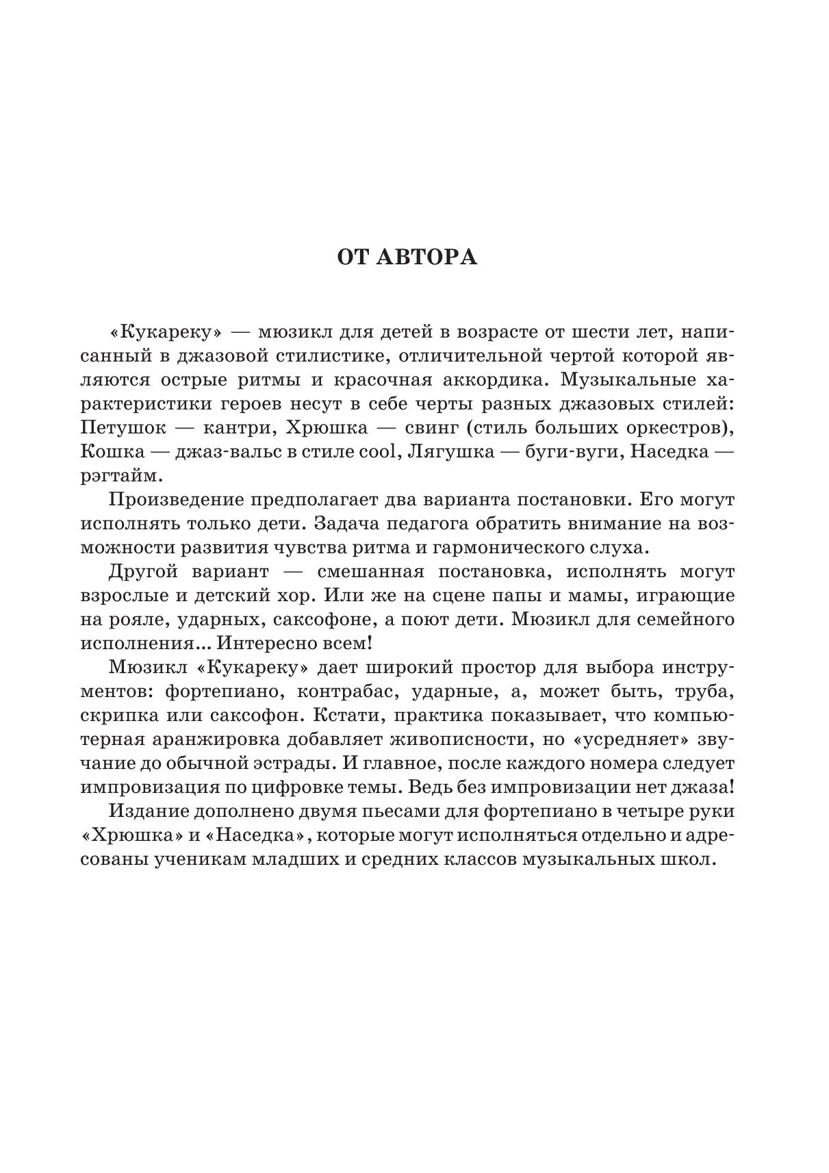 Маленький мюзикл «Кукареку», персонажами которой выступают Петушок, Наседка, цыплята, Кошка и Хрюшка, знакомит детей с жанрами сольного и хорового пения. Издание адресовано педагогам и ученикам младших классов ДМШ и ДШИ. The little musical „Kukareku“, the characters of which are the Cockerel, Mother Hen, chickens, Cat and Piggy, introduces children to the genres of solo and choral singing. The edition is addressed to teachers and pupils of junior grades of children’s music schools and children’s schools of arts.