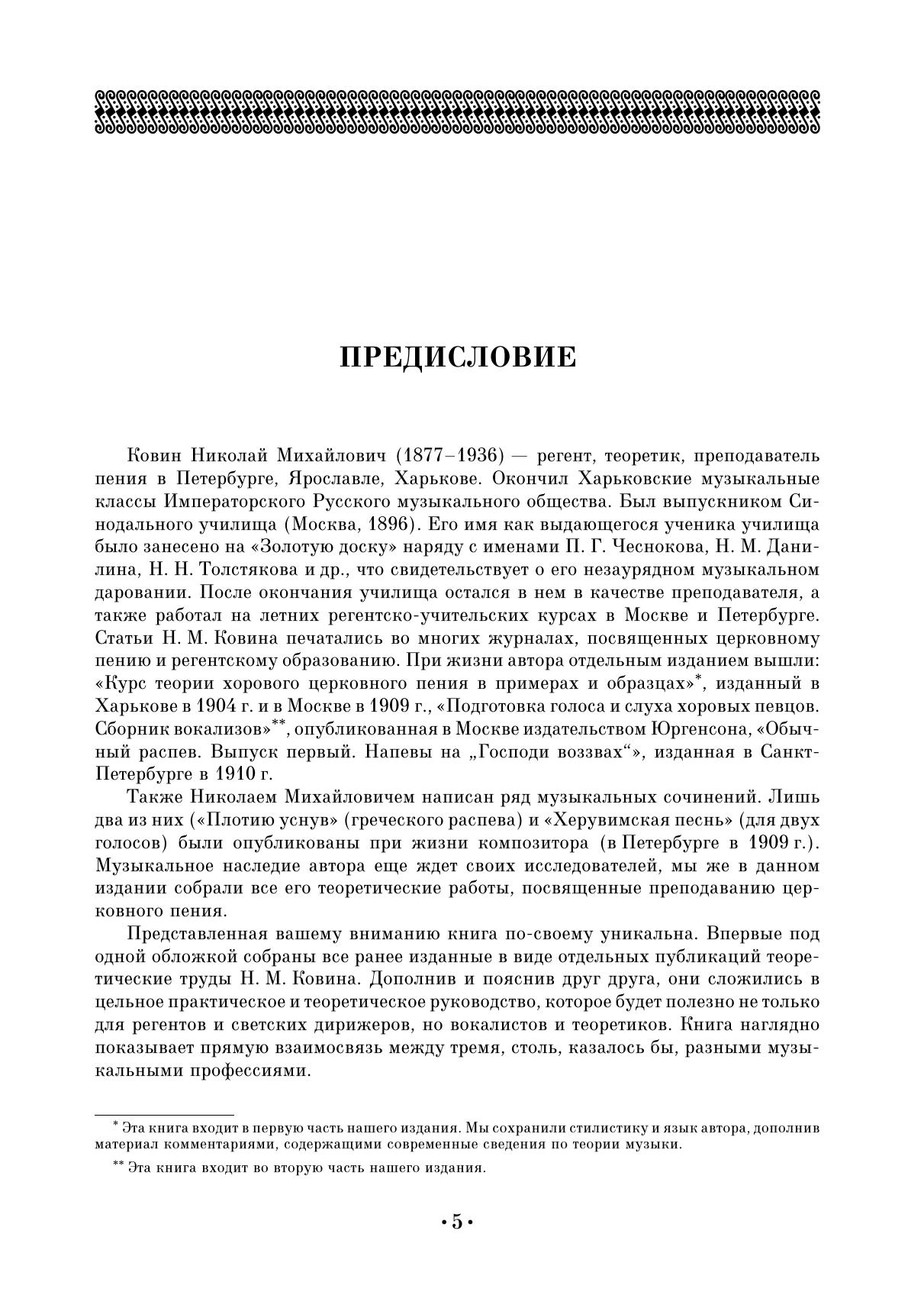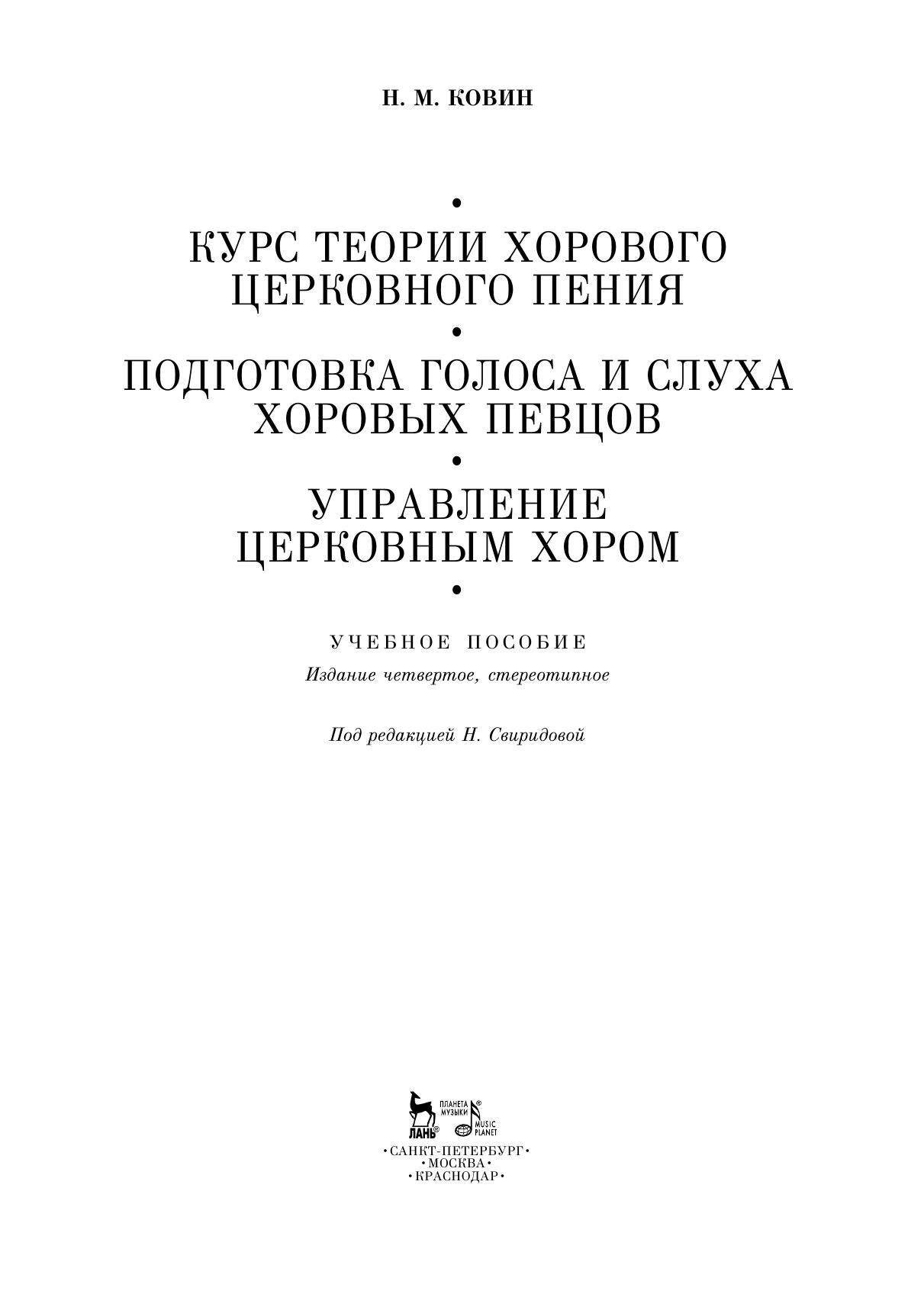 Ковин Николай Михайлович (1877–1936) — преподаватель пения в Харькове, Петербурге, Москве, Ярославле, регент, автор пособий по методике обучения церковному пению. Данное издание содержит в себе три работы автора. «Курс теории хорового церковного пения» представляет собой основы музыкальной теории и гармонии. «Подготовка голоса и слуха хоровых певцов» содержит упражнения на развитие вокальной техники, чувства ритма, чистоты интонирования, гармонического слуха и др. «Управление церковным хором» дает свод необходимых правил и положений по управлению хором, освещает вопросы регентского мастерства, дирижерской техники.