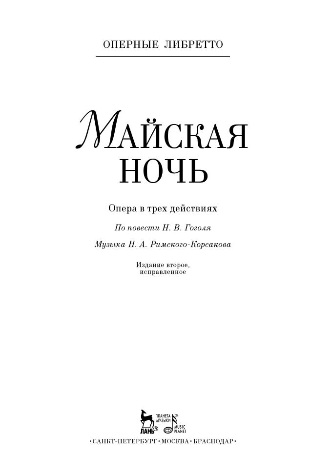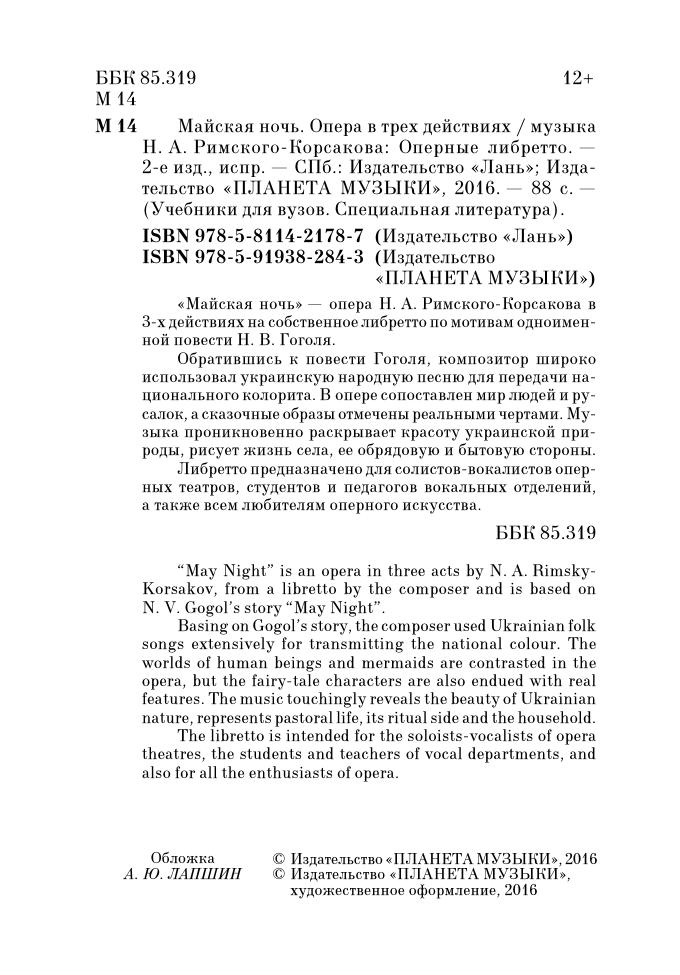 The libretto is intended for the soloists-vocalists of opera theatres, the students and teachers of vocal departments, and also for all the enthusiasts of opera.
