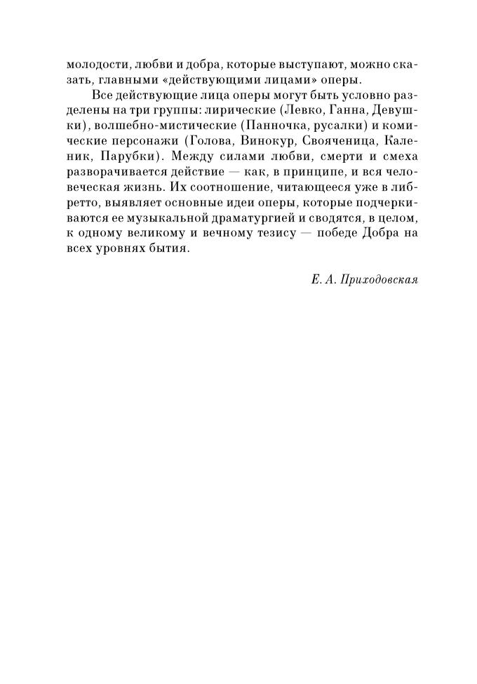 Basing on Gogol’s story, the composer used Ukrainian folk songs extensively for transmitting the national colour. The worlds of human beings and mermaids are contrasted in the opera, but the fairy-tale characters are also endued with real features. The music touchingly reveals the beauty of Ukrainian nature, represents pastoral life, its ritual side and the household.