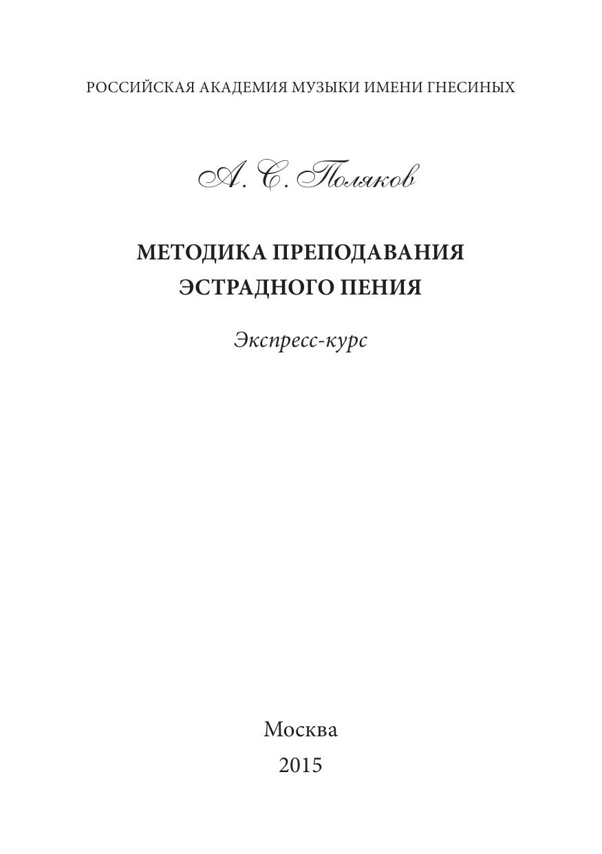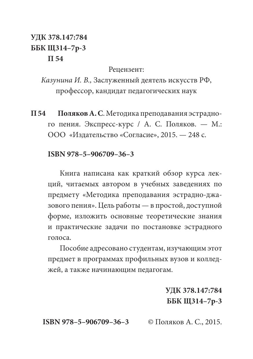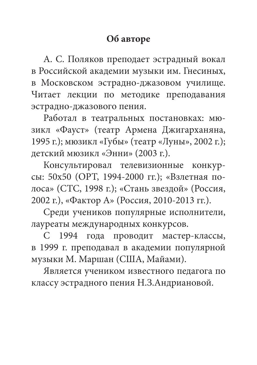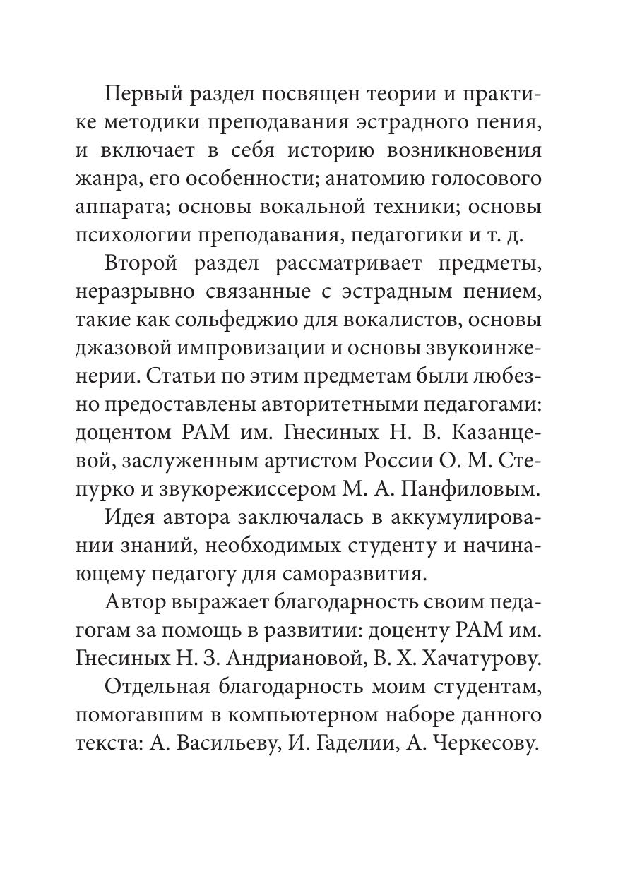Книга написана как краткий обзор курса лекций, читаемых автором в учебных заведениях по предмету «Методика преподавания эстрадно-джазового пения». Цель работы — в простой, доступной форме, изложить основные теоретические знания и практические задачи по постановке эстрадного голоса.