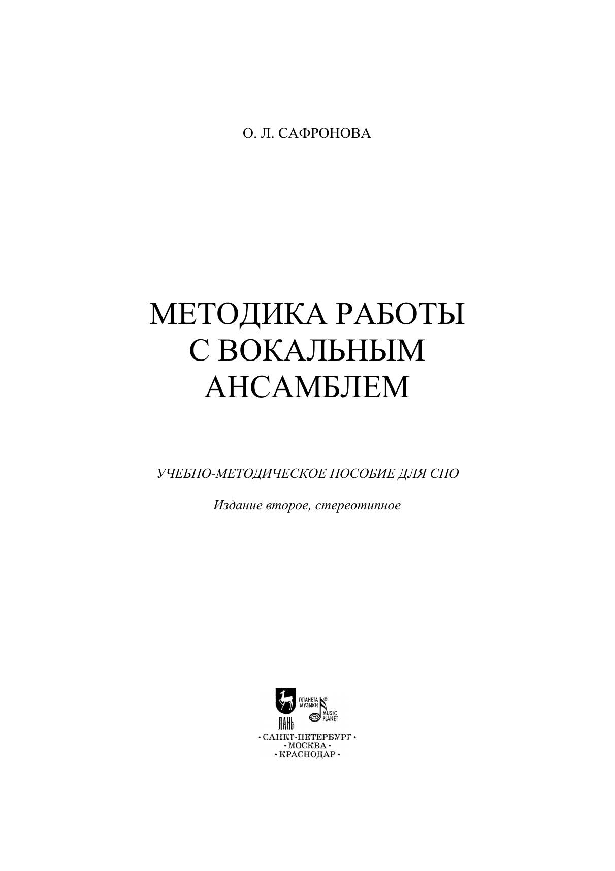 Учебно-методическое пособие «Методика работы с эстрадно-джазовым вокальным ансамблем» адресовано студентам и преподавателям средних специальных учебных заведений, а также руководителям эстрадных коллективов – самодеятельных и профессиональных. Соответствует современным требованиям Федерального государственного образовательного стандарта среднего профессионального образования и профессиональным квалификационным требованиям. The methodical textbook “Methods of working with vocal ensemble” is addressed to students of сolleges, as well as leaders of pop bands, both amateur and professional ones. Corresponds to the modern requirements of the Federal State Educational Standard of Secondary Vocational Education and professional qualification requirements.