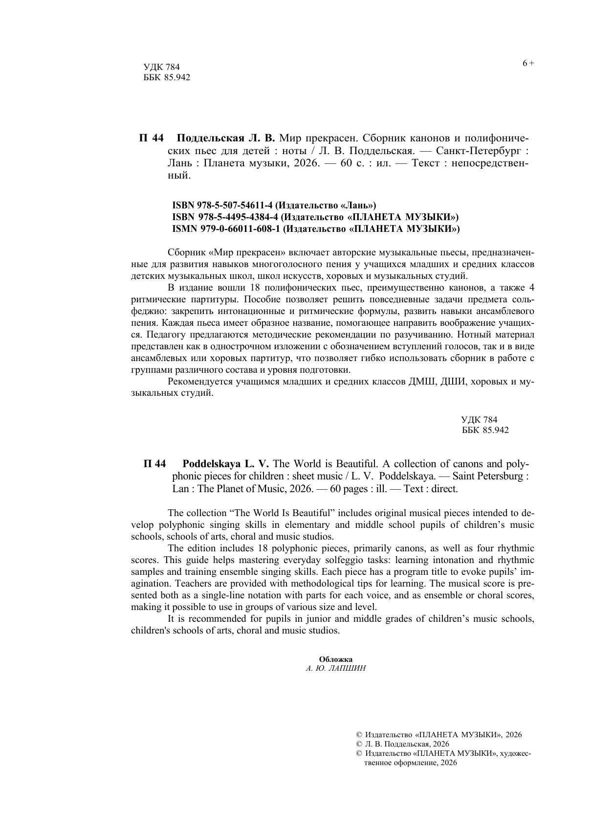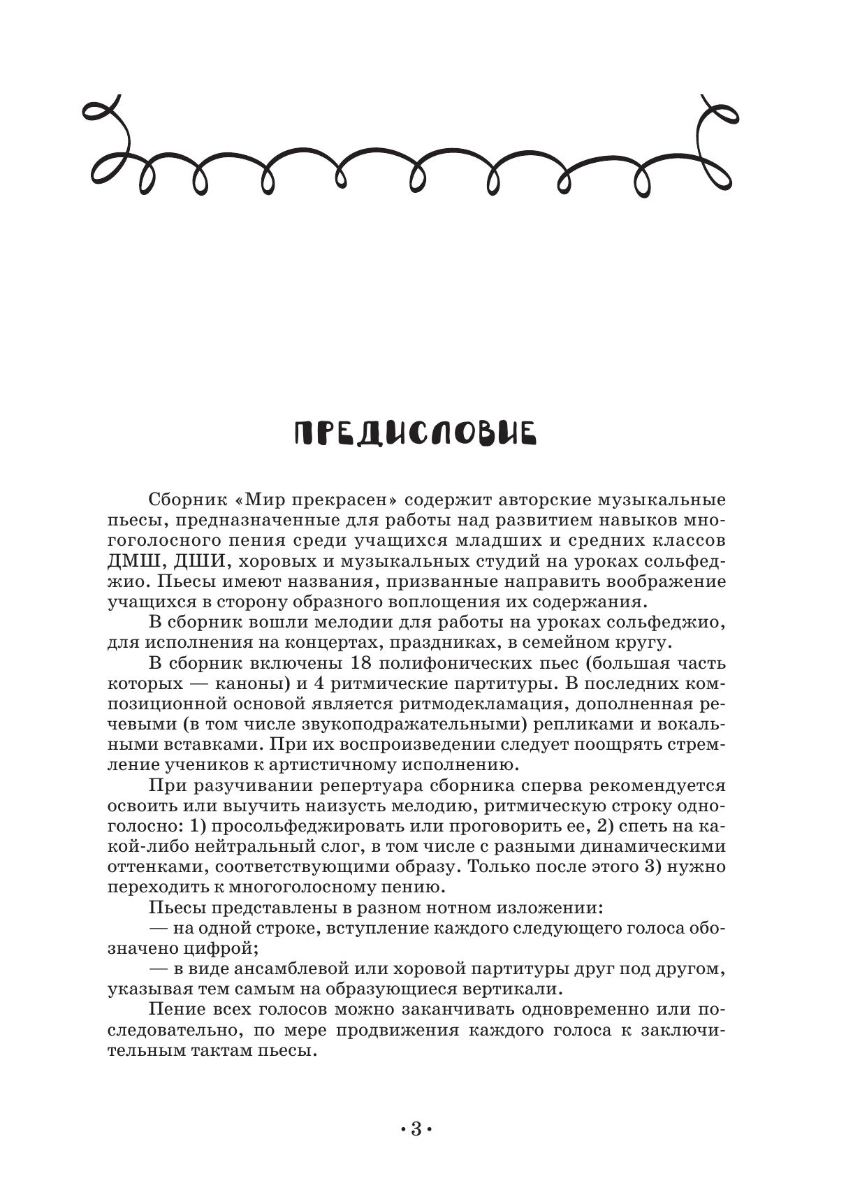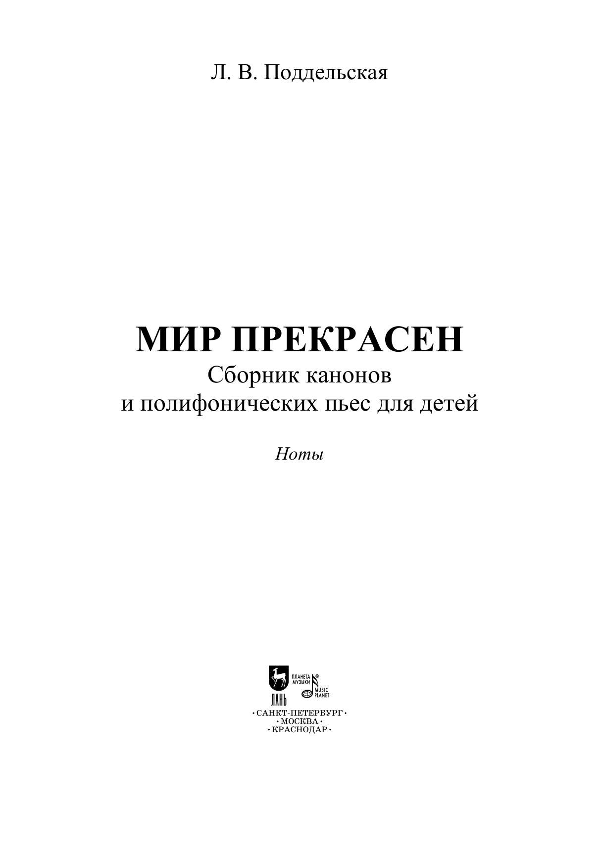 Сборник «Мир прекрасен» включает авторские музыкальные пьесы, предназначенные для развития навыков многоголосного пения у учащихся младших и средних классов детских музыкальных школ, школ искусств, хоровых и музыкальных студий. В издание вошли 18 полифонических пьес, преимущественно канонов, а также 4 ритмические партитуры. Пособие позволяет решить повседневные задачи предмета сольфеджио: закрепить интонационные и ритмические формулы, развить навыки ансамблевого пения. Каждая пьеса имеет образное название, помогающее направить воображение учащихся. Педагогу предлагаются методические рекомендации по разучиванию. Нотный материал представлен как в однострочном изложении с обозначением вступлений голосов, так и в виде ансамблевых или хоровых партитур, что позволяет гибко использовать сборник в работе с группами различного состава и уровня подготовки. Рекомендуется учащимся младших и средних классов ДМШ, ДШИ, хоровых и музыкальных студий. The collection “The World Is Beautiful” includes original musical pieces intended to de-velop polyphonic singing skills in elementary and middle school pupils of children’s music schools, schools of arts, choral and music studios. The edition includes 18 polyphonic pieces, primarily canons, as well as four rhythmic scores. This guide helps mastering everyday solfeggio tasks: learning intonation and rhythmic samples and training ensemble singing skills. Each piece has a program title to evoke pupils’ im-agination. Teachers are provided with methodological tips for learning. The musical score is pre-sented both as a single-line notation with parts for each voice, and as ensemble or choral scores, making it possible to use in groups of various size and level. It is recommended for pupils in junior and middle grades of children’s music schools, children's schools of arts, choral and music studios.