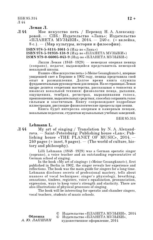 Книга будет интересна оперным и камерным певцам, вокальным педагогам, студентам музыкальных учебных заведений.