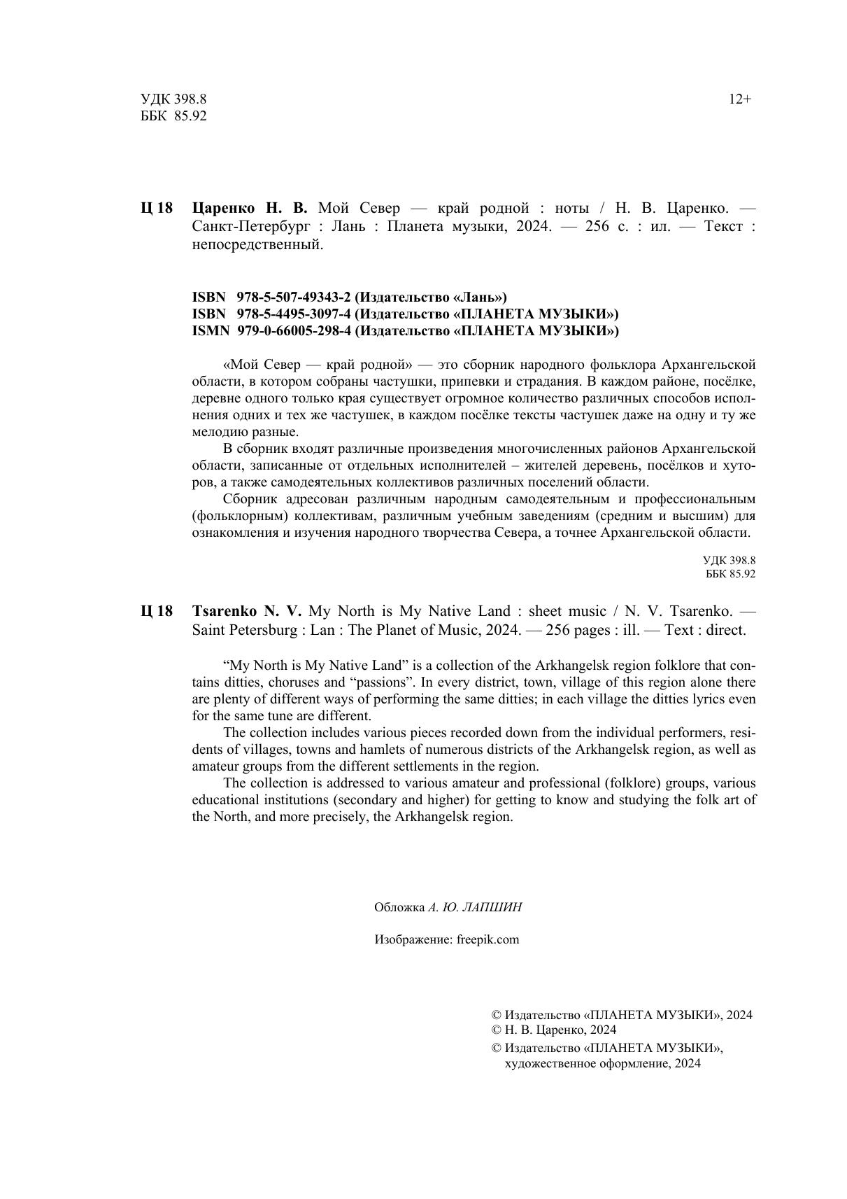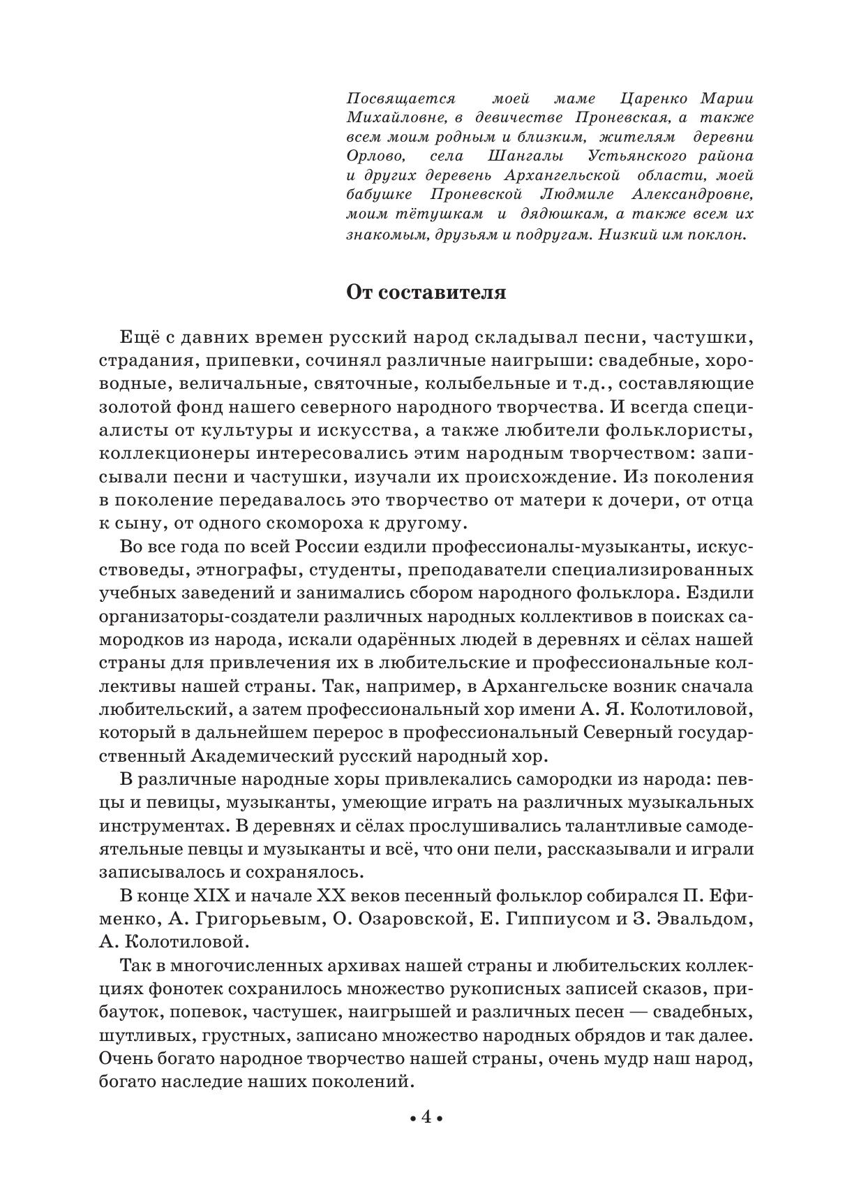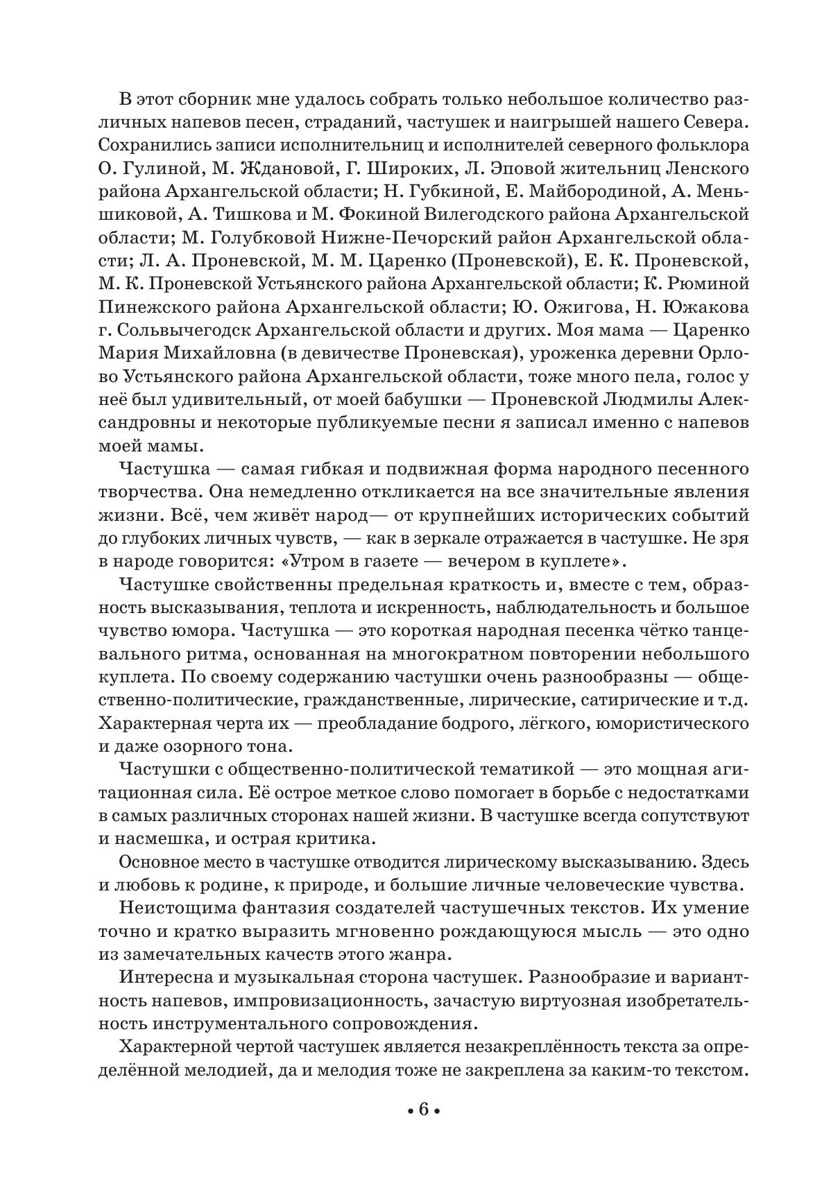 «Мой Север — край родной» — это сборник народного фольклора Архангельской области, в котором собраны частушки, припевки и страдания. В каждом районе, посёлке, деревне одного только края существует огромное количество различных способов исполнения одних и тех же частушек, в каждом посёлке тексты частушек даже на одну и ту же мелодию разные. В сборник входят различные произведения многочисленных районов Архангельской области, записанные от отдельных исполнителей – жителей деревень, посёлков и хуто-ров, а также самодеятельных коллективов различных поселений области. Сборник адресован различным народным самодеятельным и профессиональным (фольклорным) коллективам, различным учебным заведениям (средним и высшим) для ознакомления и изучения народного творчества Севера, а точнее Архангельской области. “My North is My Native Land” is a collection of the Arkhangelsk region folklore that con-tains ditties, choruses and “passions”. In every district, town, village of this region alone there are plenty of different ways of performing the same ditties, in each village the ditties lyrics even for the same tune are different. The collection includes various pieces recorded down from the individual performers, residents of villages, towns and hamlets of numerous districts of the Arkhangelsk region, as well as amateur groups from the different settlements in the region. The collection is addressed to various amateur and professional (folklore) groups, various educational institutions (secondary and higher) for getting to know and studying the folk art of the North, and more precisely, the Arkhangelsk region.