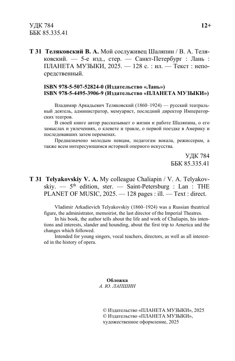 Владимир Аркадьевич Теляковский (1860 — 1924) — русский театральный деятель, администратор, мемуарист, последний директор Императорских театров. В своей книге автор рассказывает о жизни и работе Шаляпина, о его замыслах и увлечениях, о клевете и травле, о первой поездке в Америку и последовавших затем переменах. Предназначено молодым певцам, педагогам вокала, режиссерам, а также всем интересующимся историей оперного искусства.