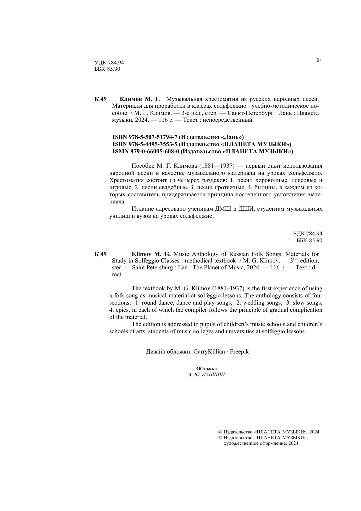 Пособие М. Г. Климова (1881-1937) — первый опыт использования народной песни в качестве музыкального материала на уроках сольфеджио. Хрестоматия состоит из четырех разделов: 1. песни хороводные, плясовые и игровые, 2. песни свадебные, 3. песни протяжные, 4. былины, в каждом из которых составитель придерживается принципа постепенного усложнения материала. Издание адресовано ученикам ДМШ и ДШИ, студентам музыкальных училищ и вузов на уроках сольфеджио.