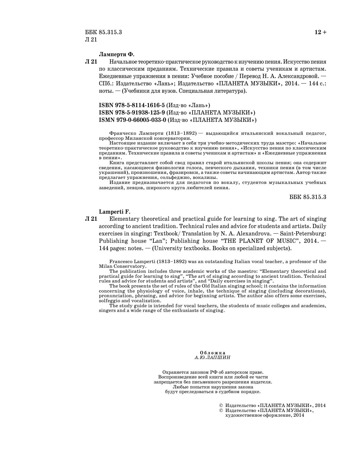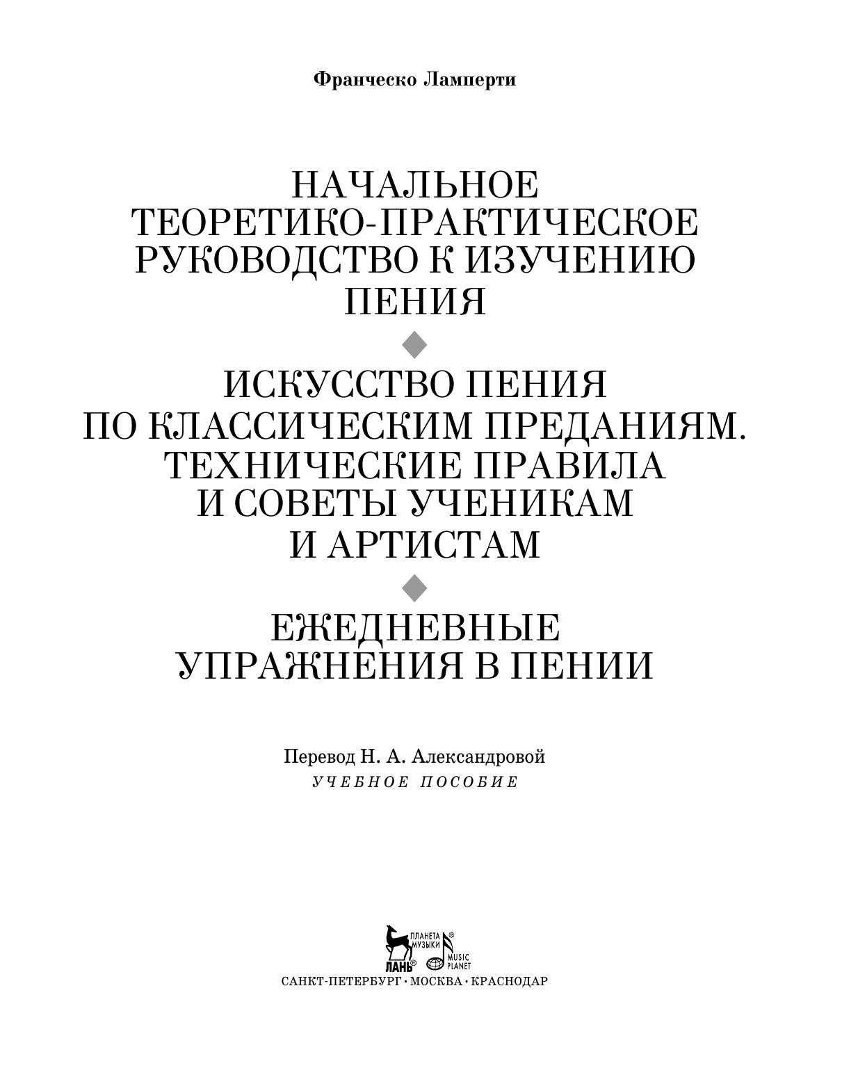 Francesco Lamperti (1813–1892) was an outstanding Italian vocal teacher, a professor of the Milan Conservatory. The publication includes three academic works of the maestro: “Elementary theoretical and practical guide for learning to sing”, “The art of singing according to ancient tradition. Technical rules and advice for students and artists”, and “Daily exercises in singing”.The book presents the set of rules of the Old Italian singing school; it contains the information concerning the physiology of voice, inhale, the technique of singing (including decorations), pronunciation, phrasing, and advice for beginning artists. The author also offers some exercises, solfeggio and vocalization. The study guide is intended for vocal teachers, the students of music colleges and academies, singers and a wide range of the enthusiasts of singing.