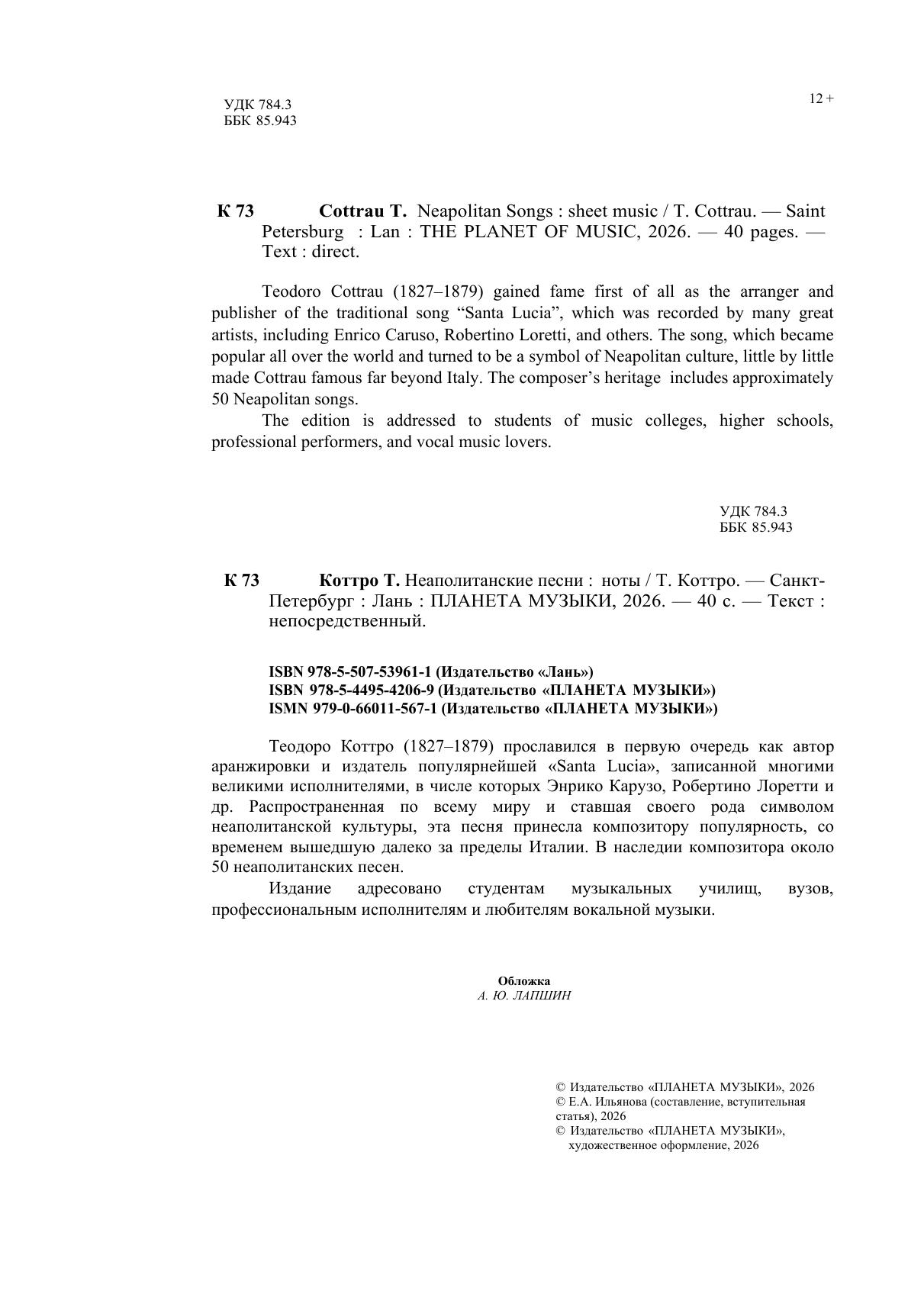 Теодоро Коттро (1827–1879) прославился в первую очередь как автор аранжировки и издатель популярнейшей «Santa Lucia», записанной многими великими исполнителями, в числе которых Энрико Карузо, Робертино Лоретти и др. Распространенная по всему миру и ставшая своего рода символом неаполитанской культуры, эта песня принесла композитору популярность, со временем вышедшей далеко за пределы Италии. В наследии композитора около 50 неаполитанских песен. Издание адресовано студентам музыкальных училищ, вузов, профессиональным исполнителям и любителям вокальной музыки. Teodoro Cottrau (1827–1879) gained fame first of all as the arranger and publisher of the traditional song “Santa Lucia”, which was recorded by many great artists, including Enrico Caruso, Robertino Loretti, and others. The song, which became popular all over the world and turned to be a symbol of Neapolitan culture, little by little made Cottrau famous far beyond Italy. The composer’s heritage includes approximately 50 Neapolitan songs. The edition is addressed to students of music colleges, higher schools, professional performers, and vocal music lovers.