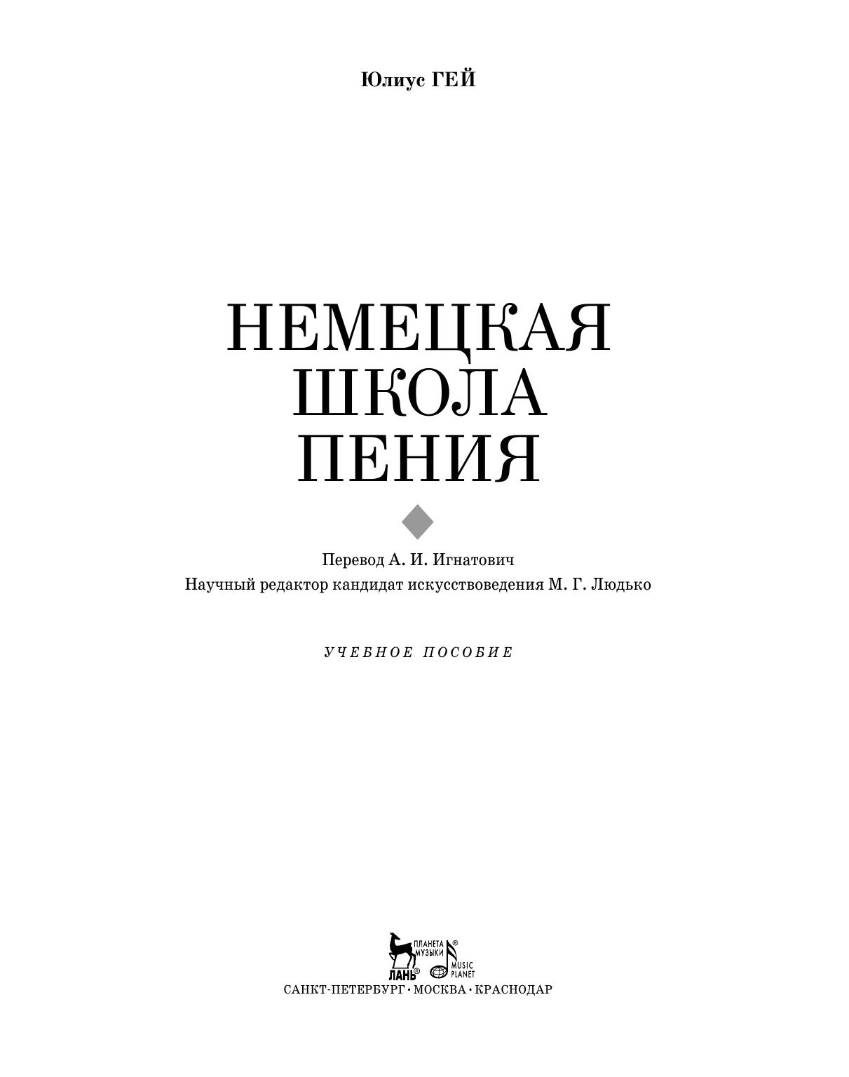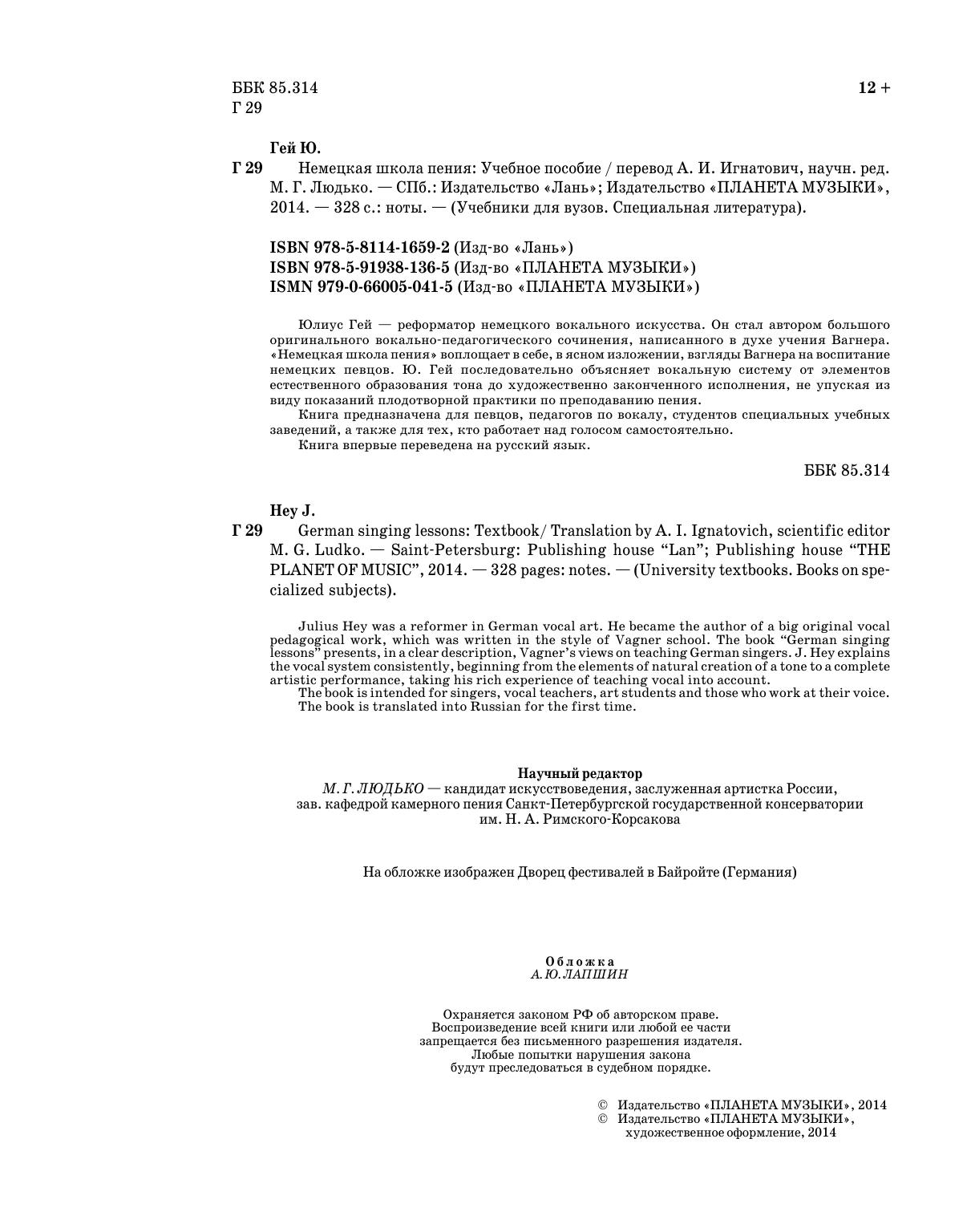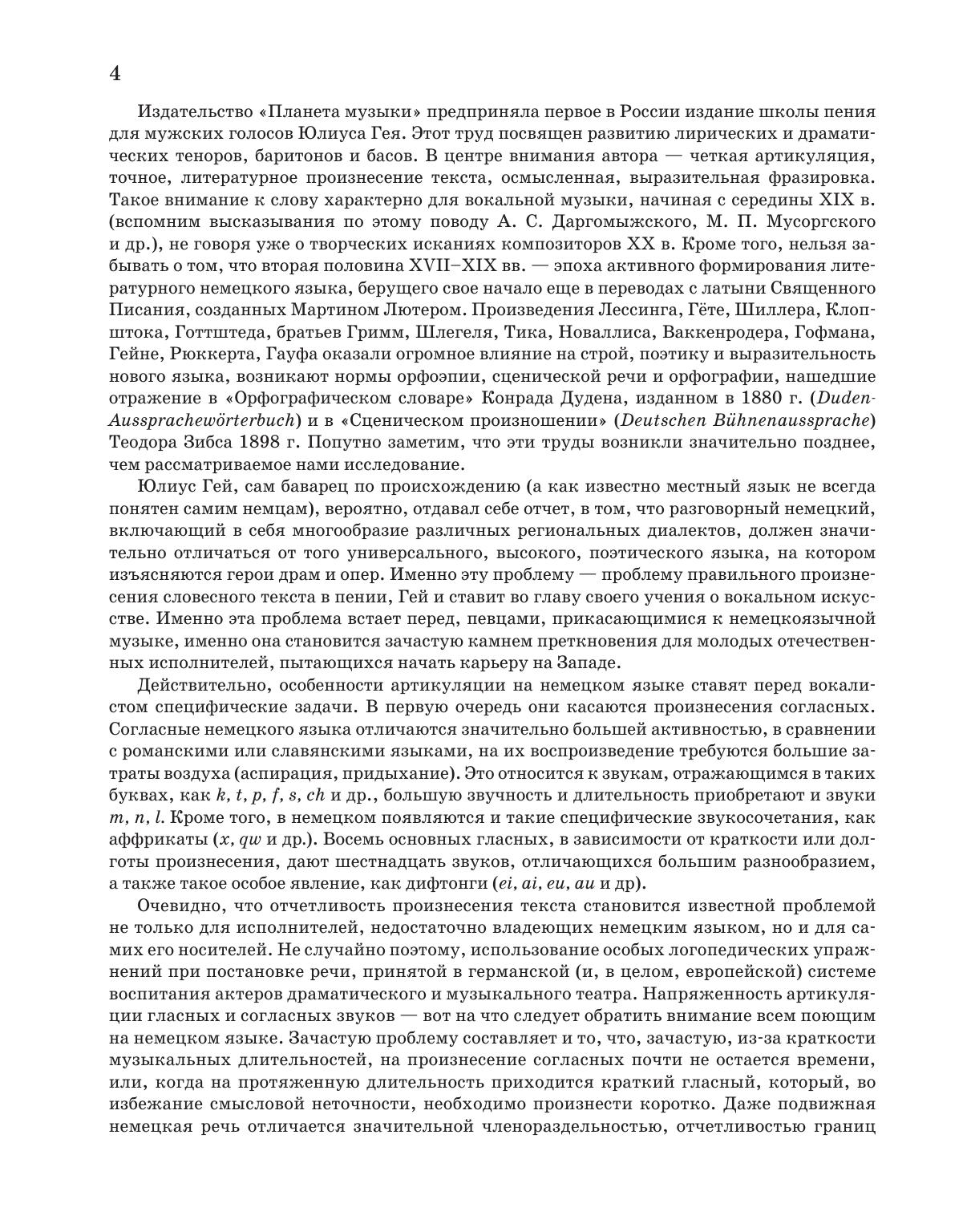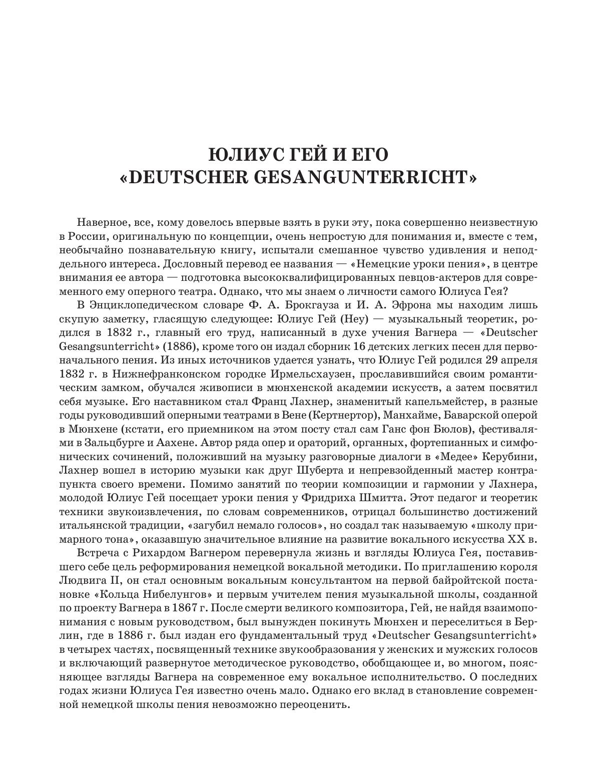 Julius Hey was a reformer in German vocal art. He became the author of a big original vocal pedagogical work, which was written in the style of Vagner school. The book “German singing lessons” presents, in a clear description, Vagner’s views on teaching German singers. J. Hey explains the vocal system consistently, beginning from the elements of natural creation of a tone to a complete artistic performance, taking his rich experience of teaching vocal into account. The book is intended for singers, vocal teachers, art students and those who work at their voice. The book is translated into Russian for the first time.