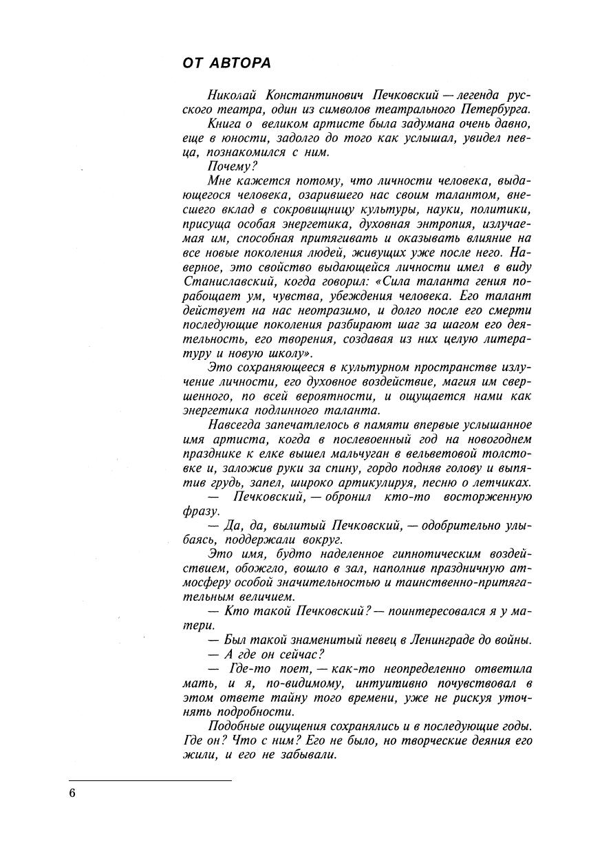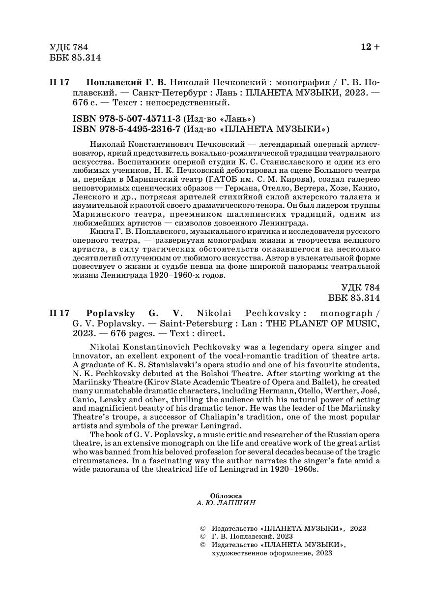 Николай Константинович Печковский — легендарный оперный артист-новатор, яркий представитель вокально-романтической традиции театрального искусства. Воспитанник оперной студии К. С. Станиславского и один из его любимых учеников, Н. К. Печковский дебютировал на сцене Большого театра и, перейдя в Мариинский театр (ГАТОБ им. С. М. Кирова), создал галерею неповторимых сценических образов — Германа, Отелло, Вертера, Хозе, Канио, Ленского и др., потрясая зрителей стихийной силой актерского таланта и изумительной красотой своего драматического тенора. Он был лидером труппы Мариинского театра, преемником шаляпинских традиций, одним из любимейших артистов — символов довоенного Ленинграда. Книга Г. В. Поплавского, музыкального критика и исследователя русского оперного театра, — развернутая монография жизни и творчества великого артиста, в силу трагических обстоятельств оказавшегося на несколько десятилетий отлученным от любимого искусства. Автор в увлекательной форме повествует о жизни и судьбе певца на фоне широкой панорамы театральной жизни Ленинграда 1920–1960-х годов. Nikolai Konstantinovich Pechkovsky was a legendary opera singer and innovator, an exellent exponent of the vocal-romantic tradition of theatre arts. A graduate of K. S. Stanislavski’s opera studio and one of his favourite students, N. K. Pechkovsky debuted at the Bolshoi Theatre. After starting working at the Mariinsky Theatre (Kirov State Academic Theatre of Opera and Ballet), he created many unmatchable dramatic characters, including Hermann, Otello, Werther, José, Canio, Lensky and other, thrilling the audience with his natural power of acting and magnificient beauty of his dramatic tenor. He was the leader of the Mariinsky Theatre’s troupe, a successor of Chaliapin’s tradition, one of the most popular artists and symbols of the prewar Leningrad. The book of G. V. Poplavsky, a music critic and researcher of the Russian opera theatre, is an extensive monograph on the life and creative work of the great artist who was banned from his beloved profession for several decades because of the tragic circumstances. In a fascinating way the author narrates the singer’s fate amid a wide panorama of the theatrical life of Leningrad in 1920–1960s.