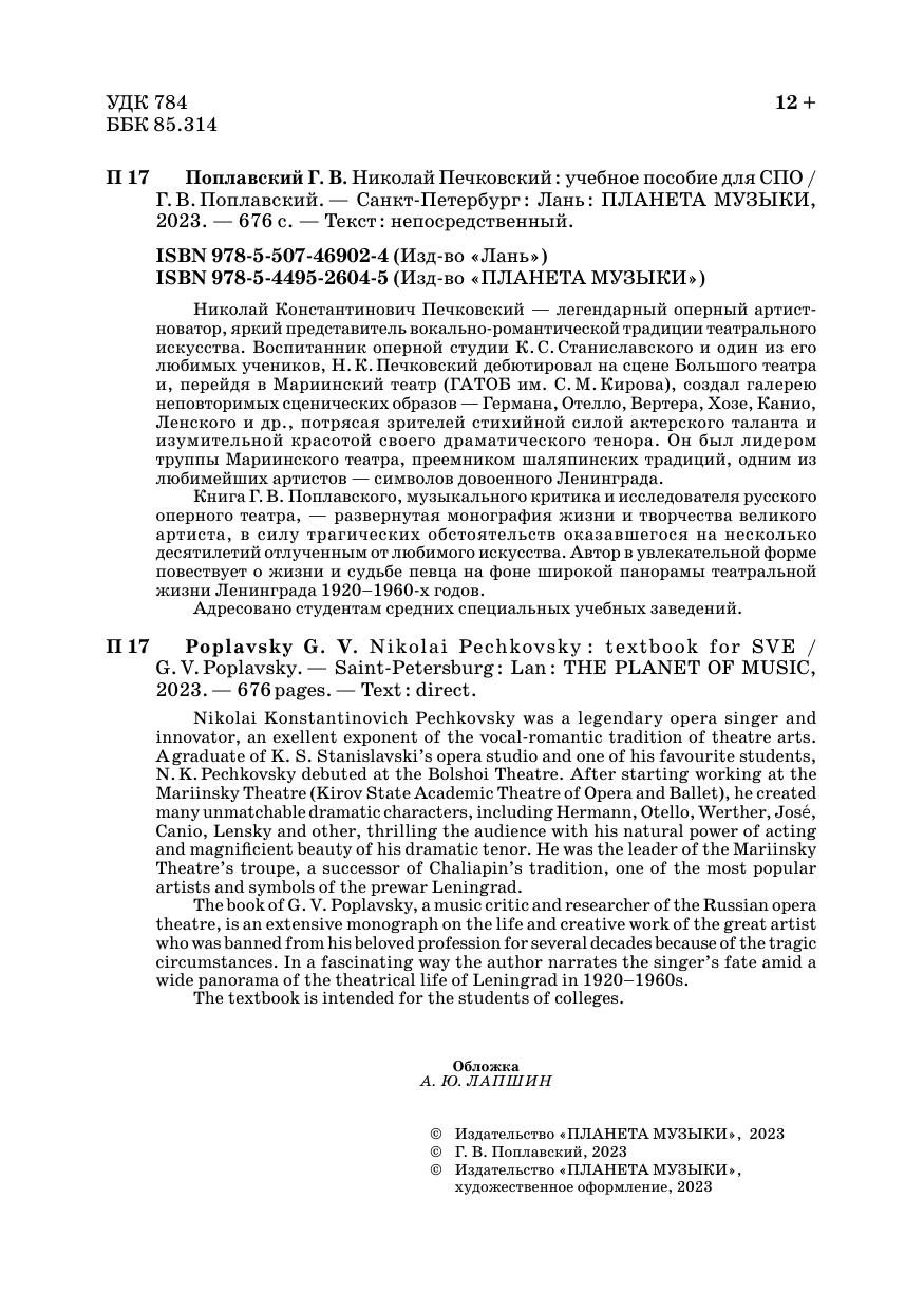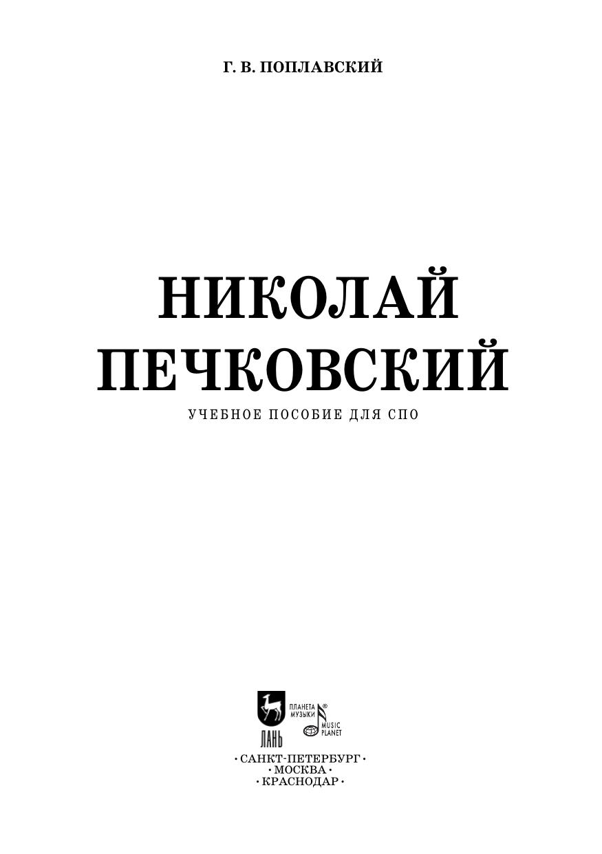 Николай Константинович Печковский — легендарный оперный артист-новатор, яркий представитель вокально-романтической традиции театрального искусства. Воспитанник оперной студии К. С. Станиславского и один из его любимых учеников, Н. К. Печковский дебютировал на сцене Большого театра и, перейдя в Мариинский театр (ГАТОБ им. С. М. Кирова), создал галерею неповторимых сценических образов — Германа, Отелло, Вертера, Хозе, Канио, Ленского и др., потрясая зрителей стихийной силой актерского таланта и изумительной красотой своего драматического тенора. Он был лидером труппы Мариинского театра, преемником шаляпинских традиций, одним из любимейших артистов — символов довоенного Ленинграда. Книга Г. В. Поплавского, музыкального критика и исследователя русского оперного театра, — развернутая монография жизни и творчества великого артиста, в силу трагических обстоятельств оказавшегося на несколько десятилетий отлученным от любимого искусства. Автор в увлекательной форме повествует о жизни и судьбе певца на фоне широкой панорамы театральной жизни Ленинграда 1920–1960-х годов. Адресовано студентам средних специальных учебных заведений. Nikolai Konstantinovich Pechkovsky was a legendary opera singer and innovator, an exellent exponent of the vocal-romantic tradition of theatre arts. A graduate of K. S. Stanislavski’s opera studio and one of his favourite students, N. K. Pechkovsky debuted at the Bolshoi Theatre. After starting working at the Mariinsky Theatre (Kirov State Academic Theatre of Opera and Ballet), he created many unmatchable dramatic characters, including Hermann, Otello, Werther, José, Canio, Lensky and other, thrilling the audience with his natural power of acting and magnificient beauty of his dramatic tenor. He was the leader of the Mariinsky Theatre’s troupe, a successor of Chaliapin’s tradition, one of the most popular artists and symbols of the prewar Leningrad. The book of G. V. Poplavsky, a music critic and researcher of the Russian opera theatre, is an extensive monograph on the life and creative work of the great artist who was banned from his beloved profession for several decades because of the tragic circumstances. In a fascinating way the author narrates the singer’s fate amid a wide panorama of the theatrical life of Leningrad in 1920–1960s. The textbook is intended for the students of colleges.
