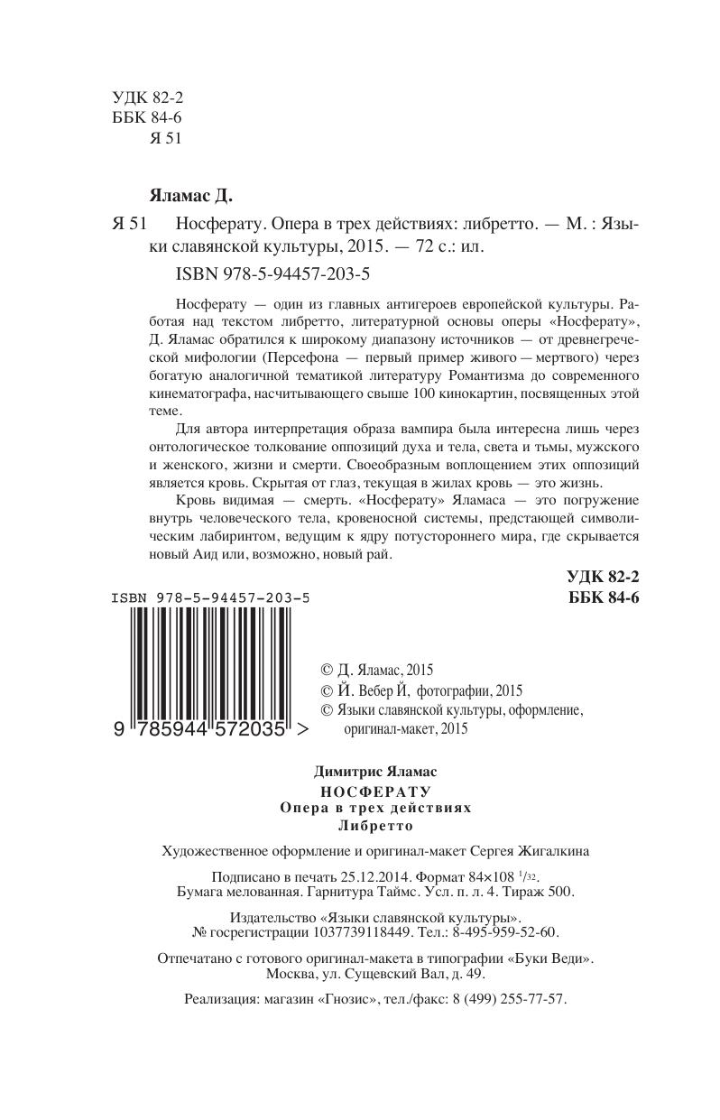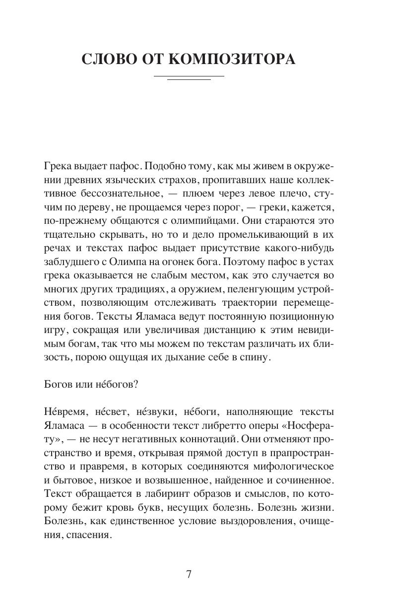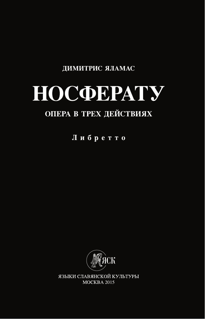Носферату — один из главных антигероев европейской культуры. Работая над текстом либретто, литературной основы оперы «Носферату», Д. Яламас обратился к широкому диапазону источников — от древнегреческой мифологии (Персефона — первый пример живого — мертвого) через богатую аналогичной тематикой литературу Романтизма до современного кинематографа, насчитывающего свыше 100 кинокартин, посвященных этой теме. Для автора интерпретация образа вампира была интересна лишь через онтологическое толкование оппозиций духа и тела, света и тьмы, мужского и женского, жизни и смерти. Своеобразным воплощением этих оппозиций является кровь. Скрытая от глаз, текущая в жилах кровь — это жизнь. Кровь видимая — смерть. «Носферату» Яламаса — это погружение внутрь человеческого тела, кровеносной системы, предстающей символическим лабиринтом, ведущим к ядру потустороннего мира, где скрывается новый Аид или, возможно, новый рай.