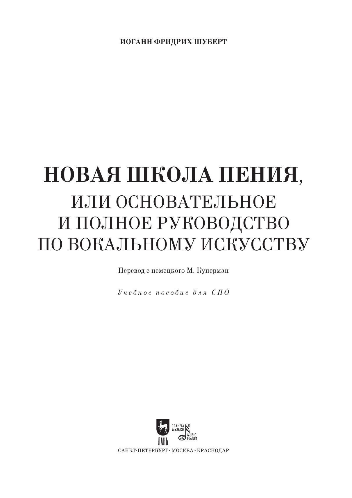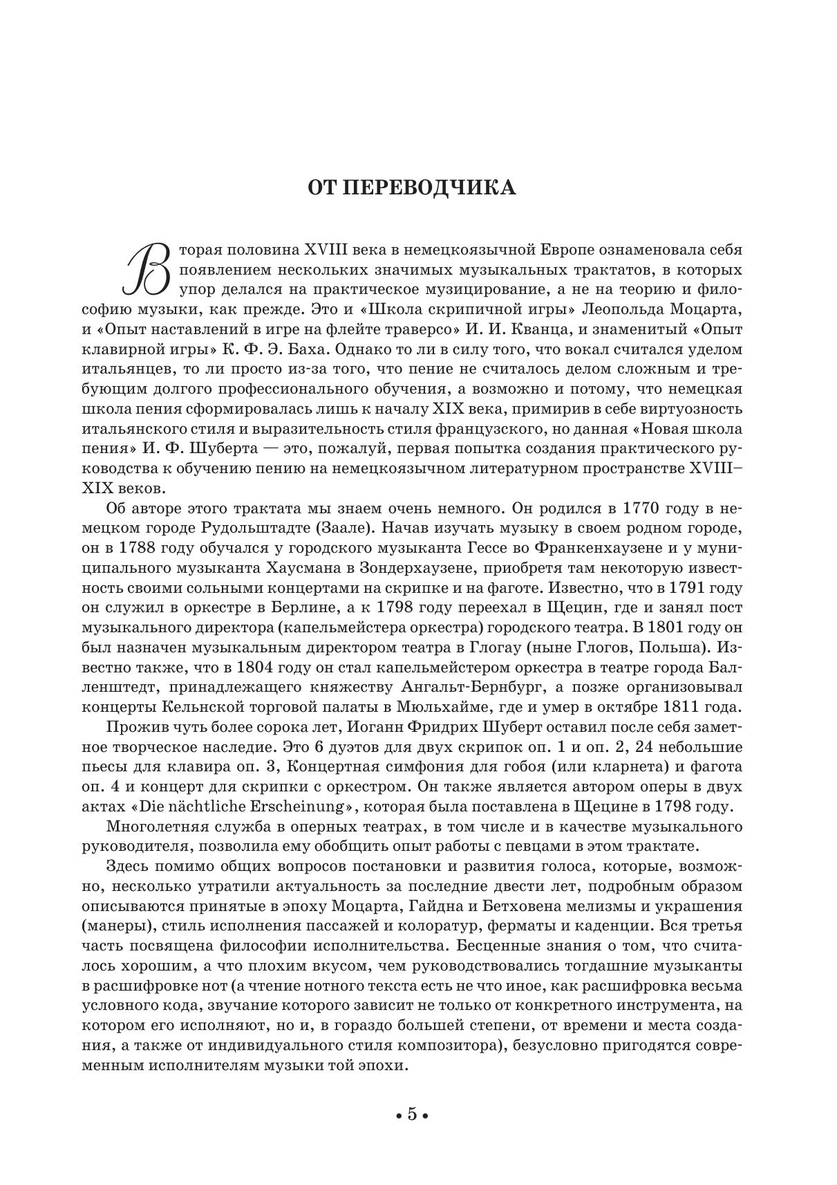 «Новая школа пения или основательное и полное руководство по вокальному искусству» И. Ф. Шуберта — это первый практический учебника вокала на немецком языке, описывающий технику и стиль пения в конце 18-го — начале 19-го века. Немецкий стиль (или вкус, как он тогда назывался) соединил в себе виртуозность итальянского и выразительность французского пения. Впервые переведенный на русский язык, данный трактат будет просто необходим всем певцам и музыкантам иных профессий, желающих разобраться в тонкостях исполнения музыки Моцарта, Гайдна, Бетховена и их современником.