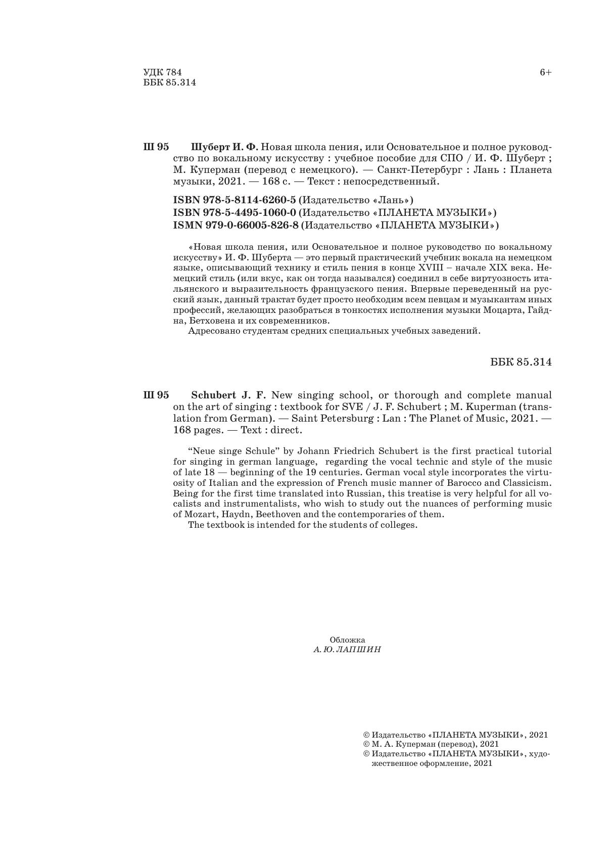 «Neue singe Schule» by Johann Friedrich Schubert is the first practical tutorial for singing in german language, regarding the vocal technic and style of the music of late 18 — beginning of the 19 centuries. German vocal style incorporates the virtuosity of Italian and the expression of French music manner of Barocco and Classicism. Being for the first time translated into Russian, this treatise is very helpful for all vocalists and instrumentalists, who wish to study out the nuances of performing music of Mozart, Haydn, Beethoven and the contemporaries of them.