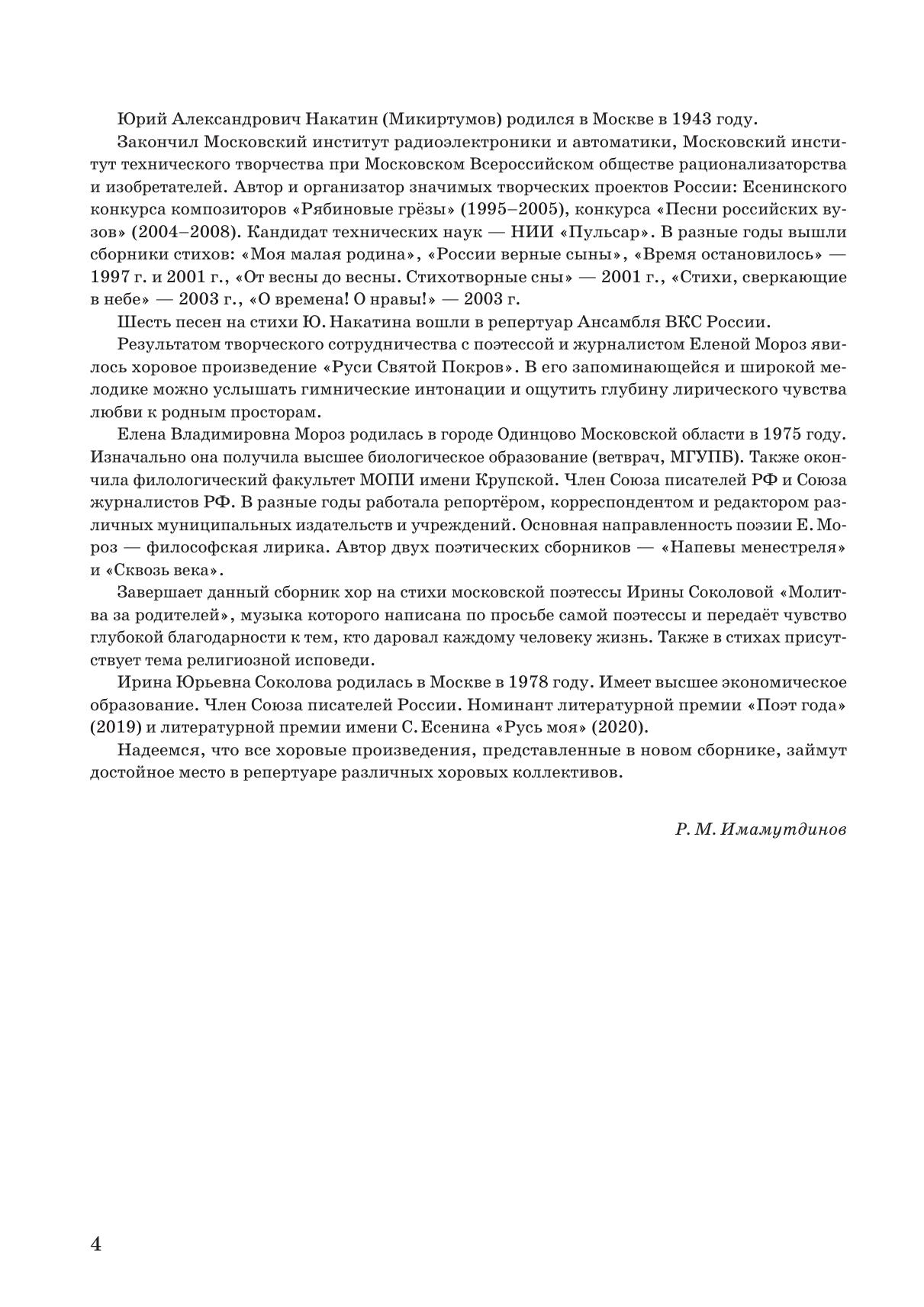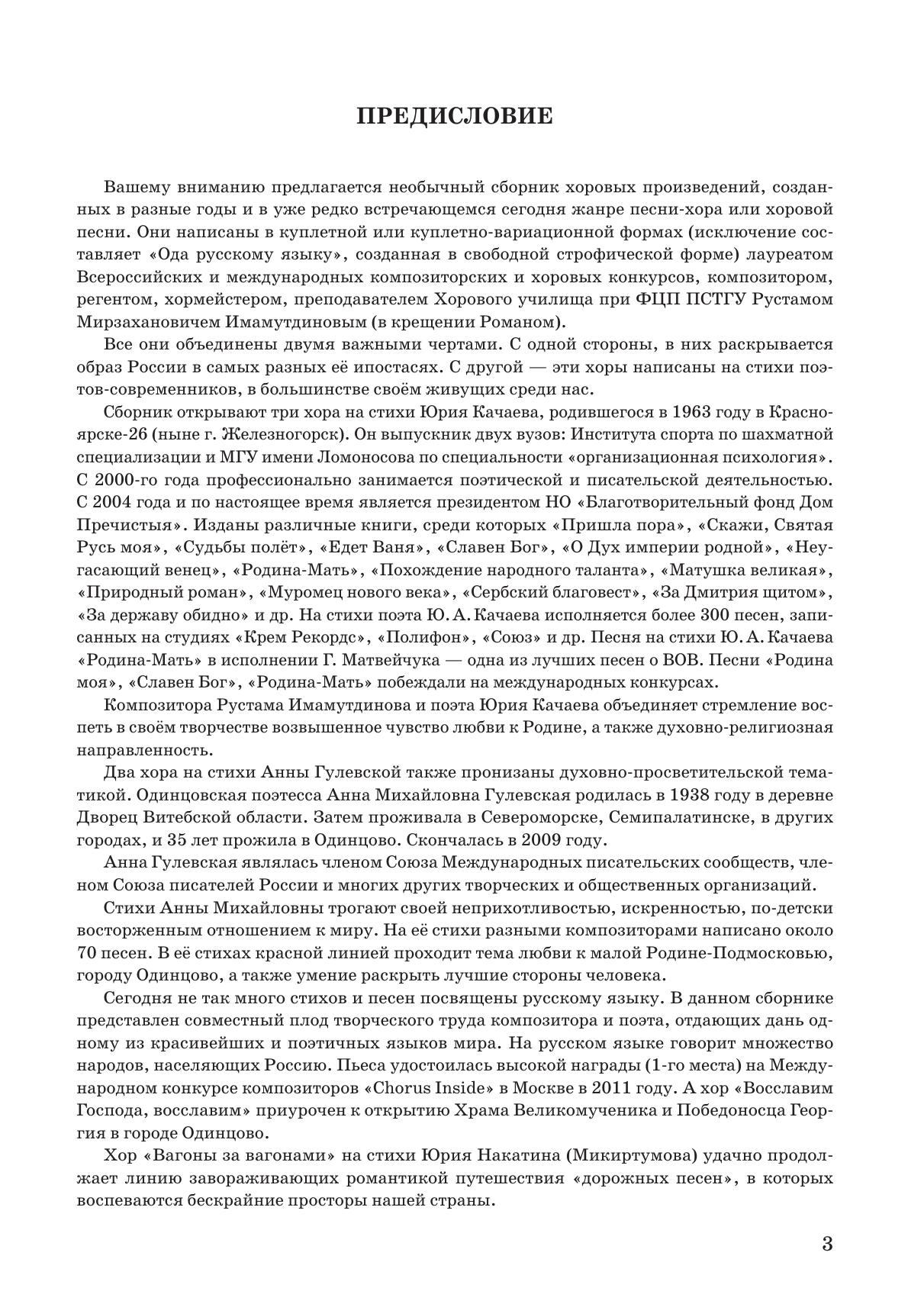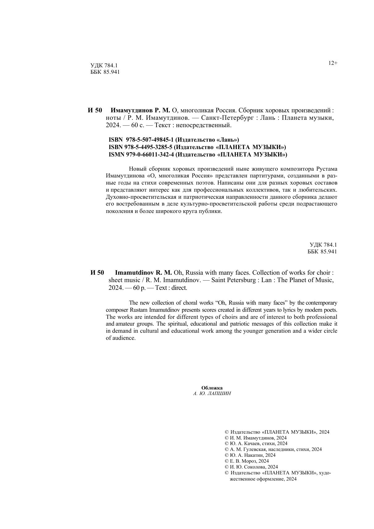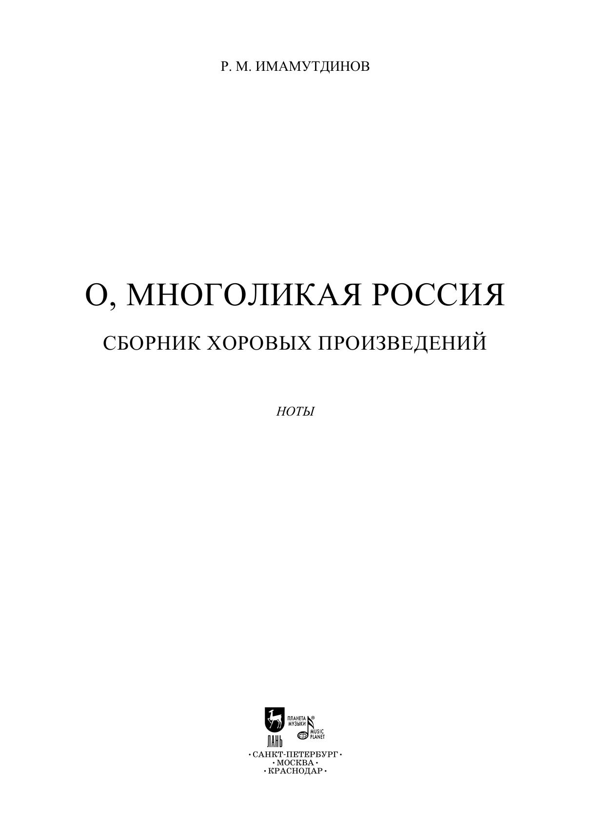 Новый сборник хоровых произведений ныне живущего композитора Рустама Имамутдинова "О, многоликая Россия!" представлен партитурами, созданными в разные годы на стихи современных поэтов. Написаны они для разных хоровых составов и представляют интерес как для профессиональных коллективов, так и любительских. Духовно-просветительская и патриотическая направленности данного сборника делают его востребованным в деле культурно-просветительской работы среди подрастающего поколения и более широкого круга публики. The new collection of choral works “Oh, Russia with many faces” by the contemporary composer Rustam Imamutdinov presents scores created in different years to lyrics by modern poets. The works are intended for different types of choirs and are of interest to both professional and amateur groups. The spiritual, educational and patriotic messages of this collection make it in demand in cultural and educational work among the younger generation and a wider circle of audience.