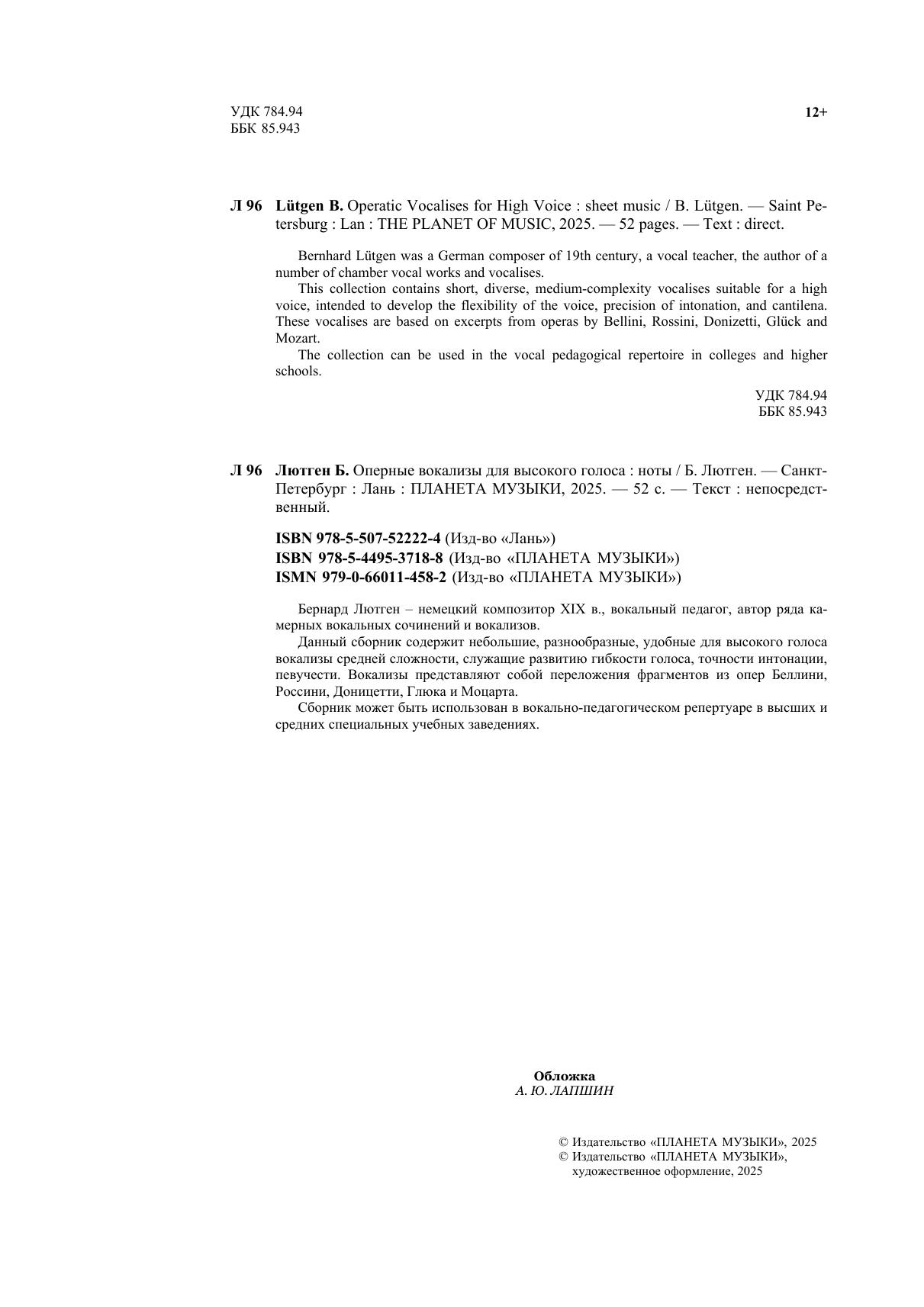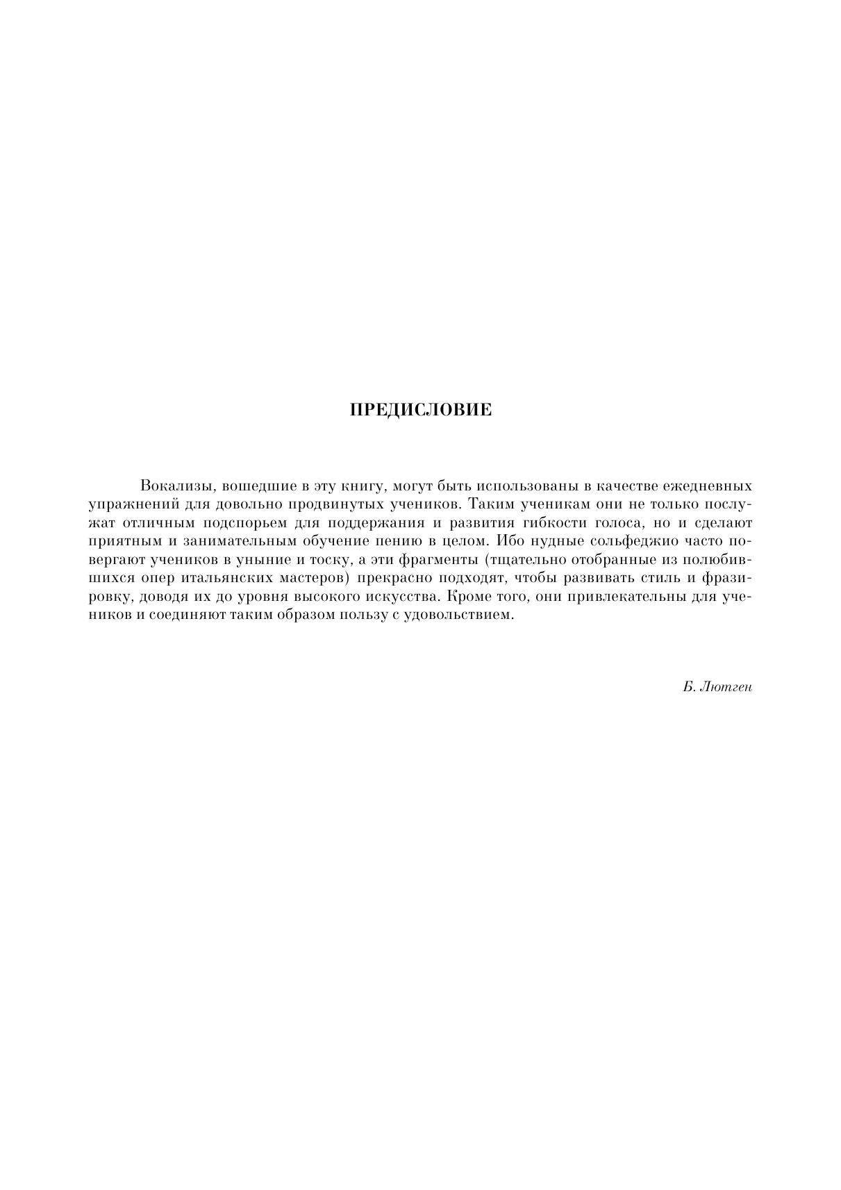 Бернард Лютген – немецкий композитор XIX в., вокальный педагог, автор ряда ка-мерных вокальных сочинений и вокализов. Данный сборник содержит небольшие, разнообразные, удобные для высокого голоса вокализы средней сложности, служащие развитию гибкости голоса, точности интонации, певучести. Вокализы представляют собой переложения фрагментов из опер Беллини, Россини, Доницетти, Глюка и Моцарта. Сборник может быть использован в вокально-педагогическом репертуаре в высших и средних специальных учебных заведениях. Bernhard Lütgen was a German composer of 19th century, a vocal teacher, the author of a number of chamber vocal works and vocalises. This collection contains short, diverse, medium-complexity vocalises suitable for a high voice, intended to develop the flexibility of the voice, precision of intonation, and cantilena. These vocalises are based on excerpts from operas by Bellini, Rossini, Donizetti, Glück and Mozart. The collection can be used in the vocal pedagogical repertoire in colleges and higher schools.