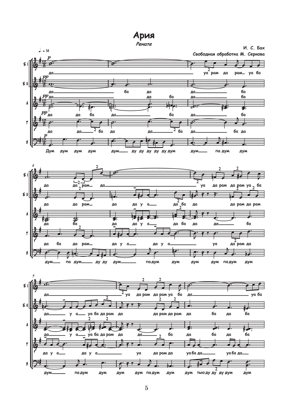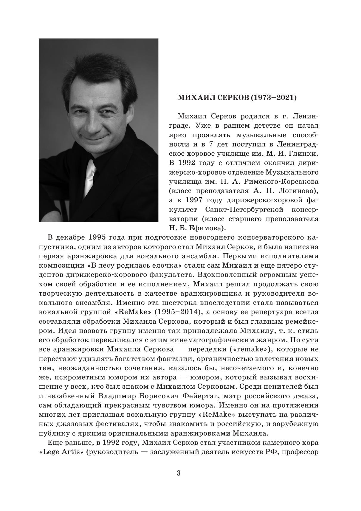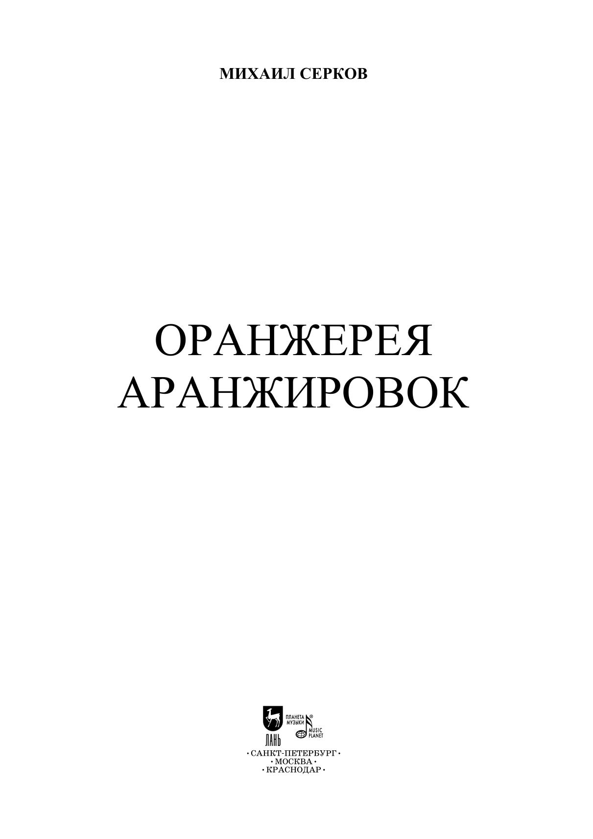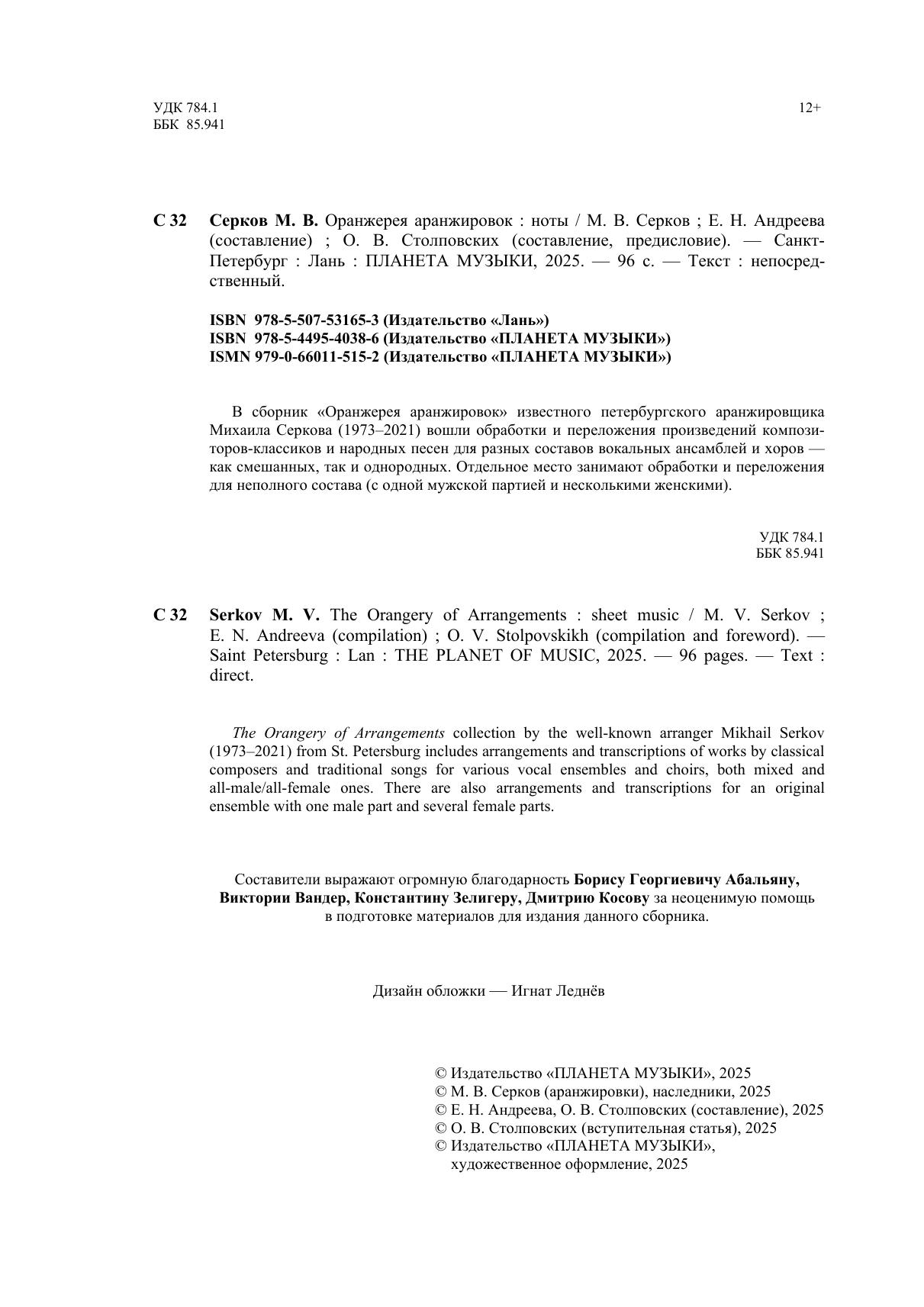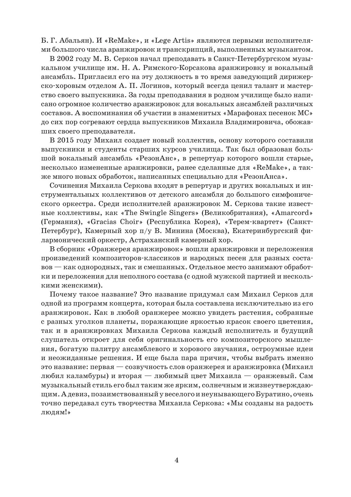 В сборник «Оранжерея аранжировок» известного петербургского аранжировщика Михаила Серкова (1973-2021) вошли обработки и переложения произведений композиторов-классиков и народных песен для разных составов вокальных ансамблей и хоров – как смешанных, так и однородных. Отдельное место занимают обработки и переложения для неполного состава (с одной мужской партией и несколькими женскими). The Orangery of Arrangements collection by the well-known arranger Mikhail Serkov (1973–2021) from St. Petersburg includes arrangements and transcriptions of works by classical composers and traditional songs for various vocal ensembles and choirs, both mixed and all-male/all-female ones. There are also arrangements and transcriptions for an original ensemble with one male part and several female parts.