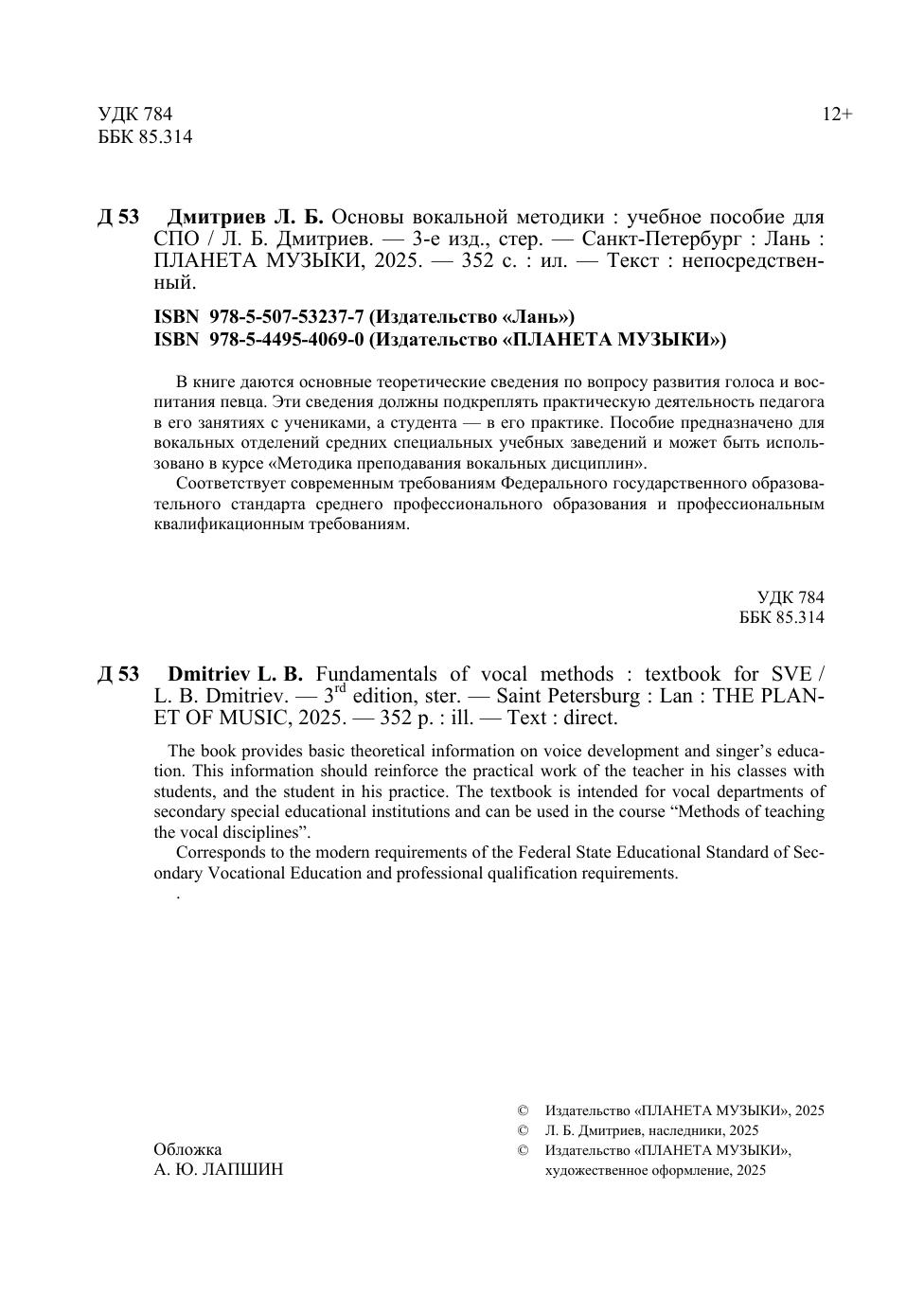 В книге даются основные теоретические сведения по вопросу развития голоса и воспитания певца. Эти сведения должны подкреплять практическую деятельность педагога в его занятиях с учениками, а студента — в его практике. Пособие предназначено для вокальных отделений средних специальных учебных заведений и может быть использовано в курсе "Методика преподавания вокальных дисциплин". The book provides basic theoretical information on voice development and singer’s education. This information should reinforce the practical work of the teacher in his classes with students, and the student in his practice. The manual is intended for vocal departments of secondary special educational institutions and can be used in the course "Methods of vocal disciplines teaching".