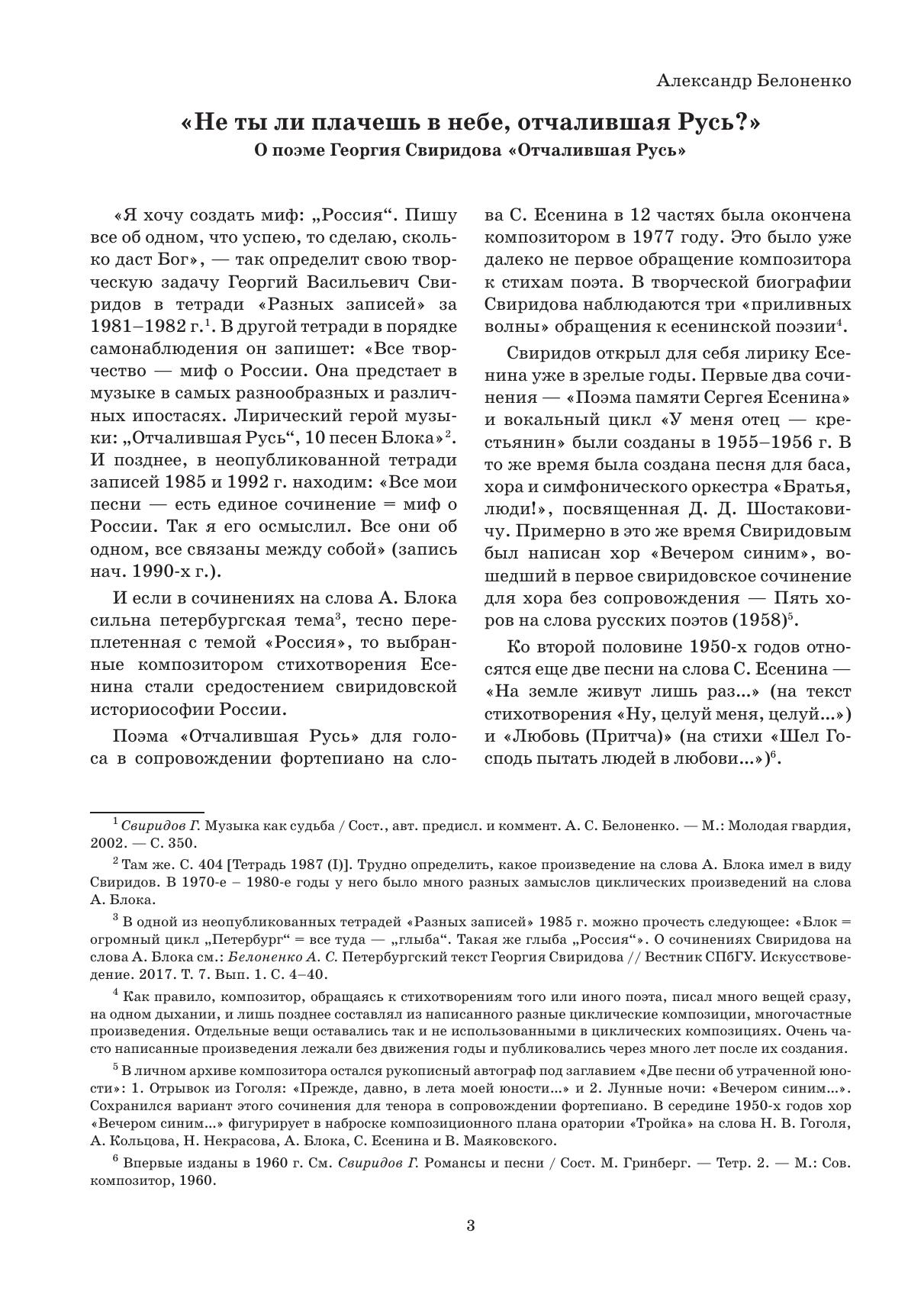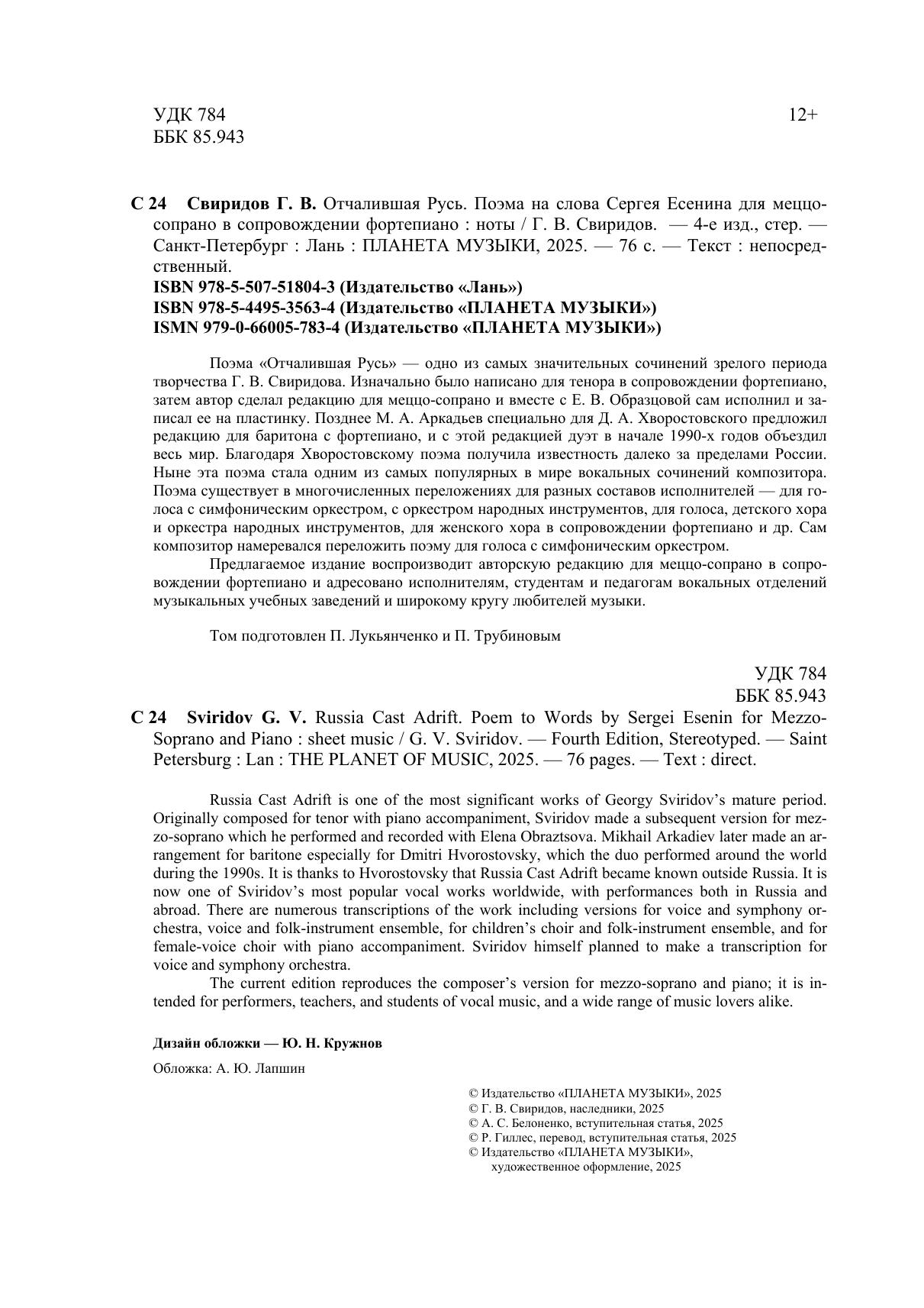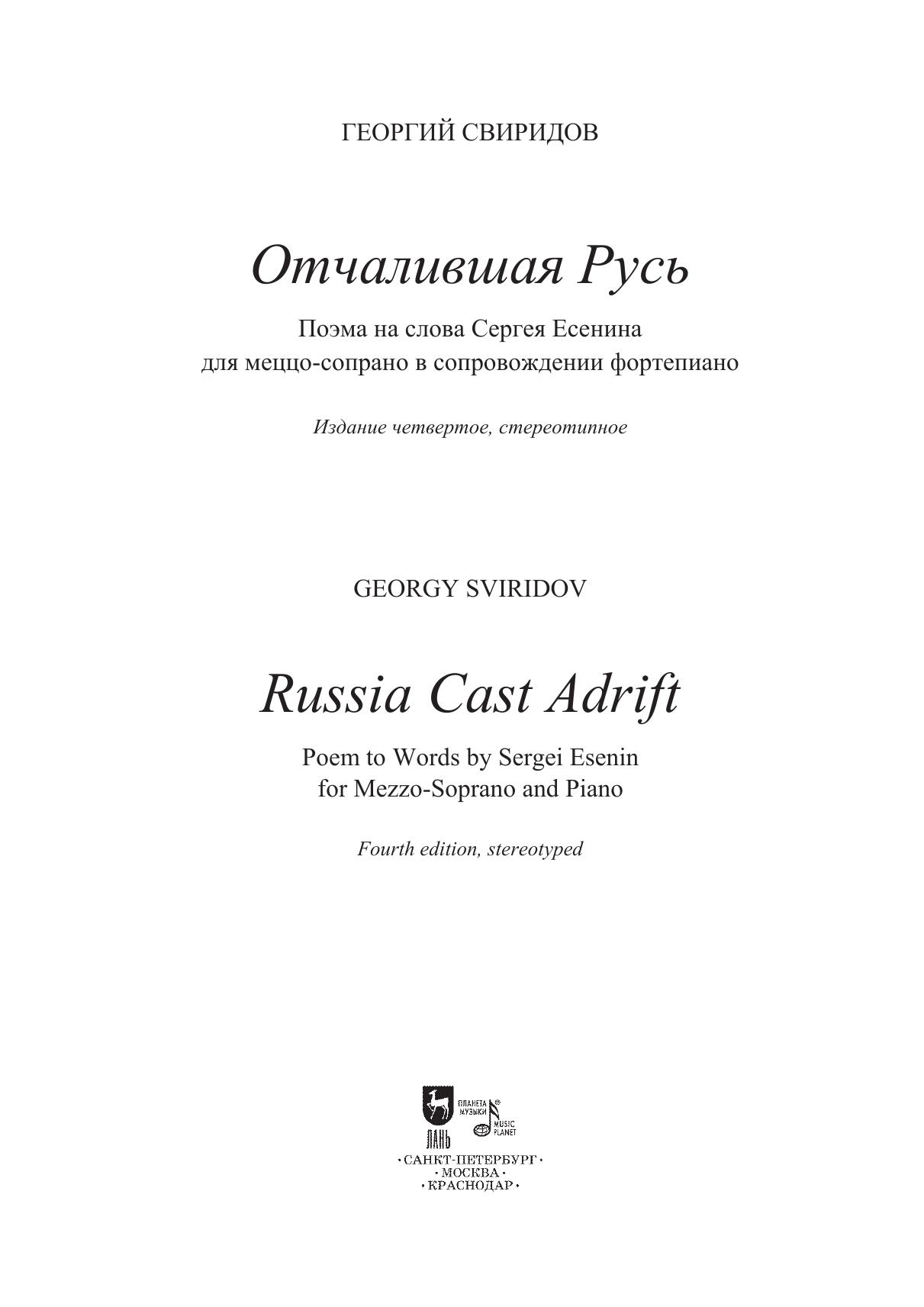 Поэма «Отчалившая Русь» – одно из самых значительных сочинений зрелого периода творчества Г. В. Свиридова. Впервые созданное для тенора, затем автор сделал редакцию для меццо-сопрано и вместе с Еленой Образцовой сам исполнил и записал ее на пластинку. Позднее М. Аркадьев специально для Дм. Хворостовского предложил редакцию для баритона с фортепиано и с этой редакцией дуэт в начале 1990-х годов объездил весь мир. Благодаря Хворостовскому поэма получила известность далеко за пределами России. Ныне эта поэма стала одним из самых популярных вокальных сочинений композитора. Оно исполняется как в России, так и за ее пределами. Существует многочисленные переложения поэмы для разного рода составов исполнителей, от переложений для голоса с симфоническим оркестром до оркестра или ансамбля народных инструментов, солиста и женского хора. Сам композитор намеревался положить поэму для голоса с симфоническим оркестром. Предлагаемое издание воспроизводит авторскую редакцию для меццо-сопрано в сопровождении фортепиано и адресовано для исполнителей, студентов и педагогов вокальных отделений музыкальных учебных заведений и широкого круга любителей музыки.