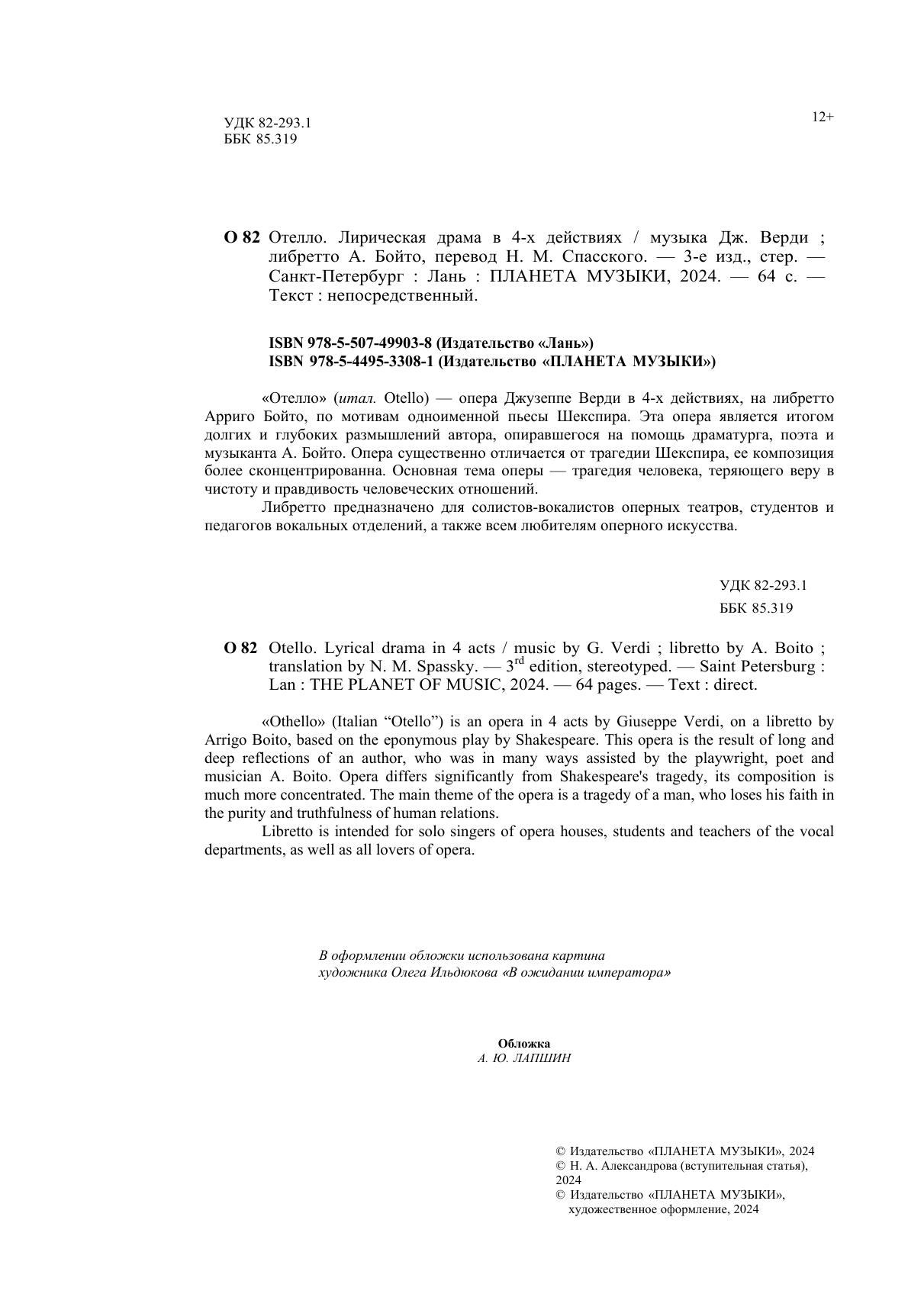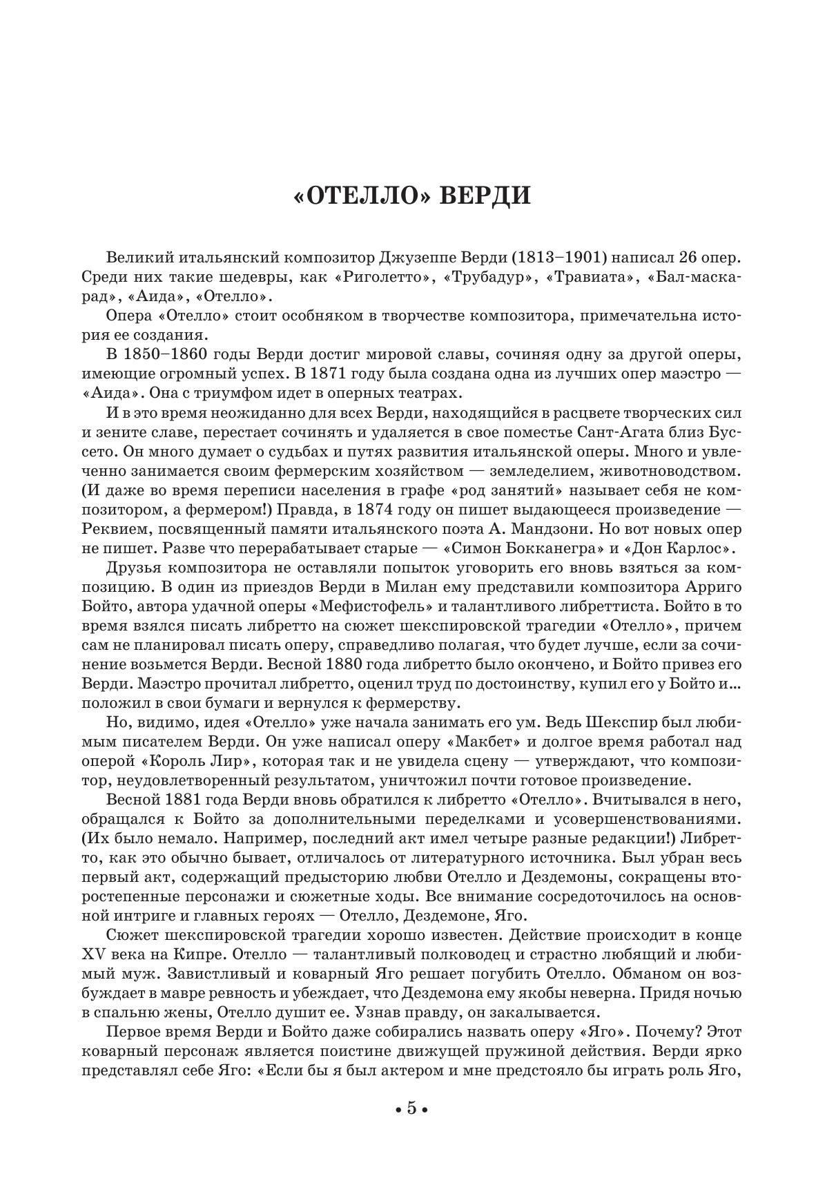 Отелло (итал. Otello) - опера Джузеппе Верди в 4-х действиях, на либретто Арриго Бойто, по мотивам одноименной пьесы Шекспира. Эта опера является итогом долгих и глубоких размышлений автора, опиравшегося на помощь драматурга, поэта и музыканта А. Бойто. Опера существенно отличается от трагедии Шекспира, ее композиция более сконцентрированна. Основная тема оперы - трагедия человека, теряющего веру в чистоту и правдивость человеческих отношений. Либретто предназначено для солистов-вокалистов оперных театров, студентов и педагогов вокальных отделений, а также всем любителям оперного искусства.