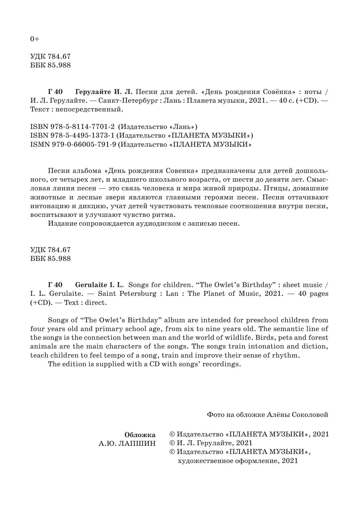 Songs of “The Owlet's Birthday” album are intended for preschool children from four years old and primary school age, from six to nine years old. The semantic line of the songs is the connection between man and the world of wildlife. Birds, pets and forest animals are the main characters of the songs. The songs train intonation and diction, teach children to feel tempo of a song, train and improve their sense of rhythm.