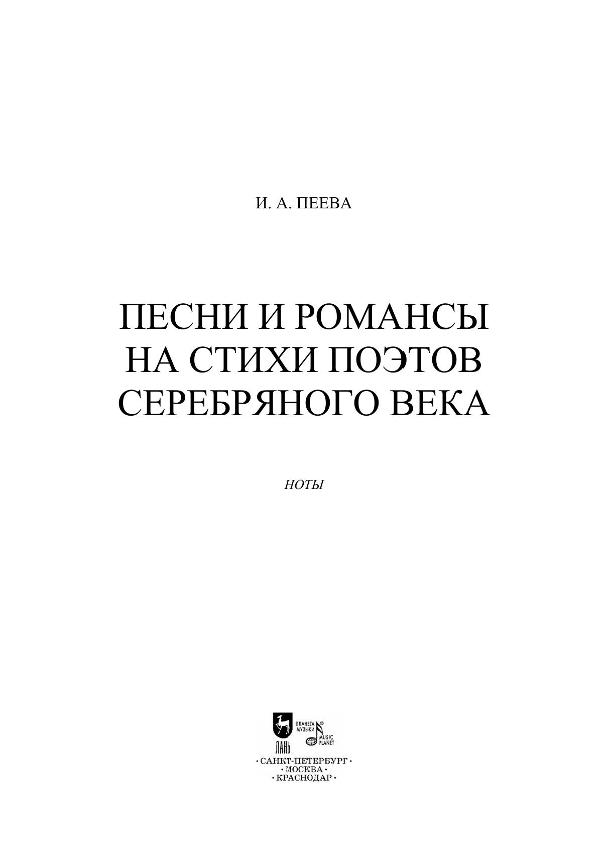 Сборник включает произведения для голоса (сопрано, тенор, баритон) и фортепиано, написанные петербургским композитором Ириной Пеевой на стихи поэтов Серебряного века: А. А. Ахматовой, К. Д. Бальмонта, Н. С. Гумилёва, М. А. Кузмина, В. В. Маяковского и Д. С. Мережковского. Романсы и песни были созданы для мистической оперы «Поющие призраки», премьера которой состоялась в 2004 году на сцене театра-фестиваля «Балтийский Дом» (Санкт-Петербург). Издание адресовано студентам музыкальных училищ, творческих вузов, профессионалам, любителям вокальной музыки. The collection includes works for voice (soprano, tenor, baritone) and piano, written by the composer Irina Peeva (St. Petersburg) to verses by poets of the Silver Age: A. A. Akhmatova, K. D. Balmont, N. S. Gumilev, M. A. Kuzmin, V. V. Mayakovsky and D. S. Merezhkovsky. The romances and songs were written for “The Singing Ghosts” mystical opera, the premiere of which took place in 2004 at the Baltic House Theatre Festival (St. Petersburg). The edition is addressed to students of music colleges, higher schools of arts, professional performers, lovers of vocal music.
