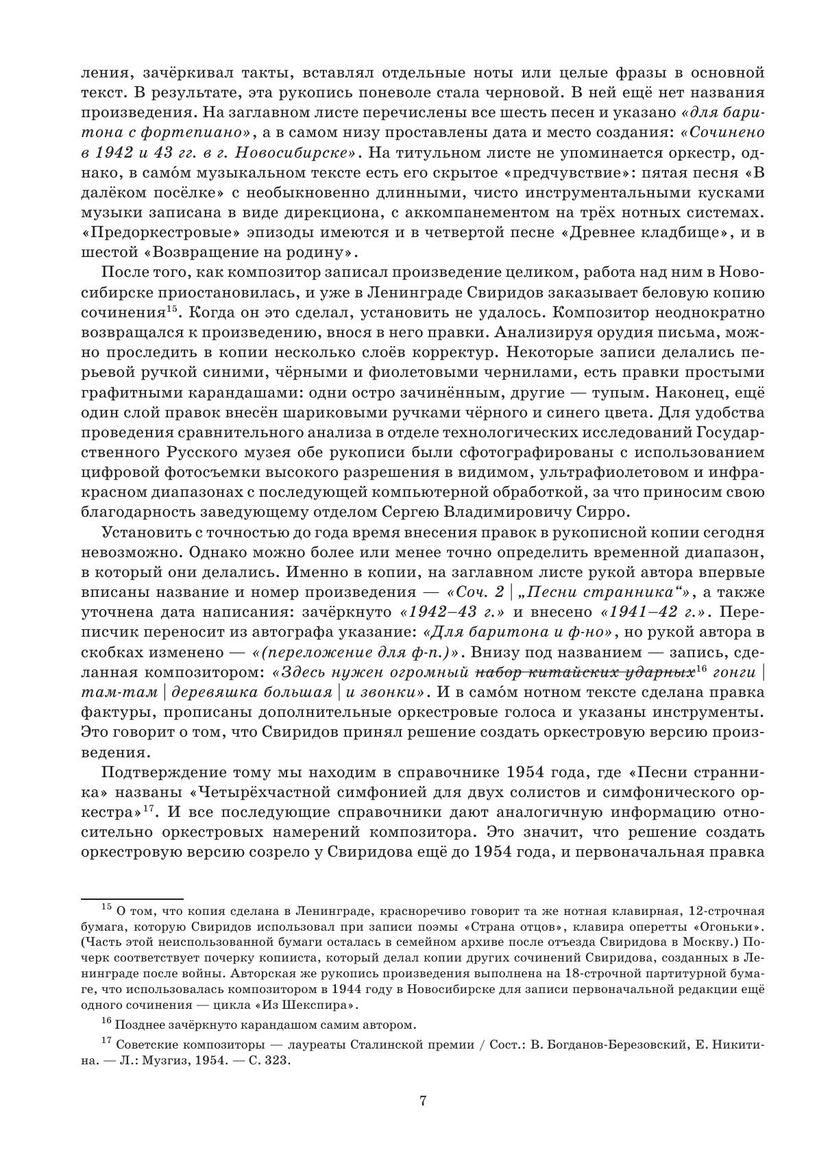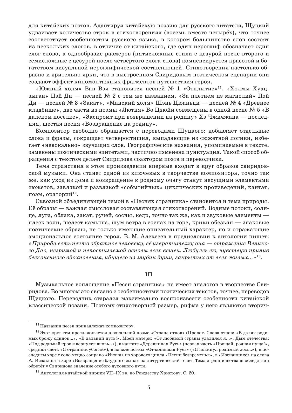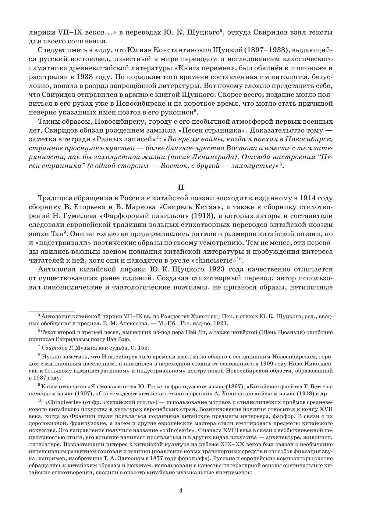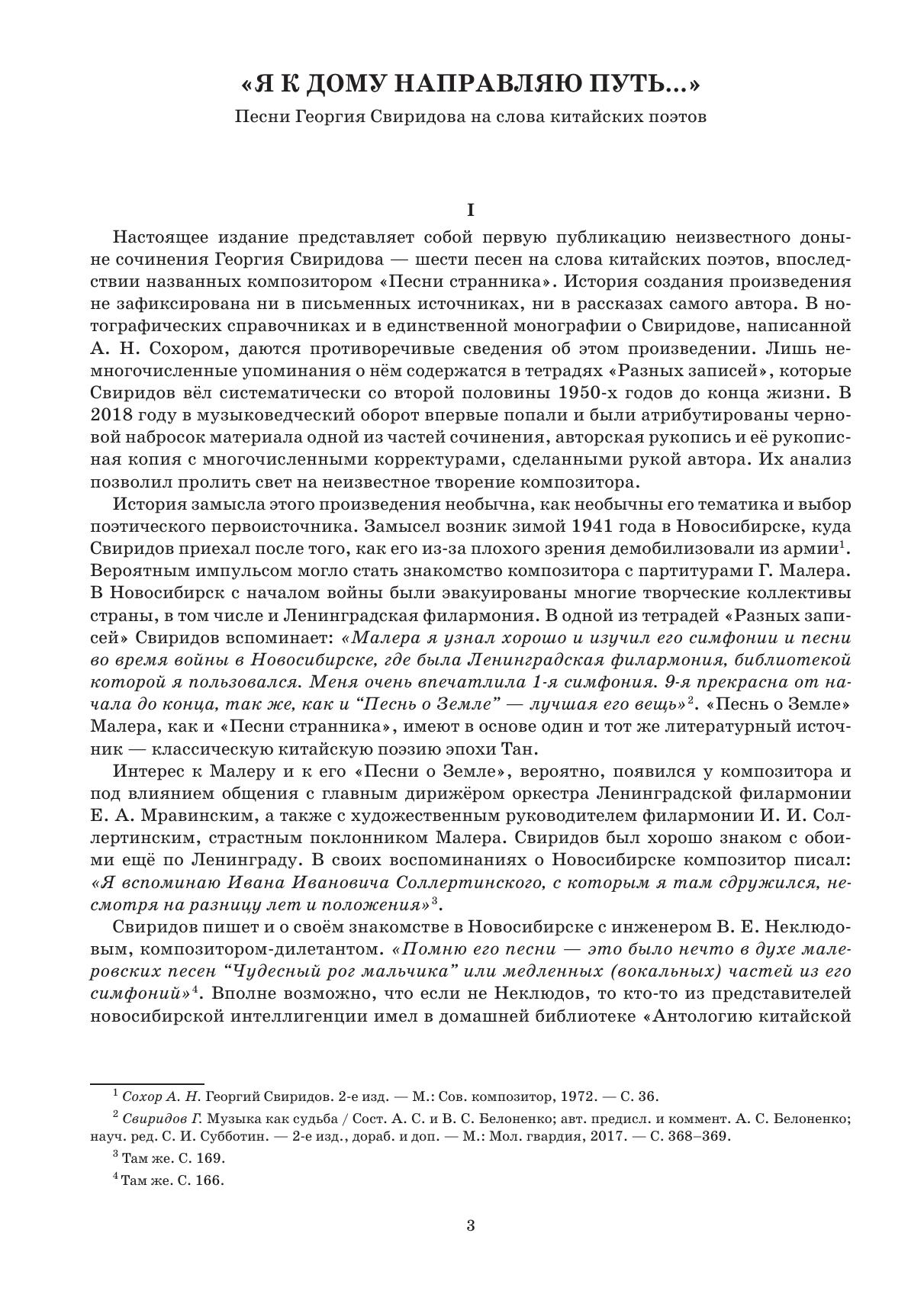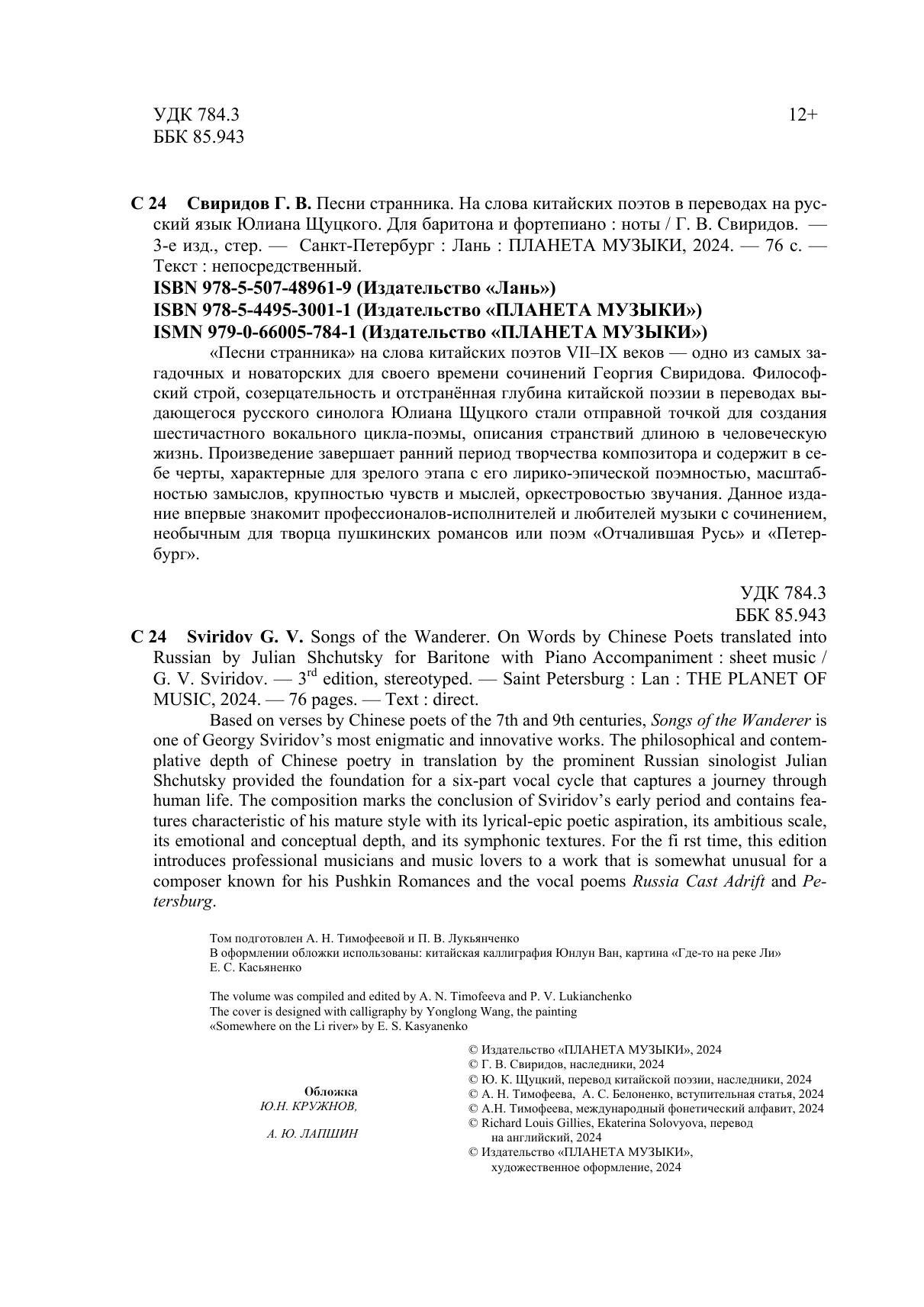 «Песни странника» на слова китайских поэтов VII–IX веков — одно из самых загадочных и новаторских для своего времени сочинений Георгия Свиридова. Философский строй, созерцательность и отстранённая глубина китайской поэзии в переводах выдающегося русского синолога Юлиана Щуцкого стали отправной точкой для создания шестичастного вокального цикла-поэмы, описания странствий длиною в человеческую жизнь. Произведение завершает ранний период творчества композитора и содержит в себе черты, характерные для зрелого этапа с его лирико-эпической поэмностью, масштабностью замыслов, крупностью чувств и мыслей, оркестровостью звучания. Данное издание впервые знакомит профессионалов-исполнителей и любителей музыки с сочинением, необычным для творца пушкинских романсов или поэм «Отчалившая Русь» и «Петербург». Based on verses by Chinese poets of the 7th and 9th centuries, Songs of the Wanderer is one of Georgy Sviridov’s most enigmatic and innovative works. The philosophical and contemplative depth of Chinese poetry in translation by the prominent Russian sinologist Julian Shchutsky provided the foundation for a six-part vocal cycle that captures a journey through human life. The composition marks the conclusion of Sviridov’s early period and contains features characteristic of his mature style with its lyrical-epic poetic aspiration, its ambitious scale, its emotional and conceptual depth, and its symphonic textures. For the fi rst time, this edition introduces professional musicians and music lovers to a work that is somewhat unusual for a composer known for his Pushkin Romances and the vocal poems Russia Cast Adrift and Petersburg.