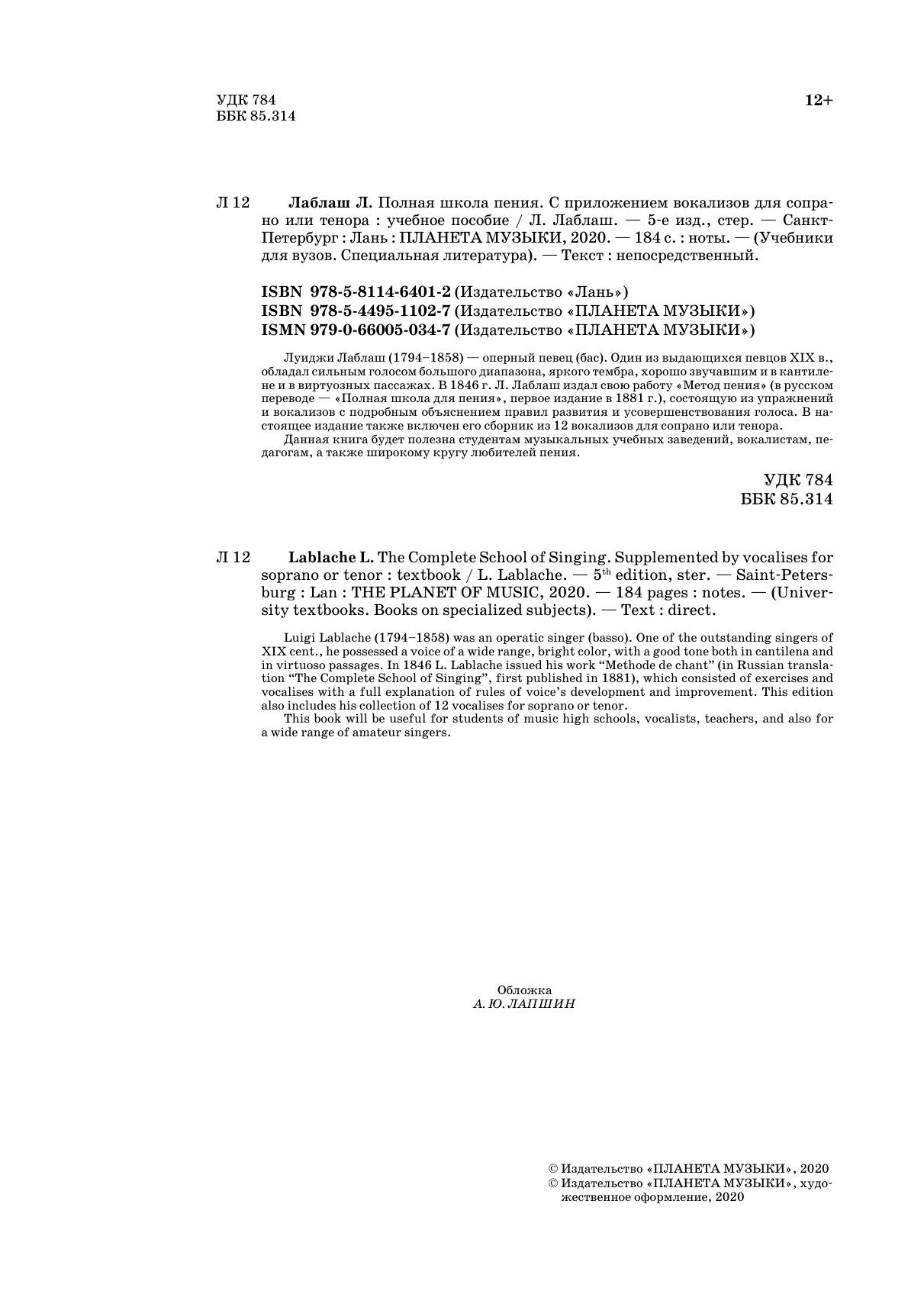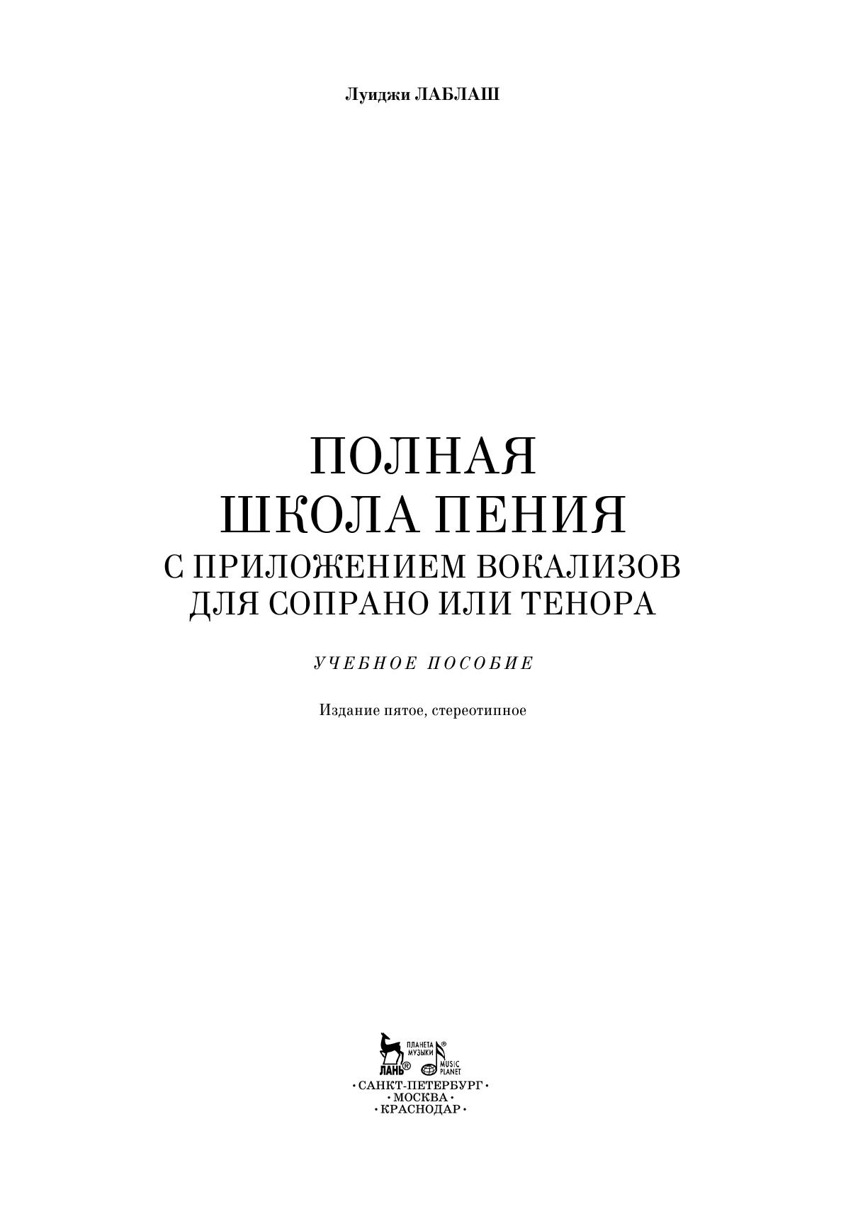 Луиджи Лаблаш (1794–1858) — оперный певец (бас). Один из выдающихся певцов XIX в., обладал сильным голосом большого диапазона, яркого тембра, хорошо звучавшим и в кантилене и в виртуозных пассажах. В 1846 г. Л. Лаблаш издал свою работу «Метод пения» (в русском переводе — «Полная школа для пения», первое издание в 1881 г.), состоящую из упражнений и вокализов с подробным объяснением правил развития и усовершенствования голоса. В настоящее издание также включен его сборник из 12 вокализов для сопрано или тенора.