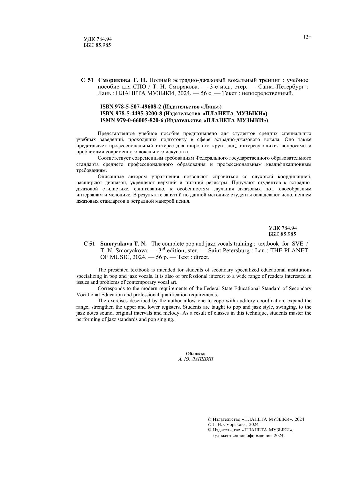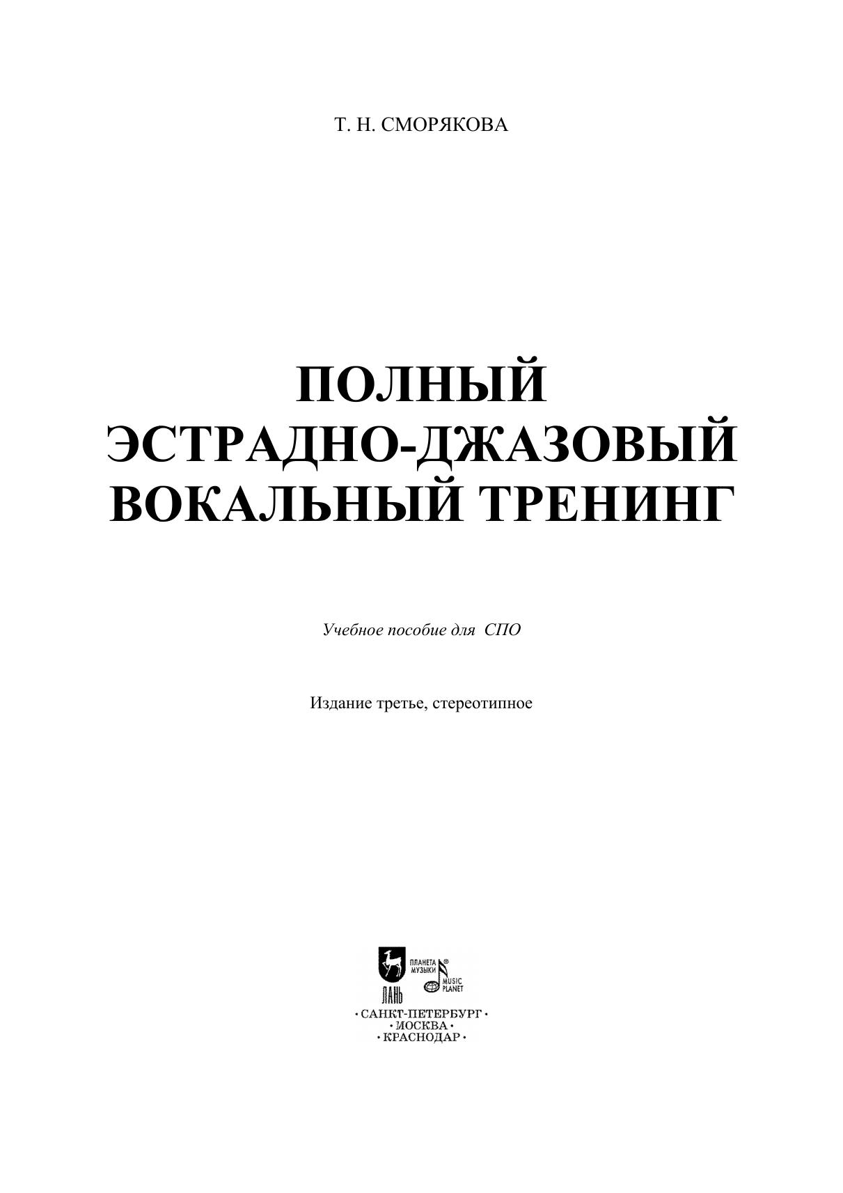 Представленное учебное пособие предназначено для студентов средних специальных учебных заведений, проходящих подготовку в сфере эстрадно-джазового вокала. Она также представляет профессиональный интерес для широкого круга лиц, интересующихся вопросами и проблемами современного вокального искусства. Описанные автором упражнения позволяют справиться со слуховой координацией, расширяют диапазон, укрепляю верхний и нижний регистры. Приучают студентов к эстрадно-джазовой стилистике, свингованию, к особенностям звучания джазовых нот, своеобразным интервалам и мелодике. В результате занятий по данной методике студенты овладевают исполнением джазовых стандартов и эстрадной манерой пения. The presented textbook is intended for students of secondary specialized educational institutions specializing in pop and jazz vocals. It is also of professional interest to a wide range of readers interested in issues and problems of contemporary vocal art. The exercises described by the author allow one to cope with auditory coordination, expand the range, strengthen the upper and lower registers. Students are taught to pop and jazz style, swinging, to the jazz notes sound, original intervals and melody. As a result of classes in this technique, students master the performing of jazz standards and pop singing.