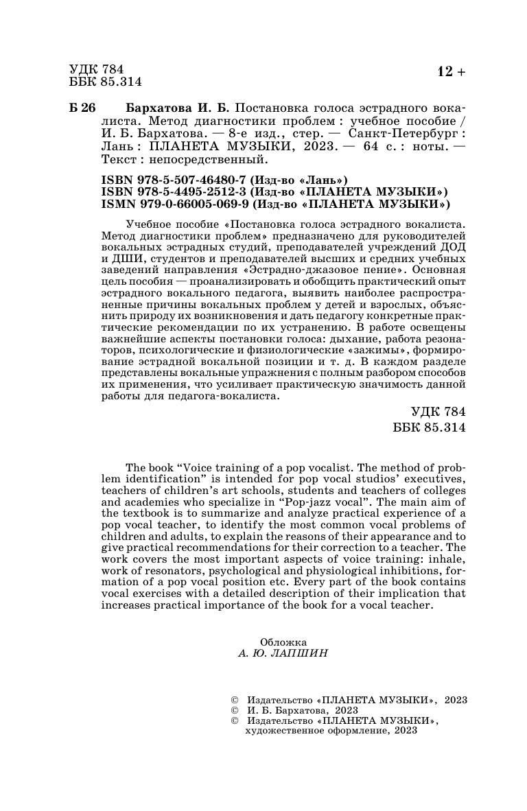Учебное пособие «Постановка голоса эстрадного вокалиста. Метод диагностики проблем» предназначено для руководителей вокальных эстрадных студий, преподавателей учреждений ДОД и ДШИ, студентов и преподавателей высших и средних учебных заведений направления «эстрадно-джазовое пение». Основная цель пособия — проанализировать и обобщить практический опыт эстрадного вокального педагога, выявить наиболее распространенные причины вокальных проблем у детей и взрослых, объяснить природу их возникновения и дать педагогу конкретные практические рекомендации по их устранению. В работе освещены важнейшие аспекты постановки голоса: дыхание, работа резонаторов, психилогические и физиологические «зажимы», формирование эстрадной вокальной позиции и т. д. В каждом разделе представлены вокальные упражнения с полным разбором способов их применения, что усиливает практическую значимость данной работы для педагога-вокалиста.