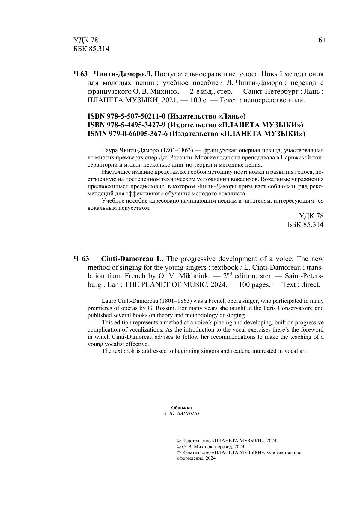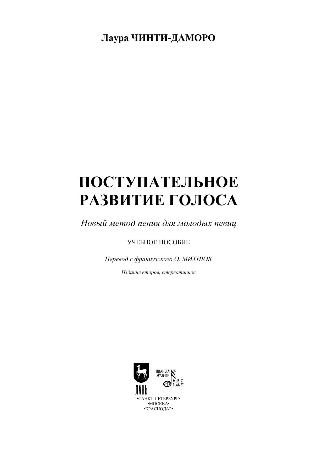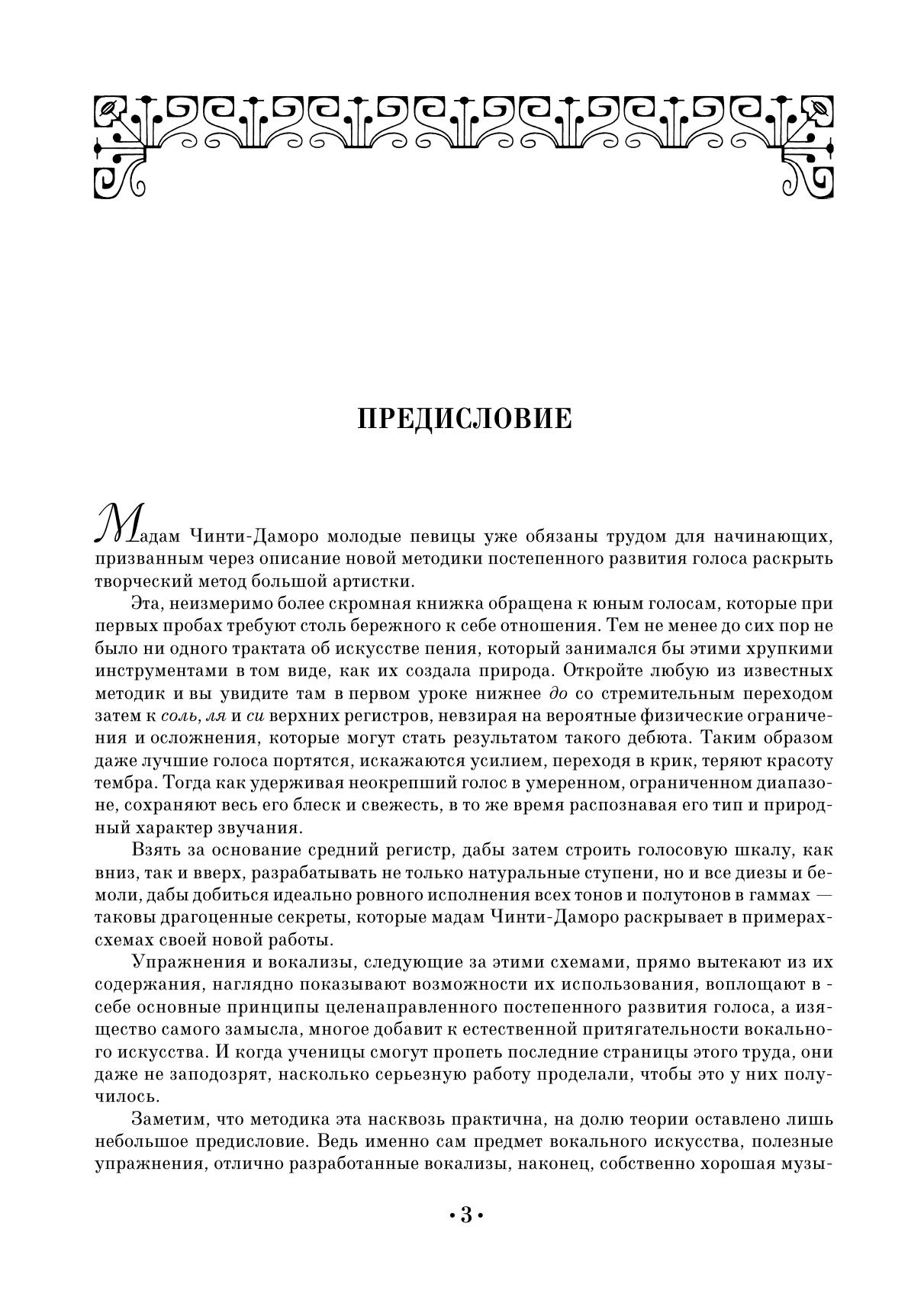 Лаура Чинти-Даморо (1801-1863) – французская оперная певица, участвовавшая во многих премьерах опер Дж. Россини. Многие годы она преподавала в Парижской консерватории и издала несколько книг по теории и методике пения. Настоящее издание представляет собой методику постановки и развития голоса, построенную на постепенном техническом усложнении вокализов. Вокальные упражнения предвосхищает предисловие, в котором Чинти-Даморо призывает соблюдать ряд рекомендаций для эффективного обучения молодого вокалиста. Учебное пособие адресовано начинающим певцам и читателям, интересующимся вокальным искусством.