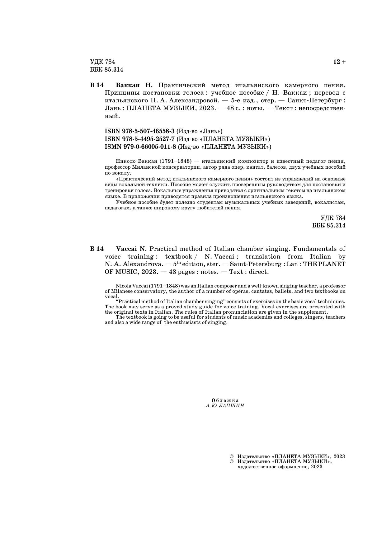 «Практический метод итальянского камерного пения» состоит из упражнений на основные виды вокальной техники. Пособие может служить проверенным руководством для постановки и тренировки голоса. Вокальные упражнения приводятся с оригинальным текстом на итальянском языке. В приложении приводятся правила произношения итальянского языка.