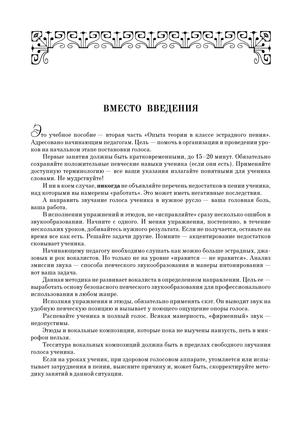 Это учебное пособие – продолжение «Опыта теории вокальной педагогики в классе эстрадного пения». Цель – помочь в организации и проведении уроков на начальном этапе постановки голоса, выработать основу безопасного певческого звукообразования для профессионального использования в любом жанре.