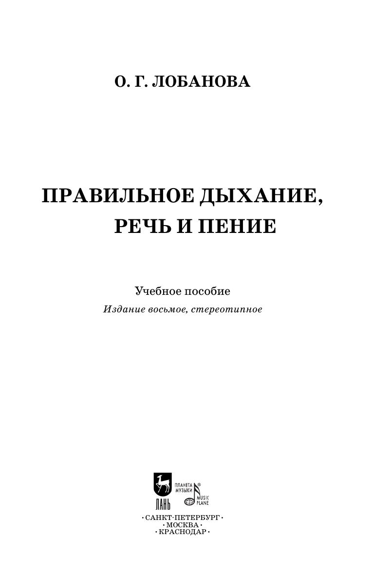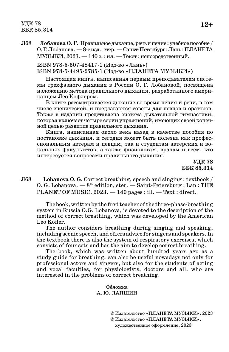 Настоящая книга, написанная первым преподавателем системы трехфазного дыхания в России О. Г. Лобановой, посвящена изложению метода правильного дыхания, разработанного американцем Лео Кофлером. В книге рассматривается дыхание во время пения и речи, в том числе сценической, и предлагаются советы для певцов и ораторов. Также в издании представлена система дыхательной гимнастики, которая включает четыре серии упражнений, имеющих своей конечной целью развитие правильного дыхания. Книга, написанная около века назад в качестве пособия по постановке дыхания и сегодня может быть полезна как профессиональным актерам и певцам, так и студентам актерских и вокальных факультетов, а также физиологам, врачам и всем, кто интересуется вопросами правильного дыхания. The book, written by the first teacher of the three-phase-breathing system in Russia O.G. Lobanova, is devoted to the description of the method of correct breathing, which was developed by the American Leo Kofler. The author considers breathing during singing and speaking, including scenic speech, and offers advice for singers and speakers. In the textbook there is also the system of respiratory exercises, which consists of four sets and has the aim to develop correct breathing. The book, which was written about hundred years ago as a study guide for breathing, can also be useful nowadays not only for professional actors and singers, but also for the students of acting and vocal faculties, for physiologists, doctors and all, who are interested in the problems of correct breathing.